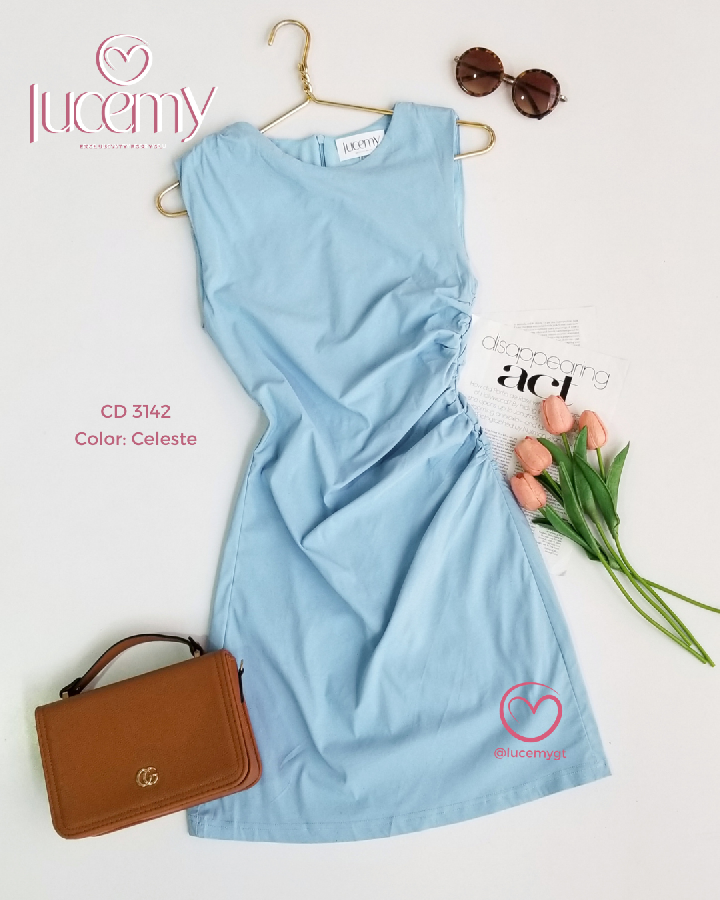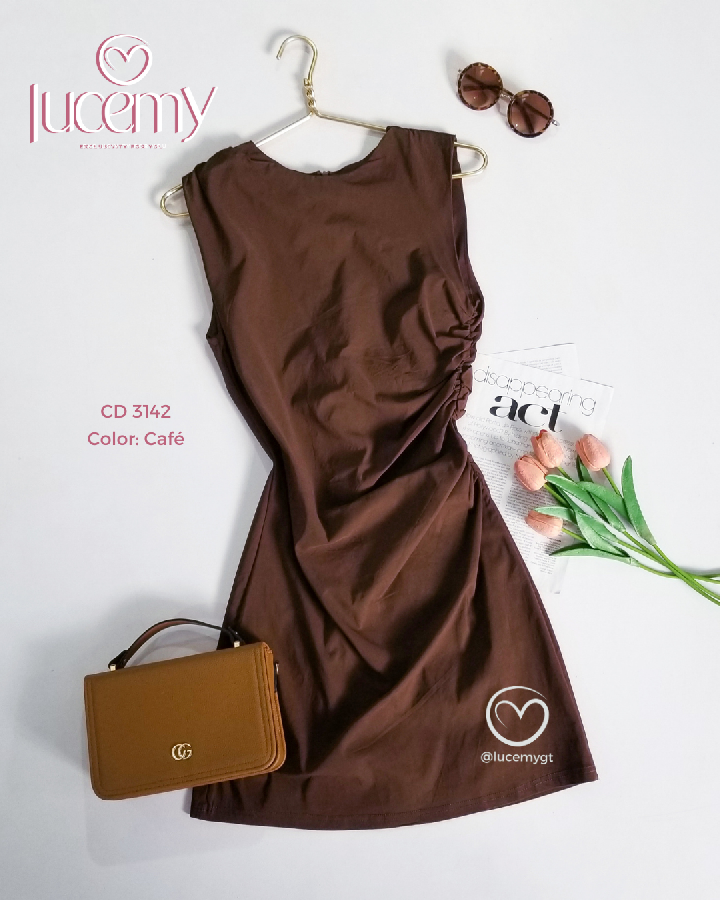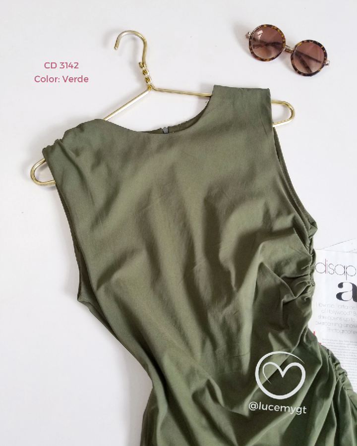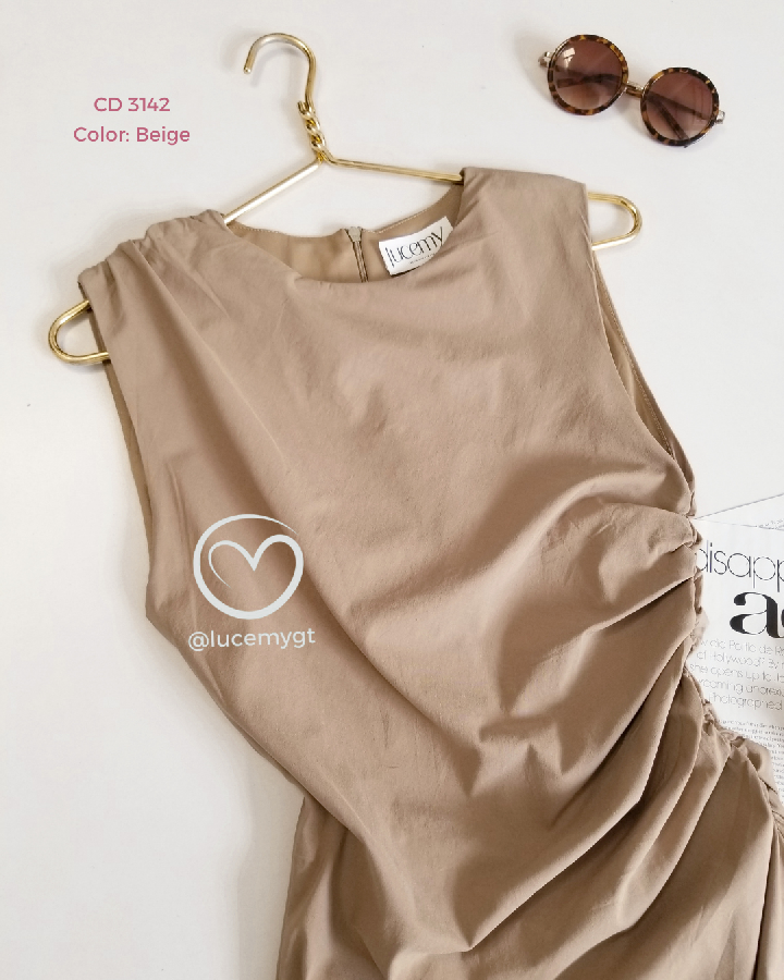 Descripción: Vestido moderno y femenino, diseñado con un elegante fruncido en un costado de la cintura que estiliza la silueta. Presenta un detalle de fruncido en una de las mangas, aportando un toque asimétrico y original. Su diseño es sin mangas, con cremallera invisible en la parte trasera que asegura un acabado limpio y sofisticado. Además, cuenta con forro interno en la parte inferior, garantizando comodi