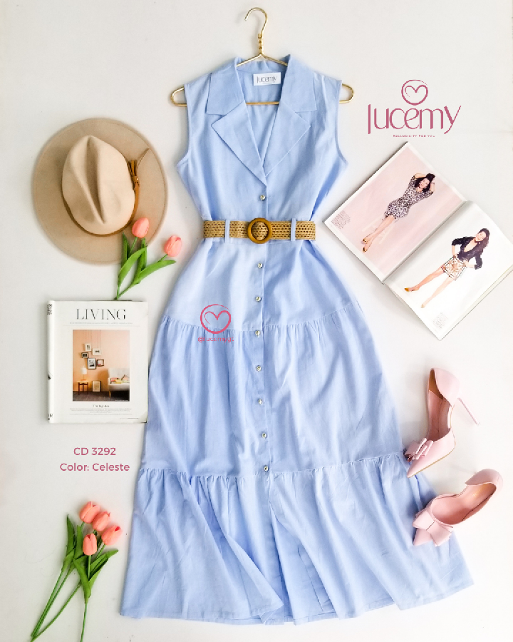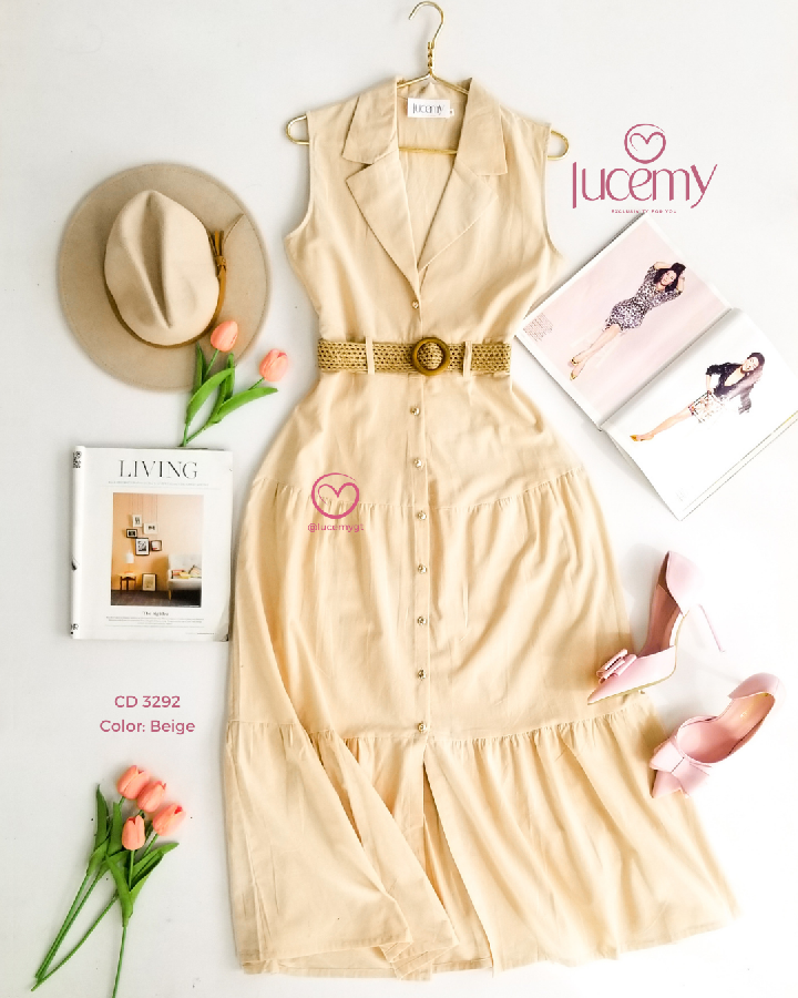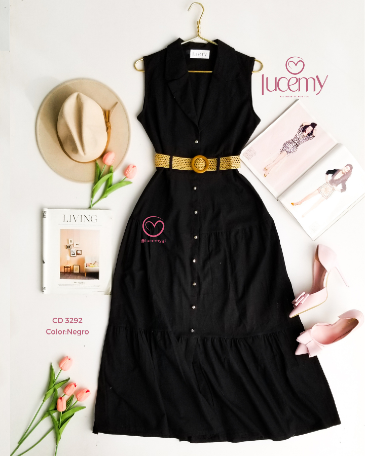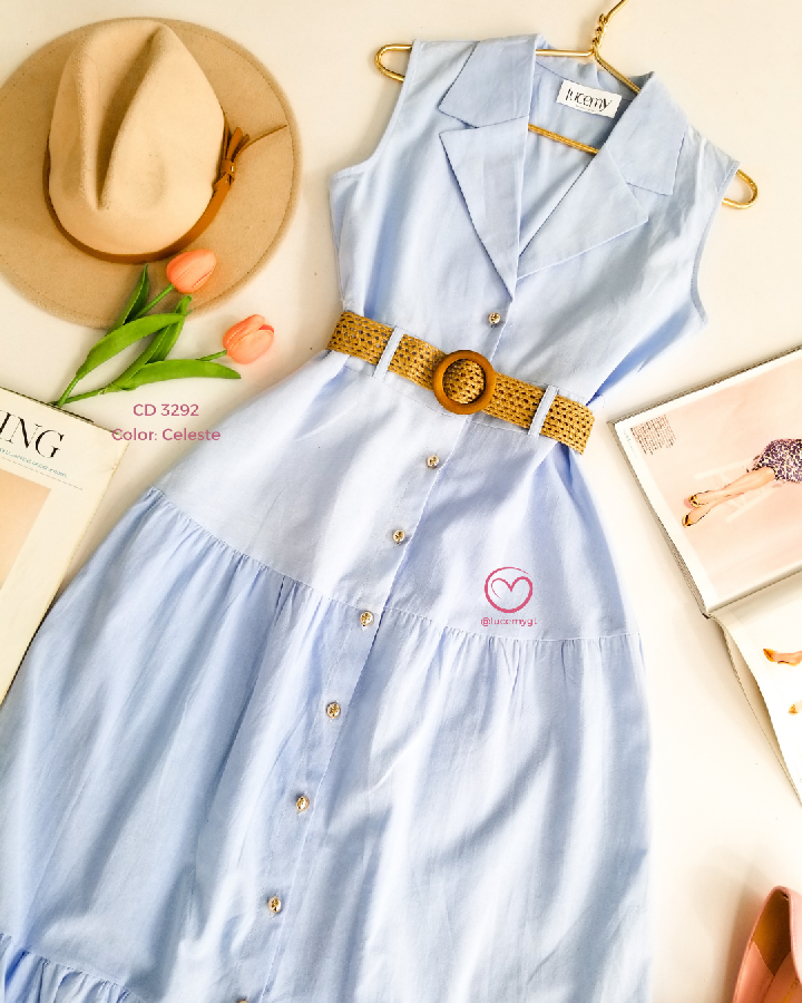 Descripción: cuello camisero, sin mangas, botones en la parte enfrente, cincho para ajustar a la cintura.
