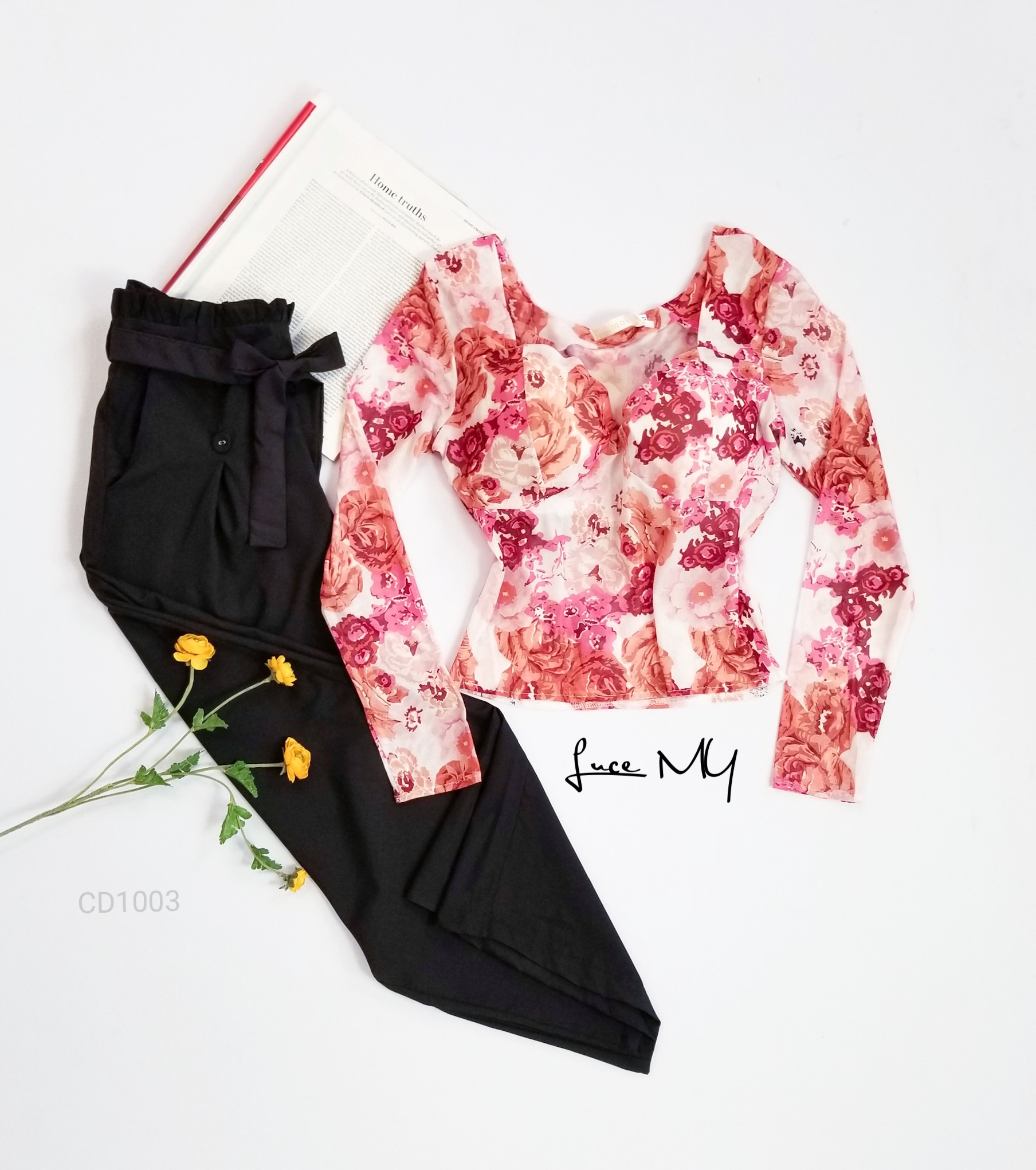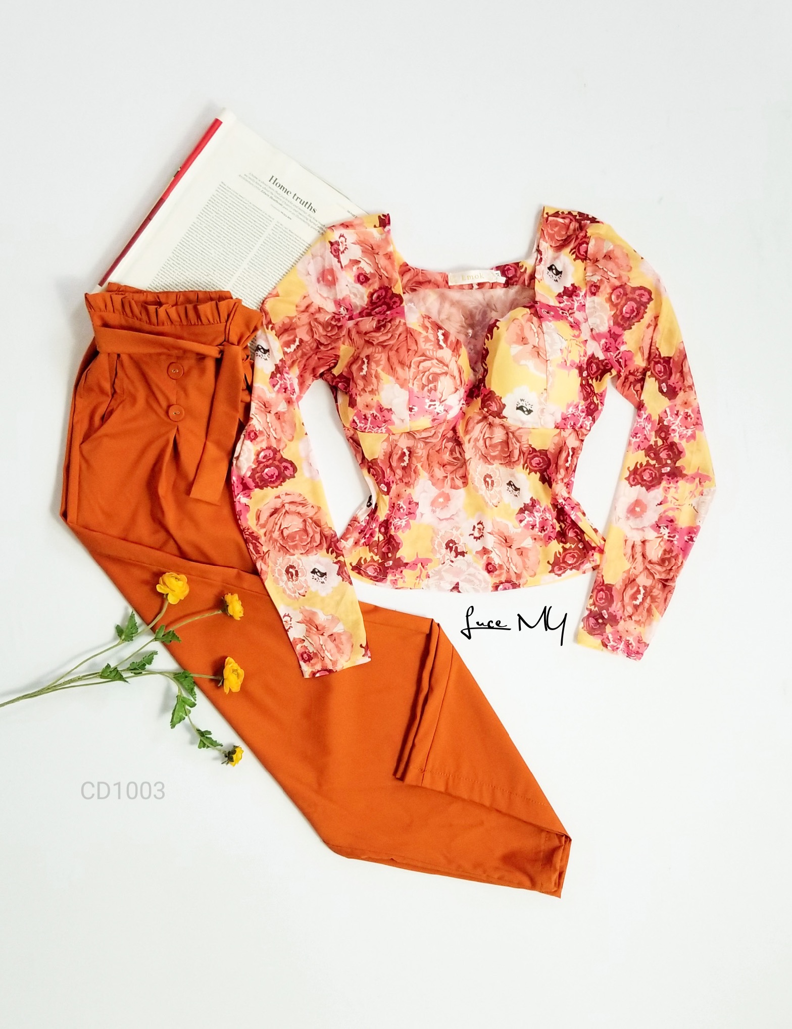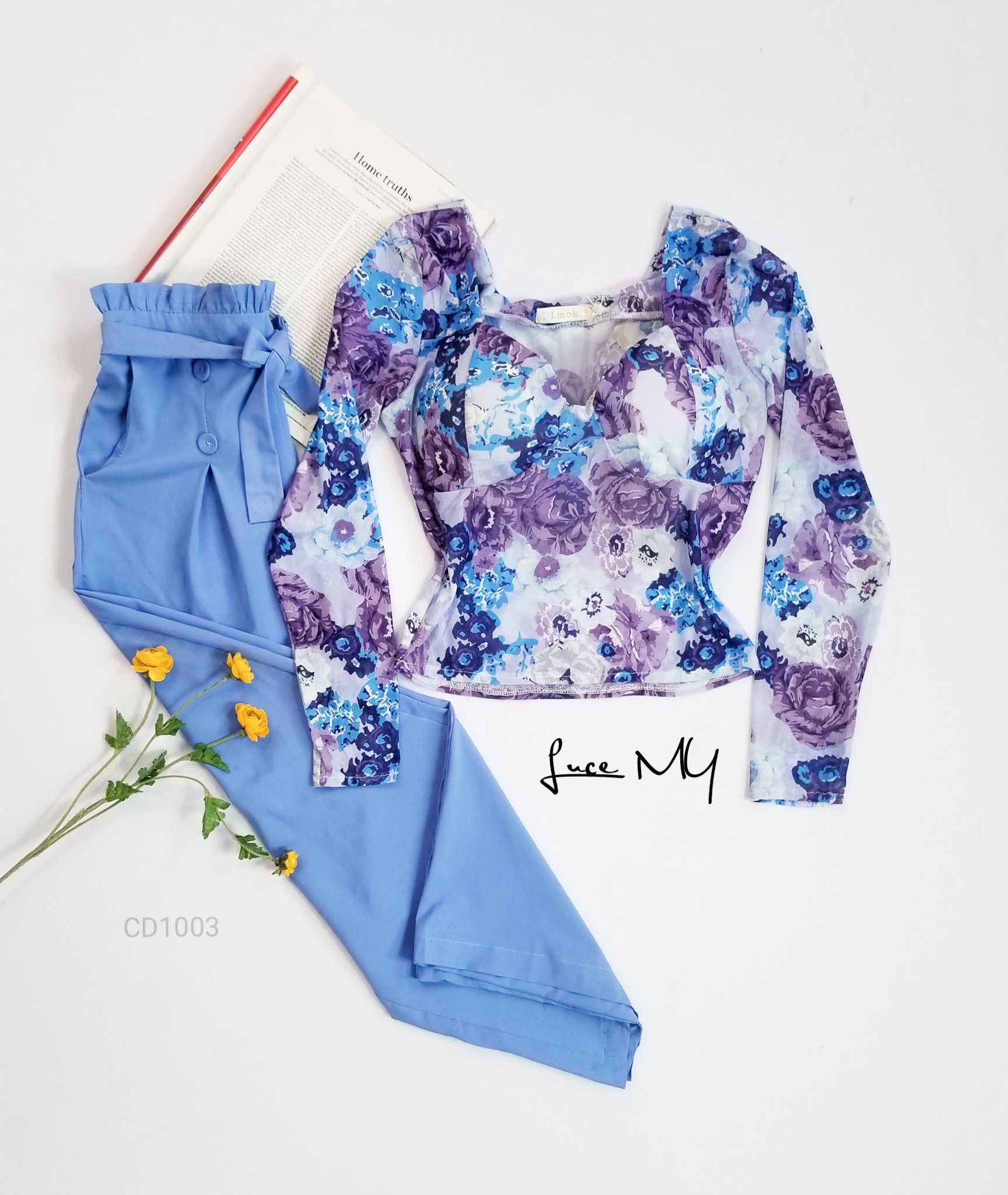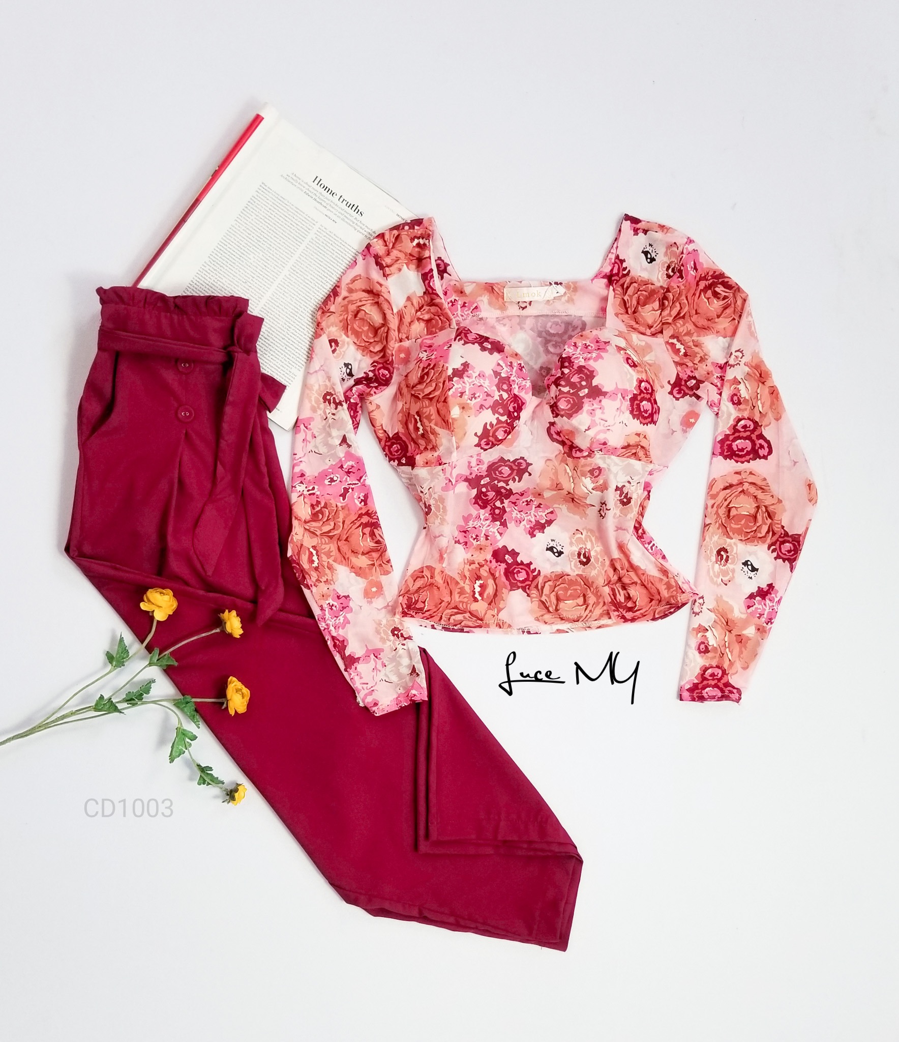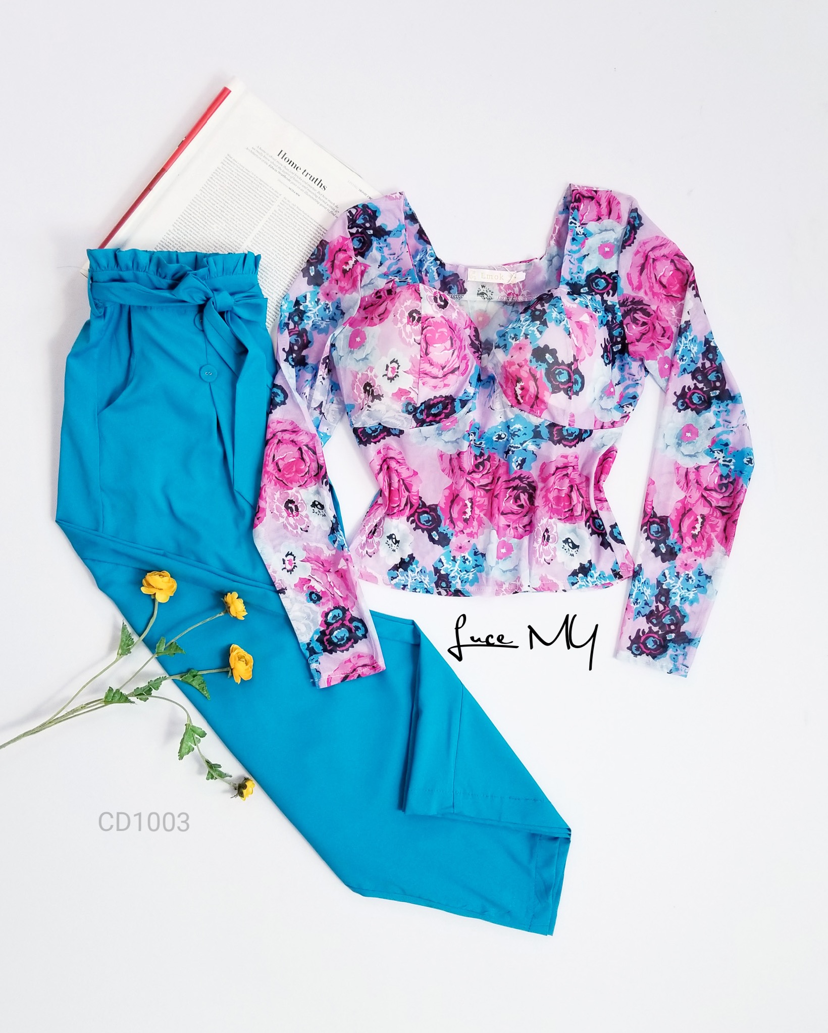 Descripción: Blusa Teddy Floral, escote corazón, manga larga; Pantalón Palazo, cintura alta, con botones al frente, incluye su cincho de te la misma tela