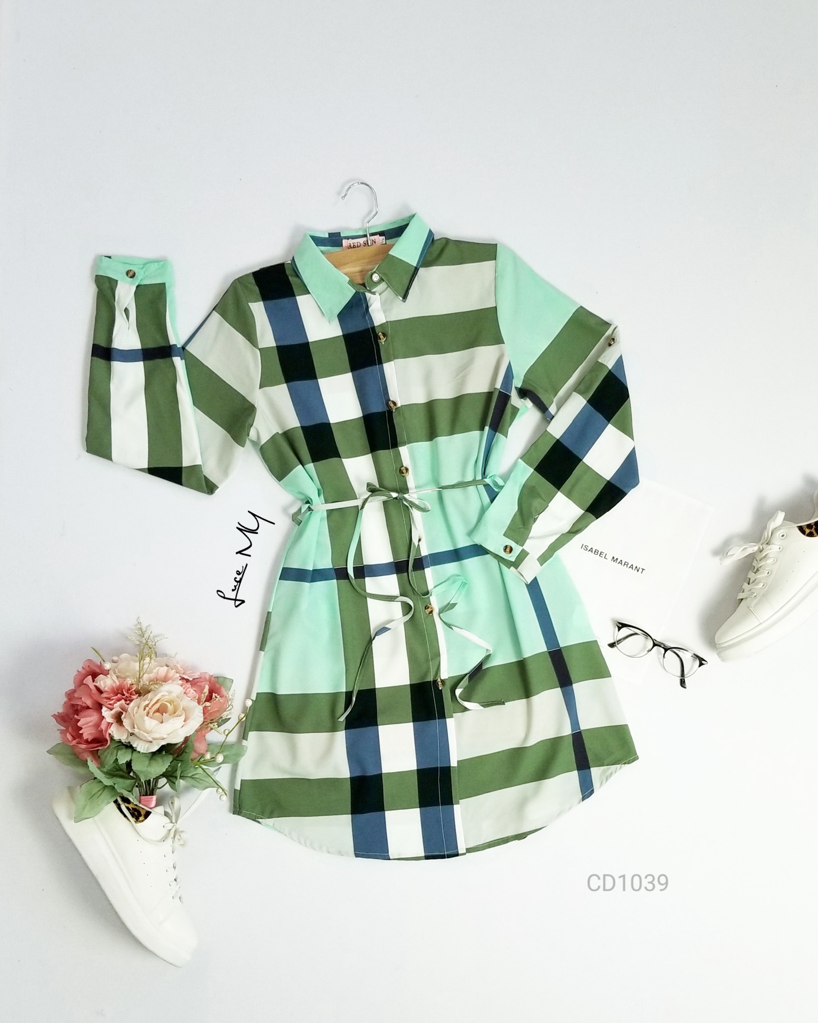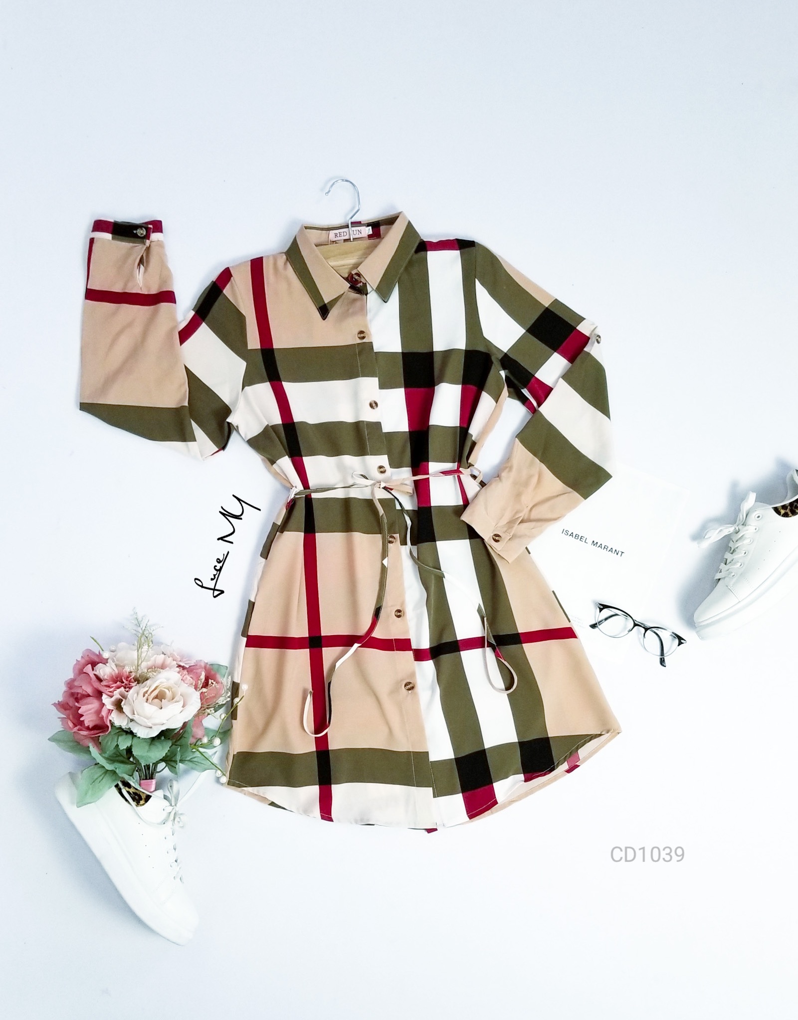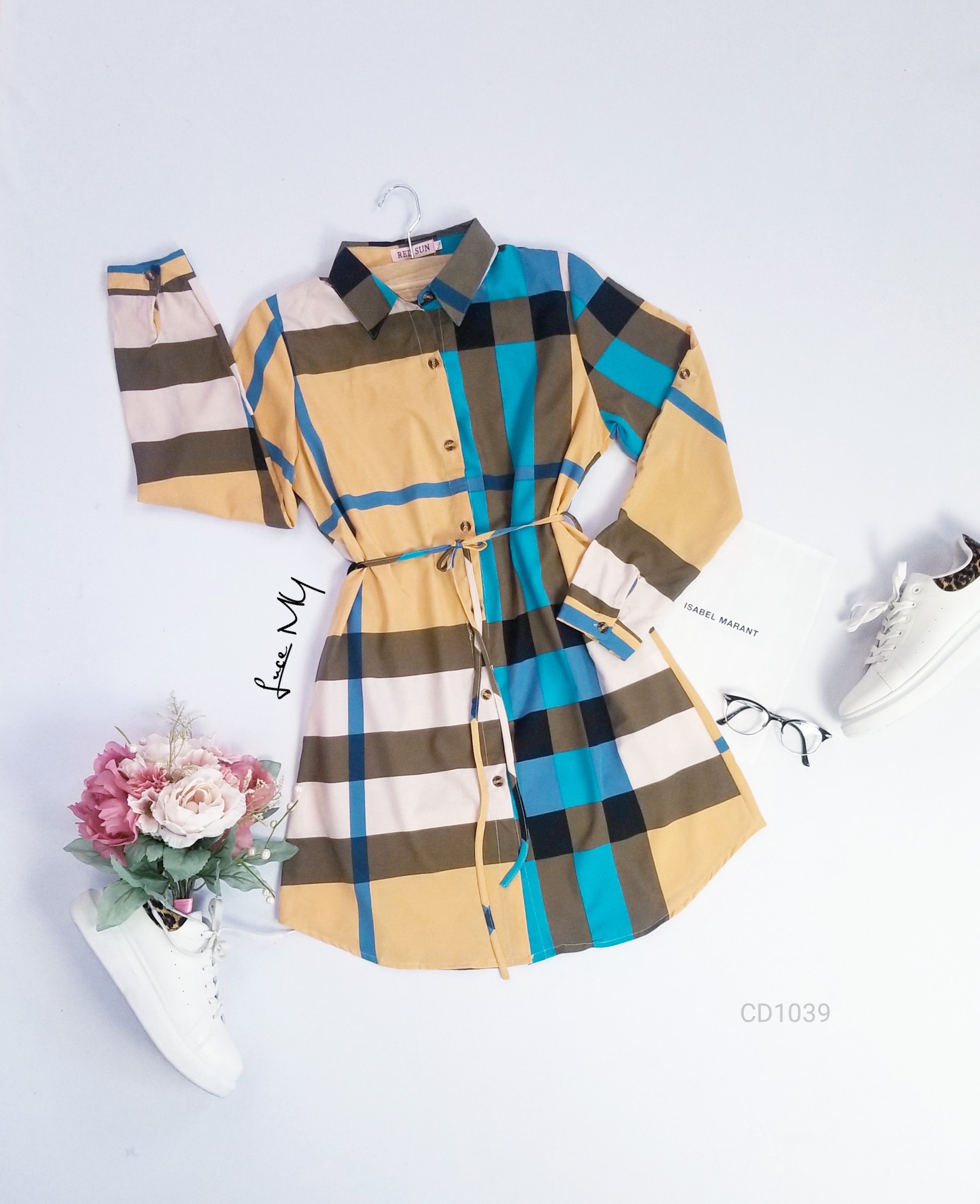 Descripción: Vestido Camisero a cuadros, botones en la parte de enfrente, tiene agujeta ajustable en la cintura
