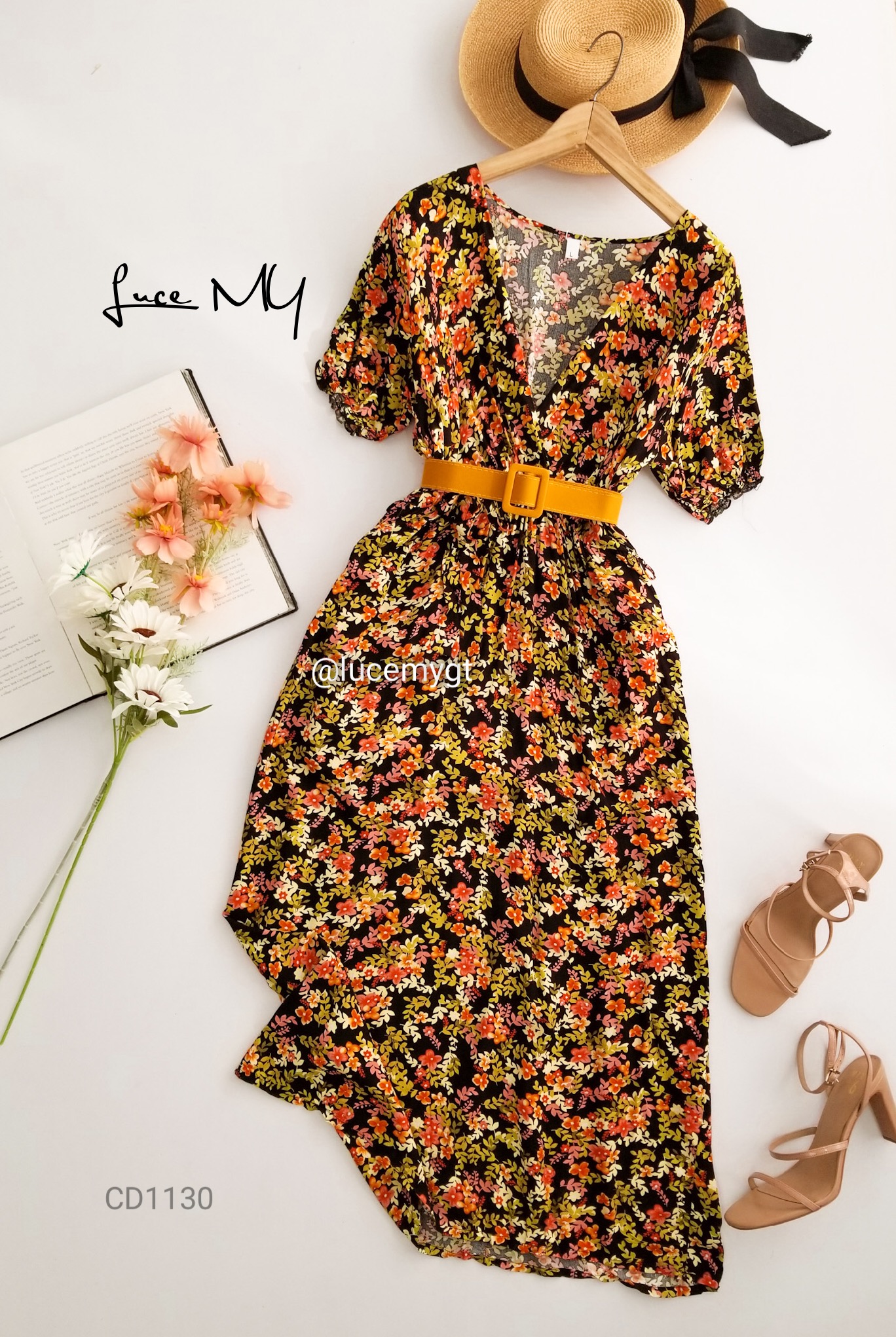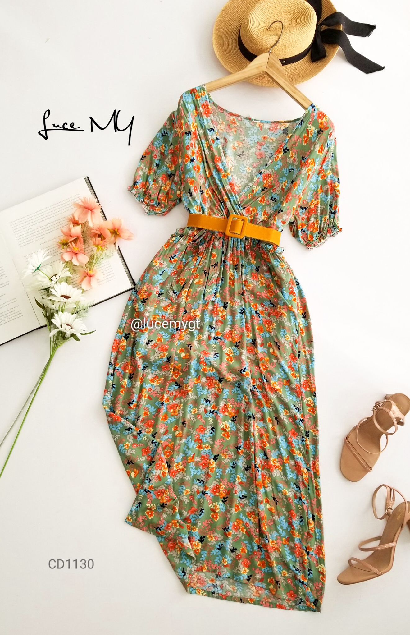 Descripción: Maxi Vestido Floral, cuello V traslape, manga corta, elástico en la cintura, incluye su cincho de la misma tela. Promoción si llevas dos vestidos a solo por Q200.00