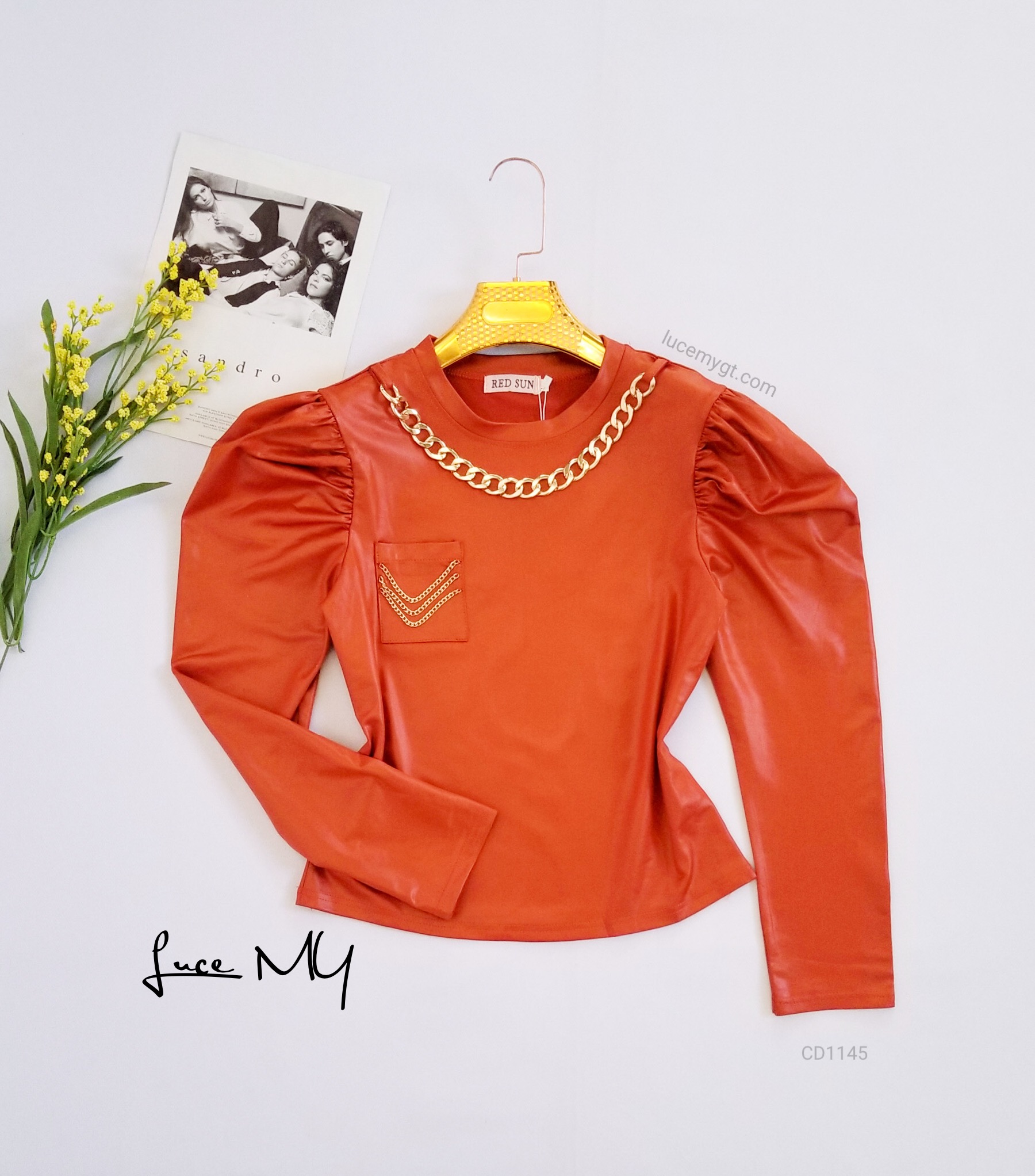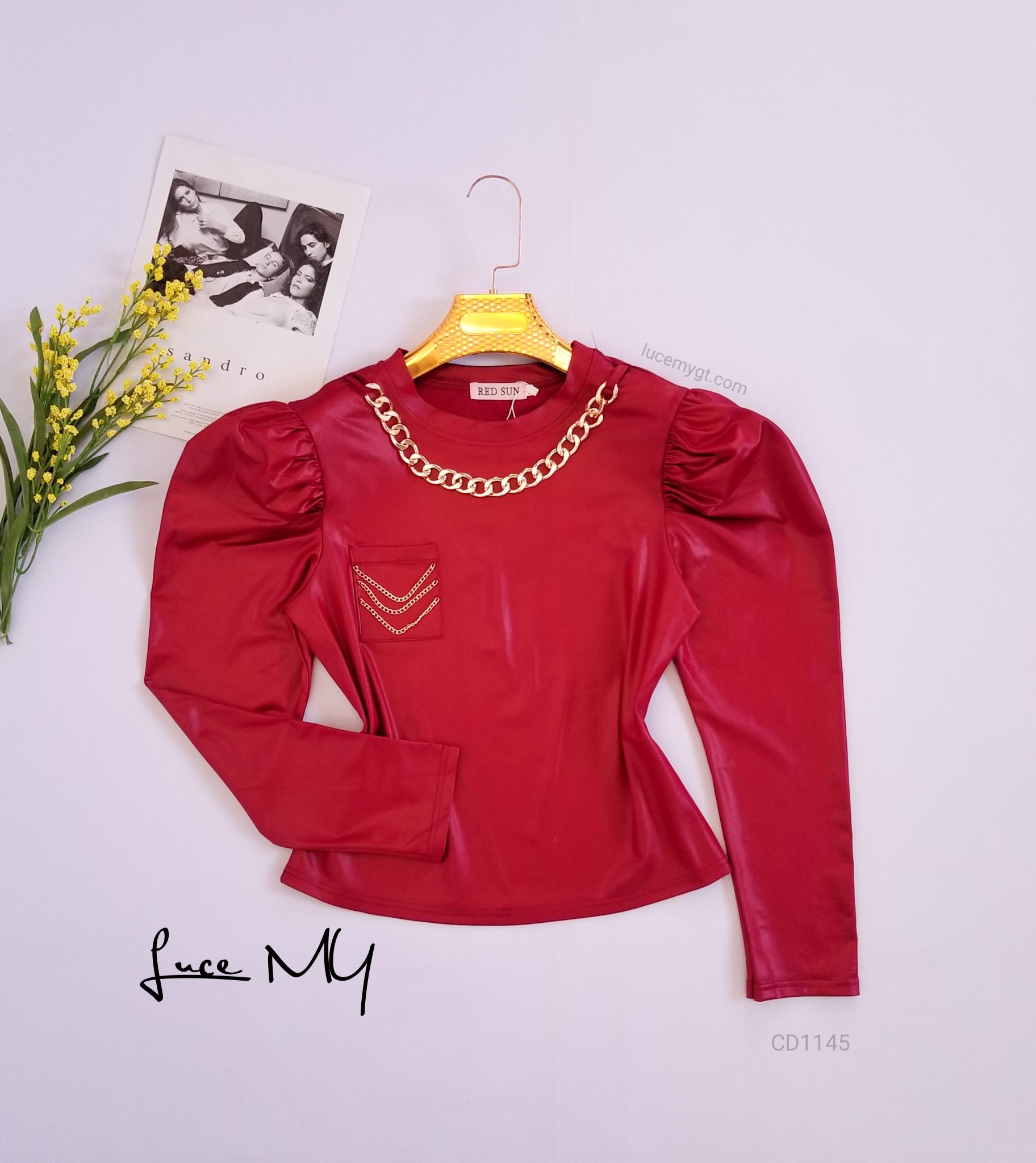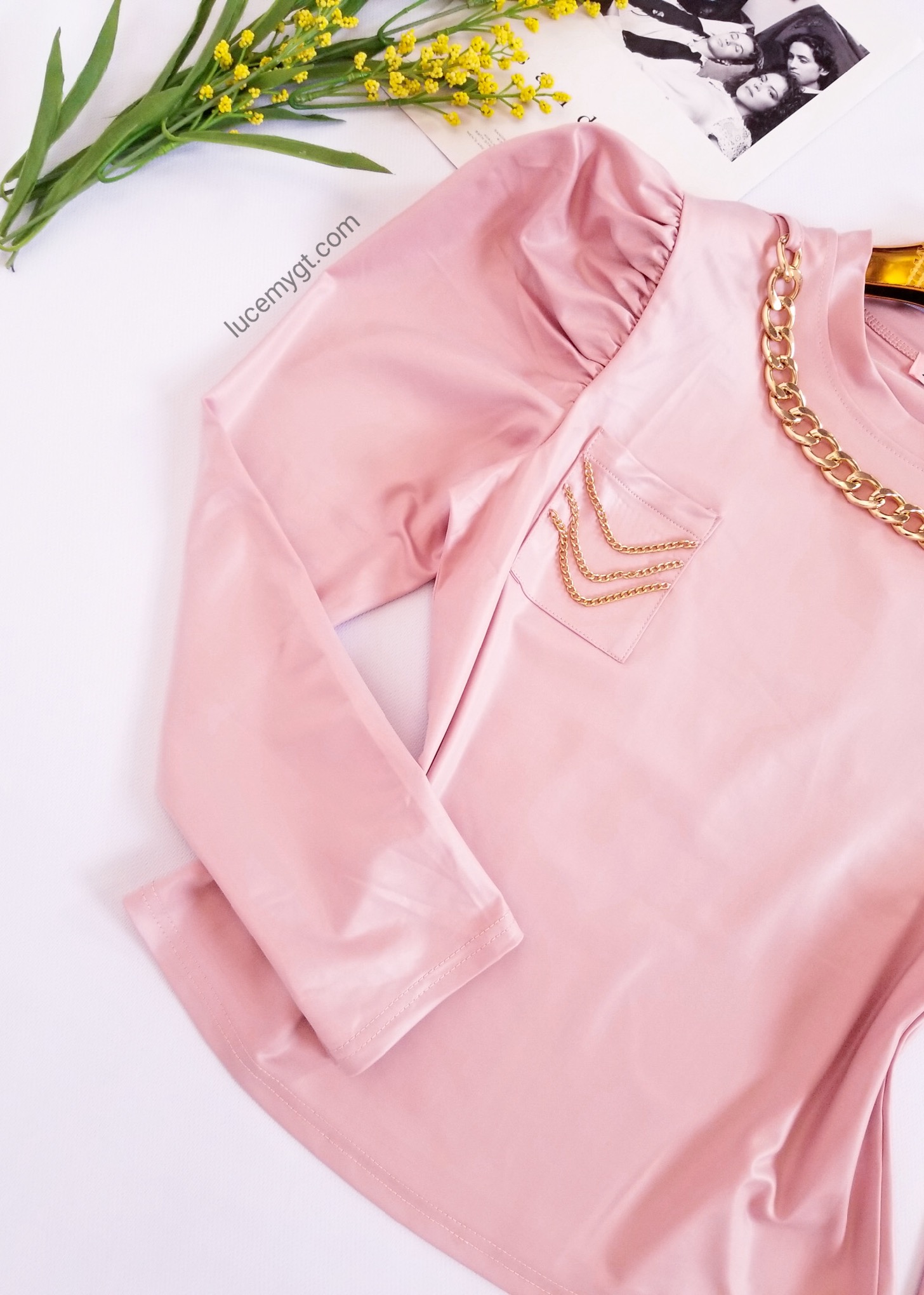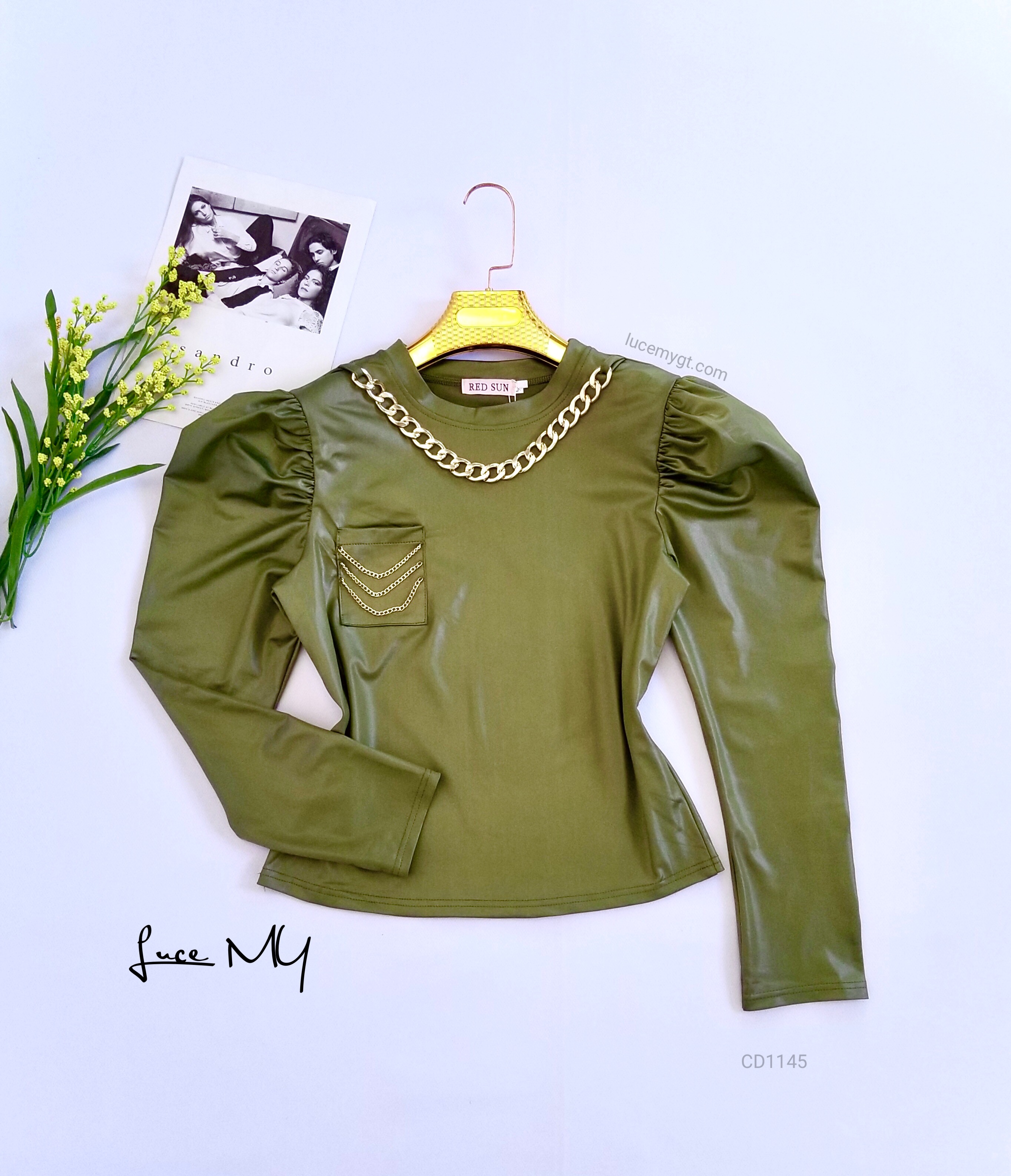 Descripción: Blusa Cadena, cuello redondo, manga larga y puff, bolsillo en la parte de enfrente con cadenitas. Promoción 2xQ185.00