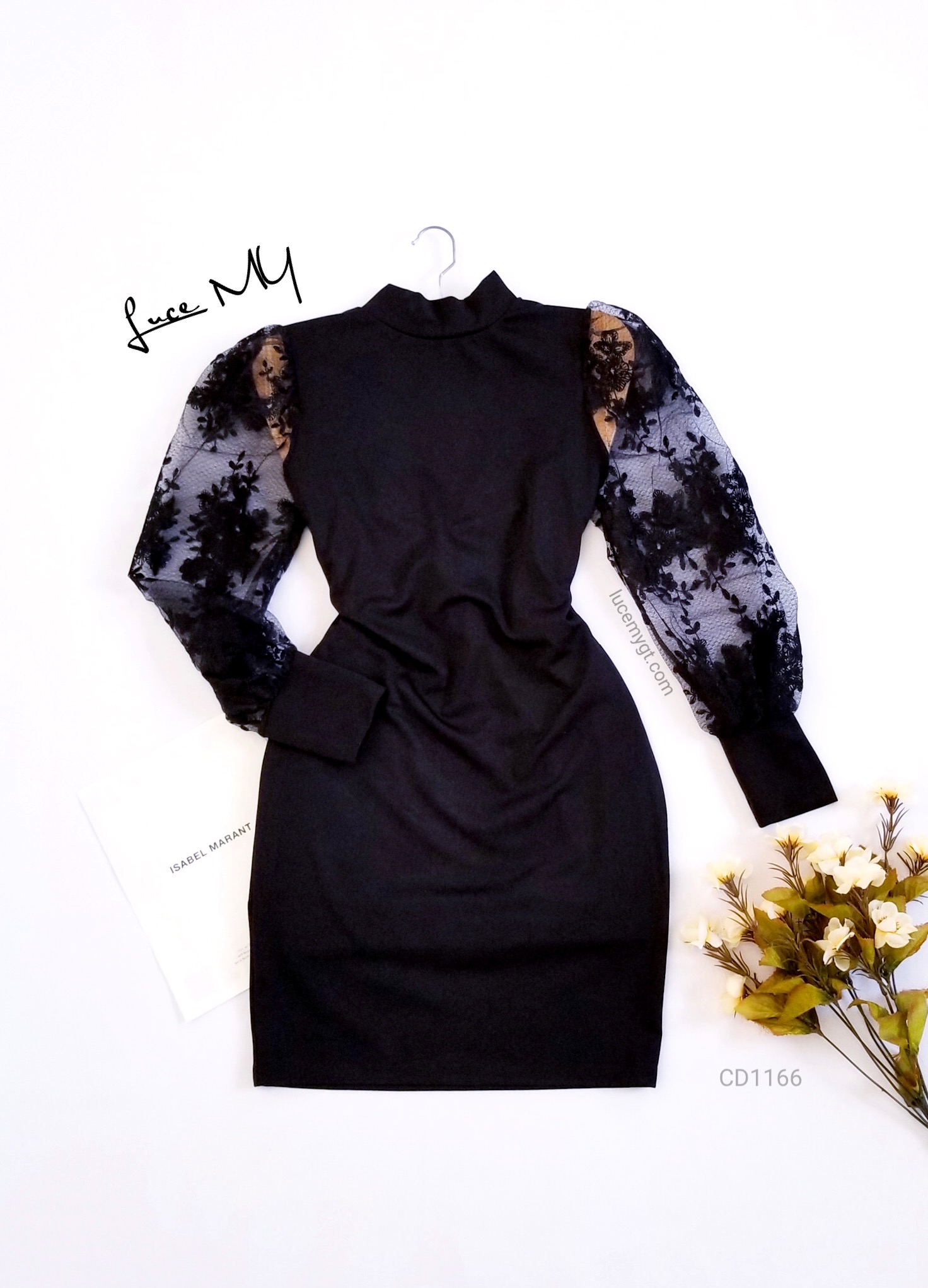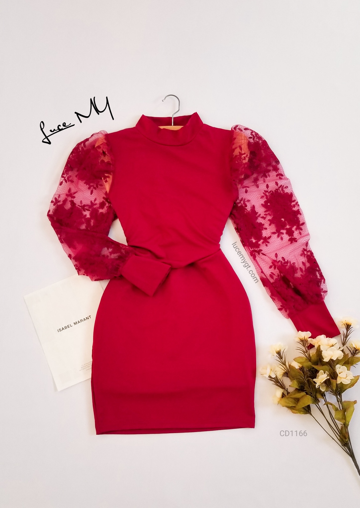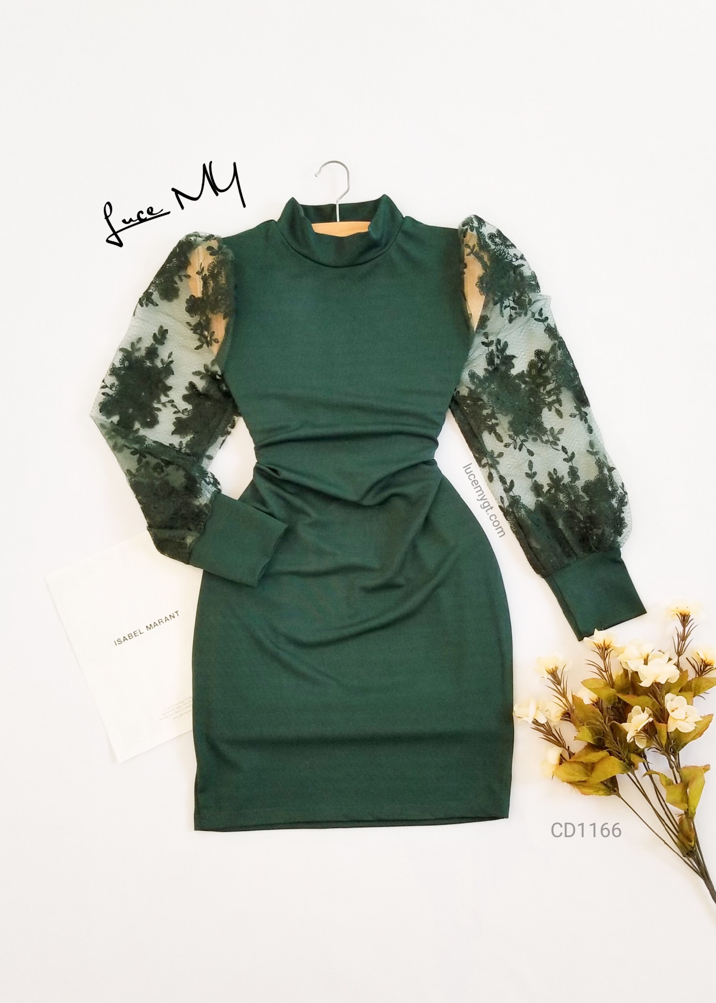 Descripción: Vestido Tallado, cuello semi alto, mangas de obispo y malla jacquard floral