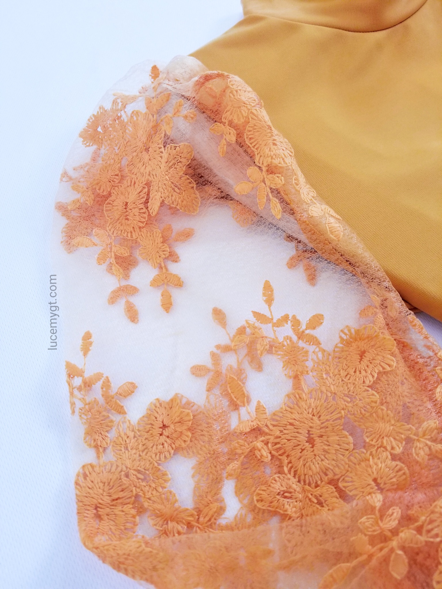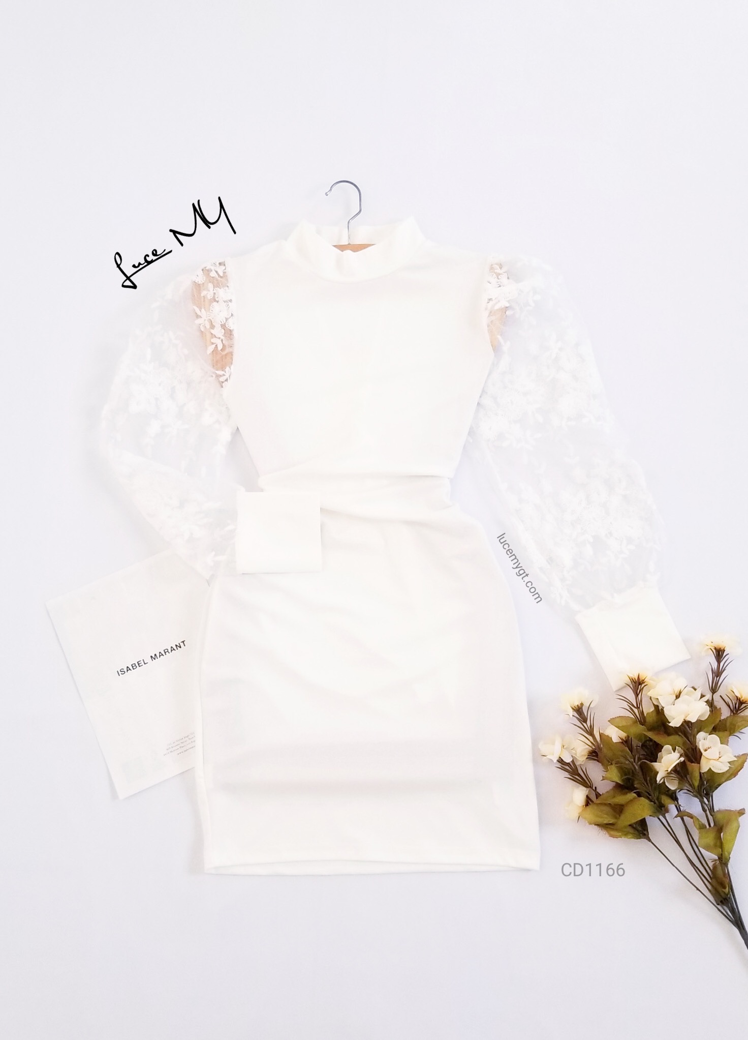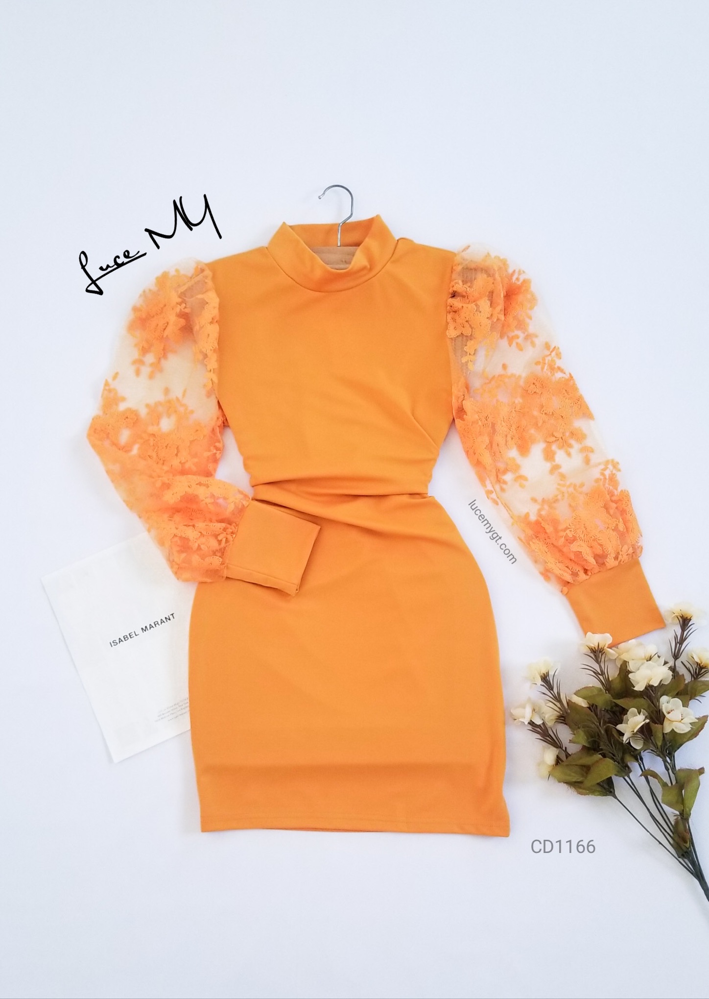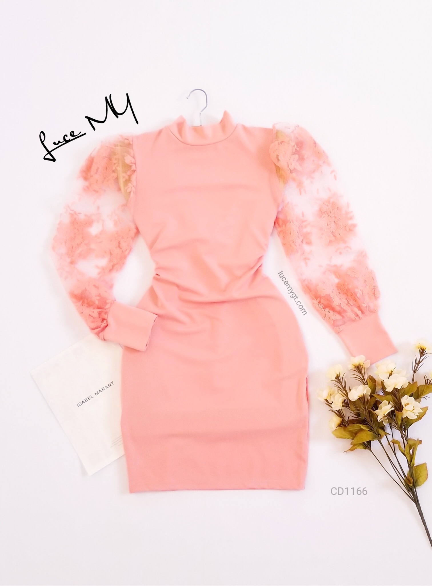 Descripción: Vestido Tallado, cuello semi alto, mangas de obispo y malla jacquard floral