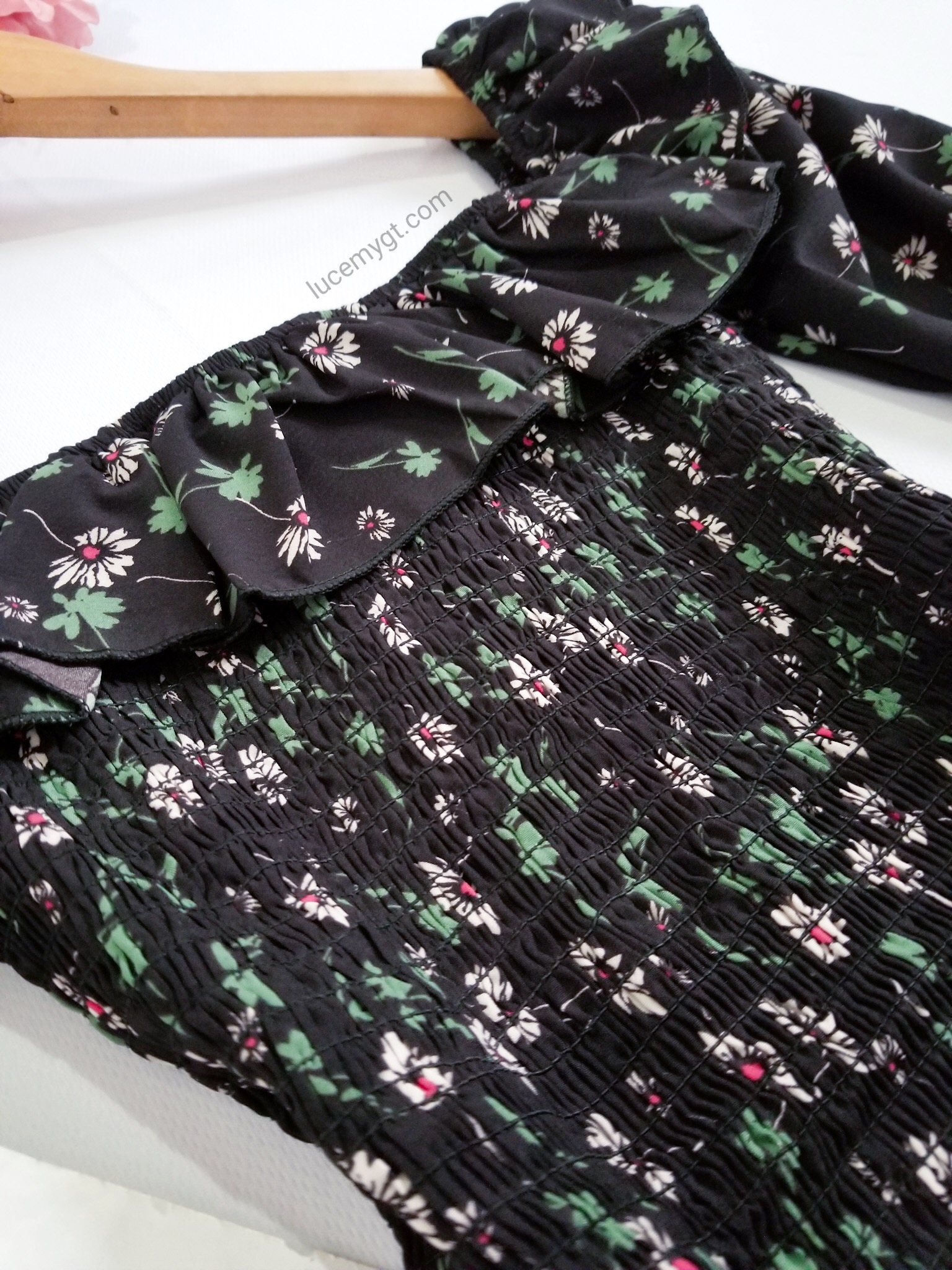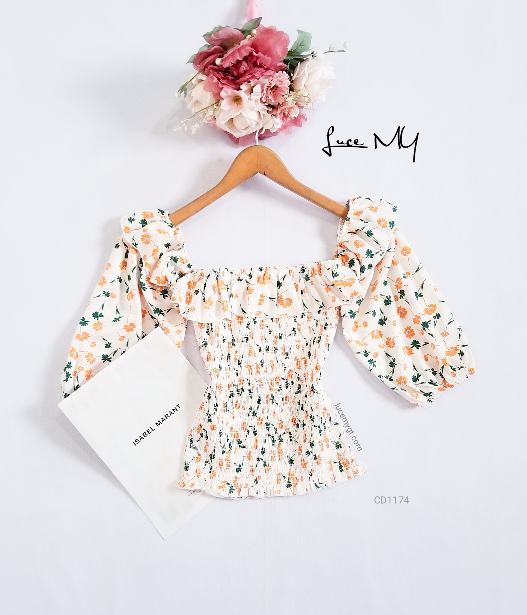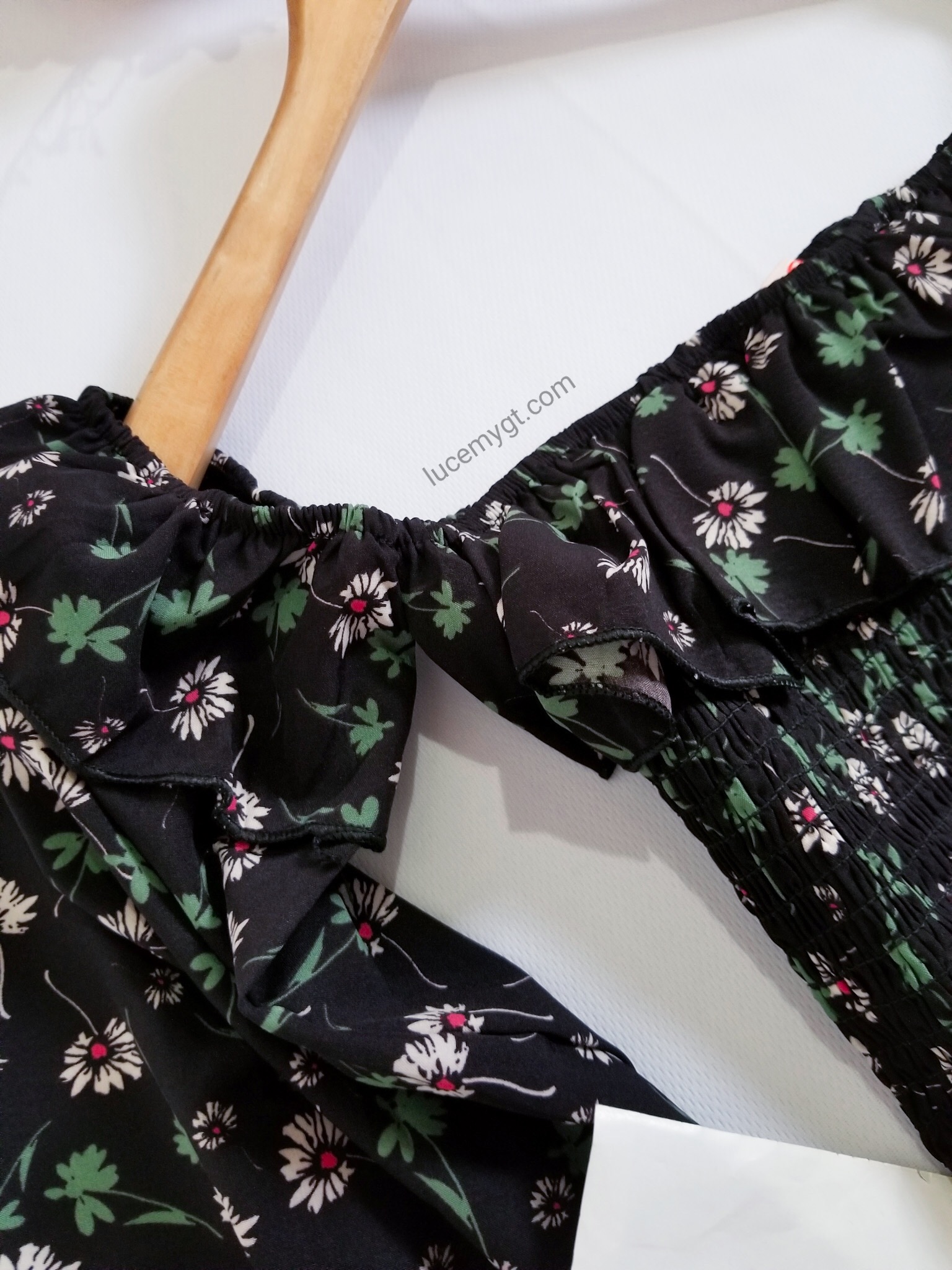 Descripción: Blusa Floral fruncida, escote cuadrado, mangas de farol, vuelito en la parte de arriba