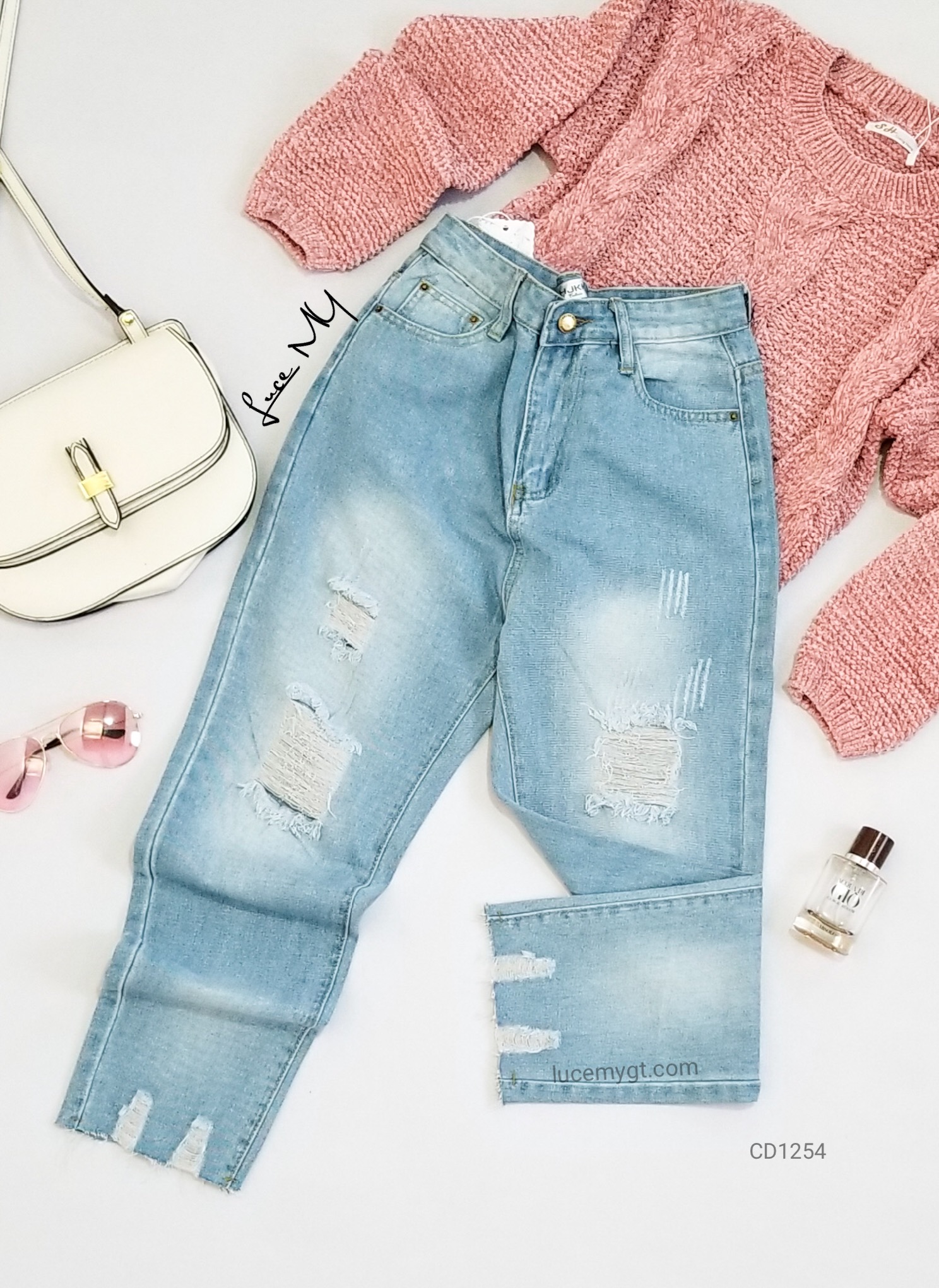 Descripción: Pantalón Mom Jeans, cintura alta, botón en la parte de enfrente, estilo desgastado muy Fashions.