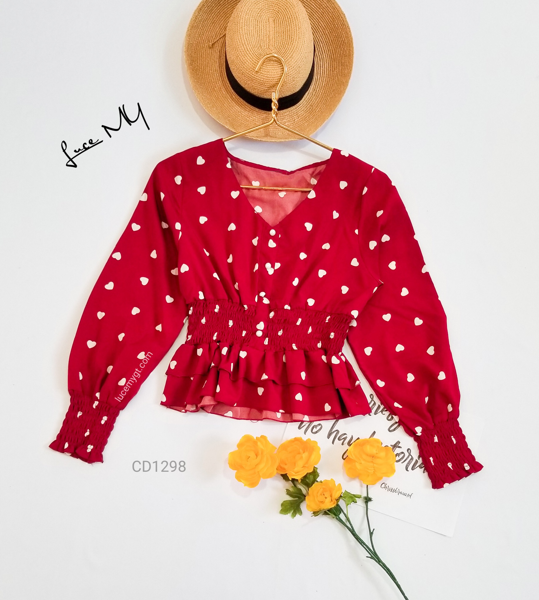 Descripción: Blusa Corazones, cuello V medio profundo, manga larga, cintura y muñecas son fruncidas, en la parte de abajo tiene doble vuelito. Promoción si llevas dos blusas a solo por Q185.00
