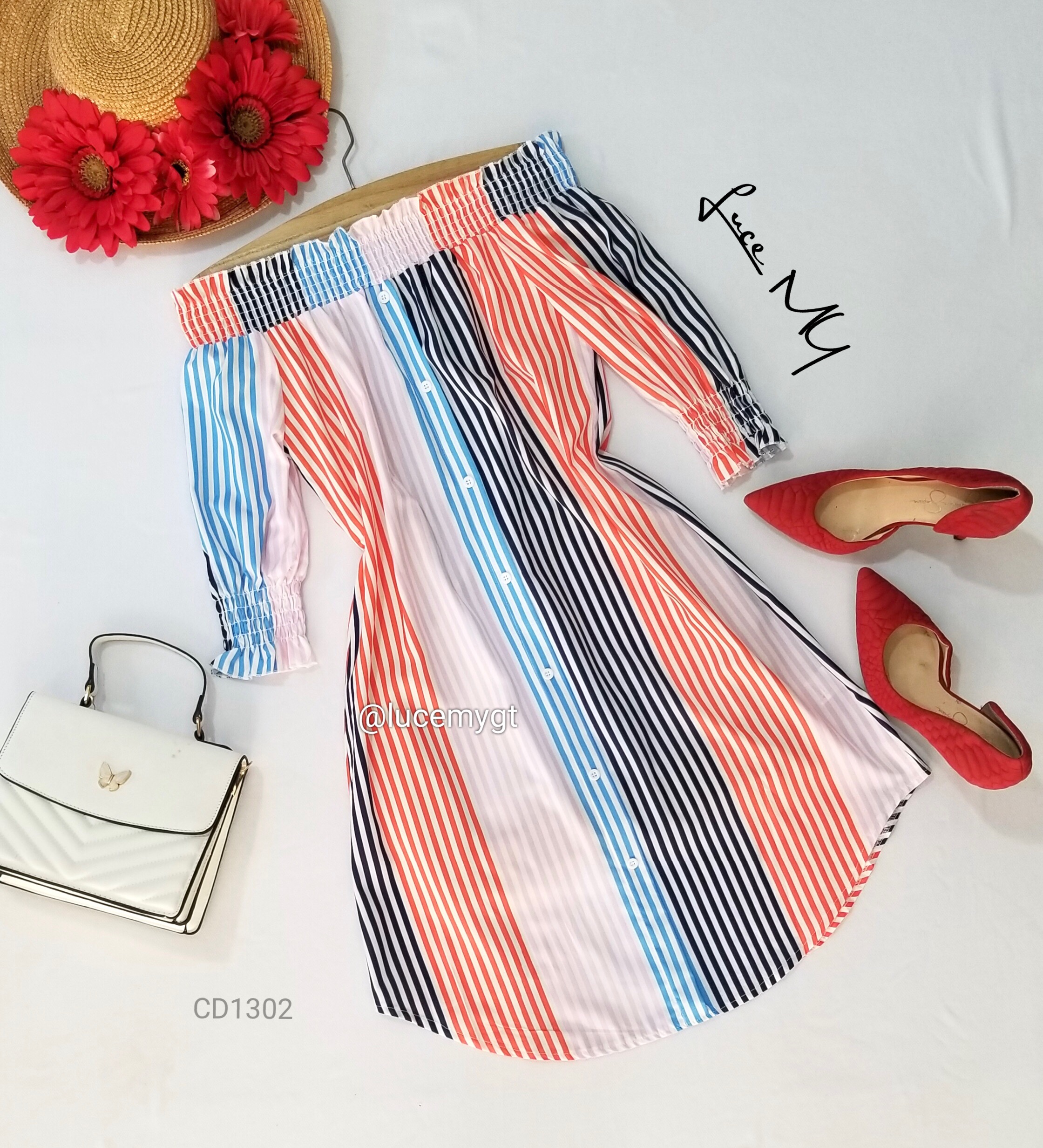 Descripción: Vestido Off Shoulder Líneas, fruncido en la parte de arriba, manga corta fruncida, botones en la parte de arriba. Promoción si llevas dos vestidos a solo dos por Q185.00