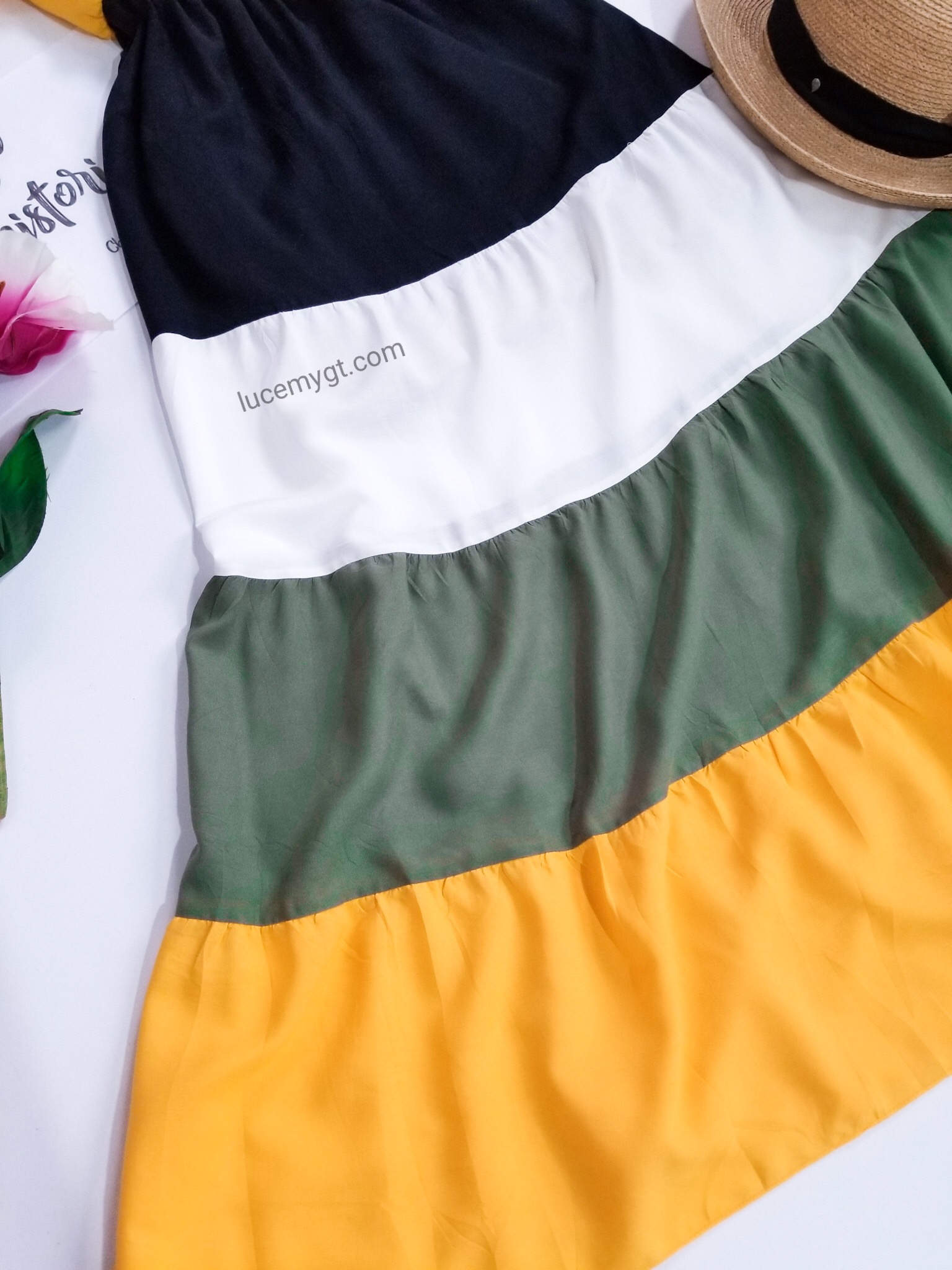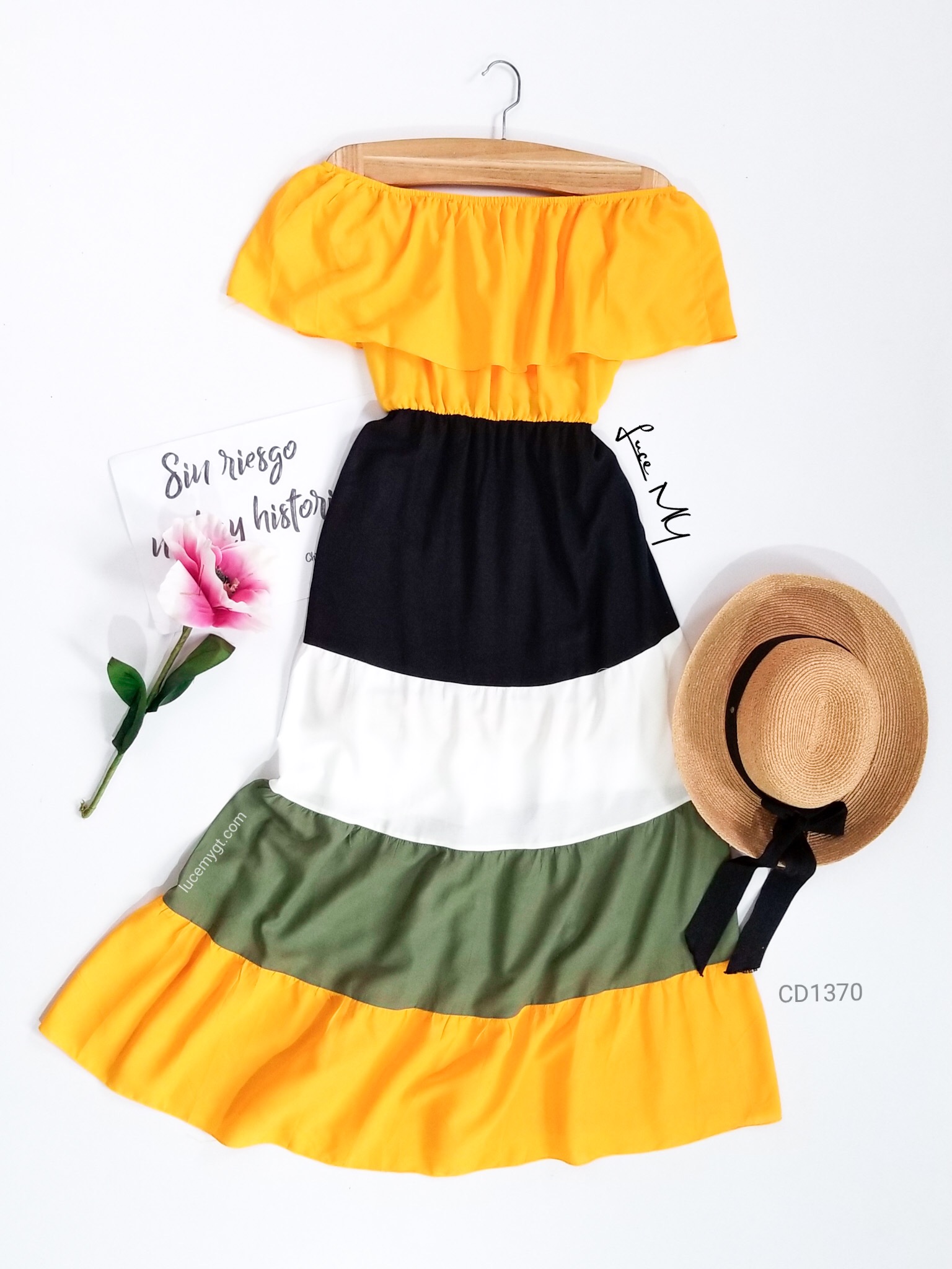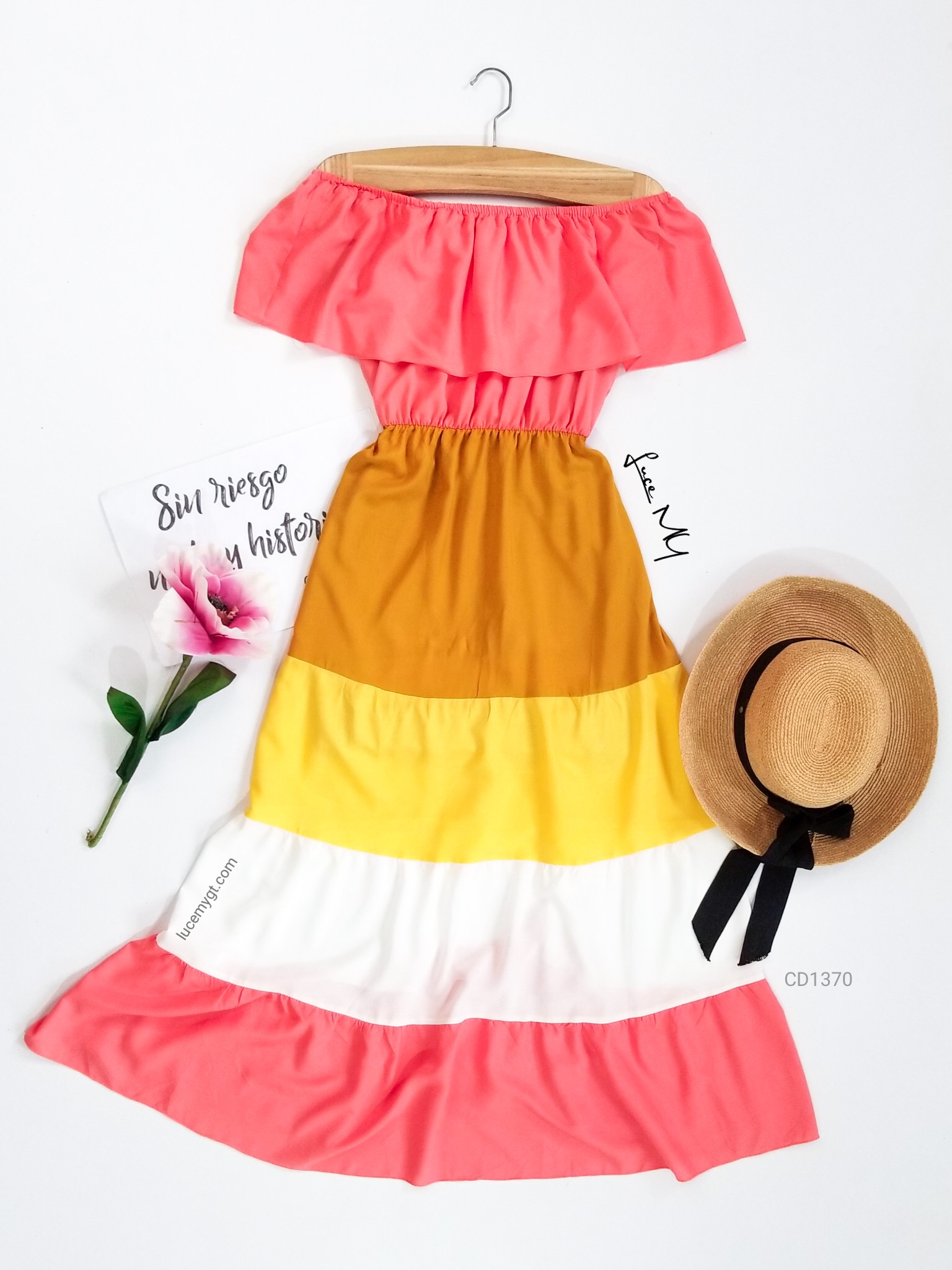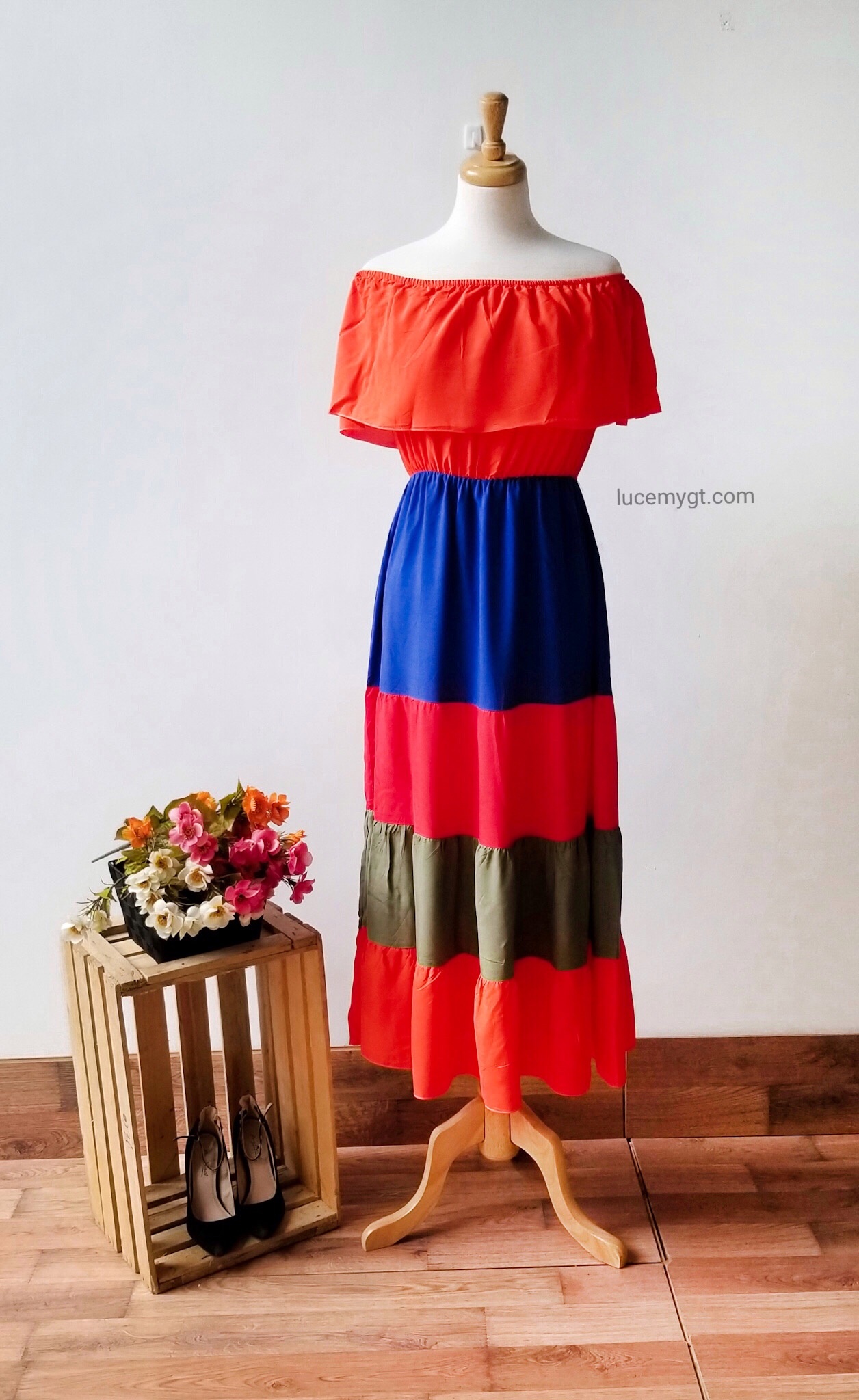 Descripción: Vestido campesino, hombros descubiertos, multicolor, muy cómodo de usar