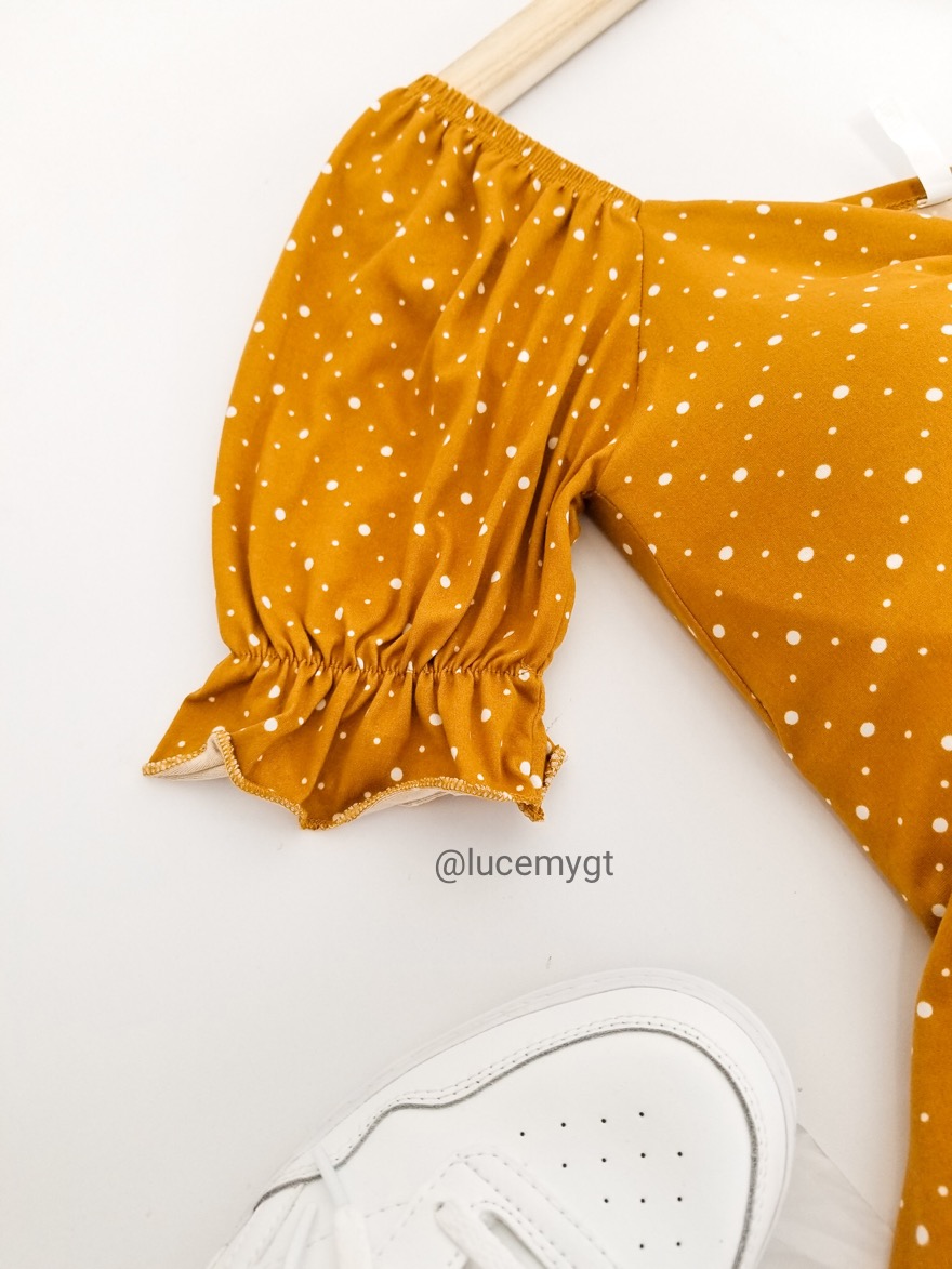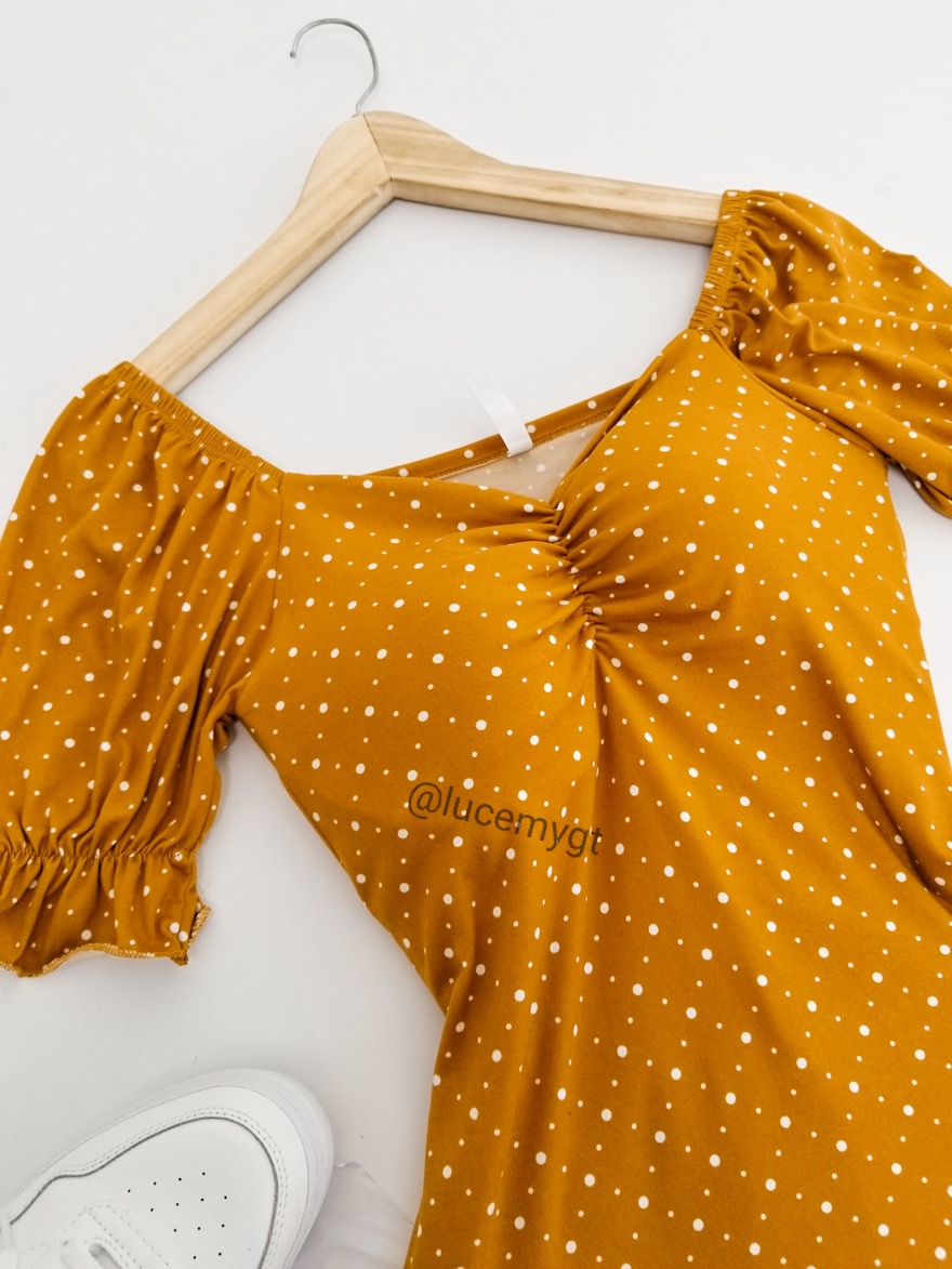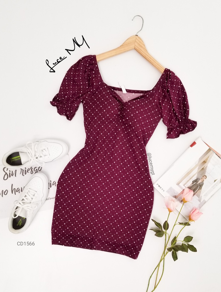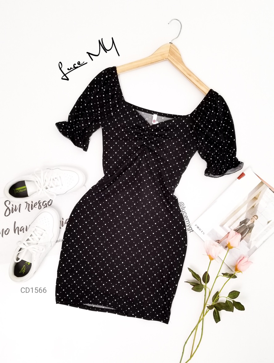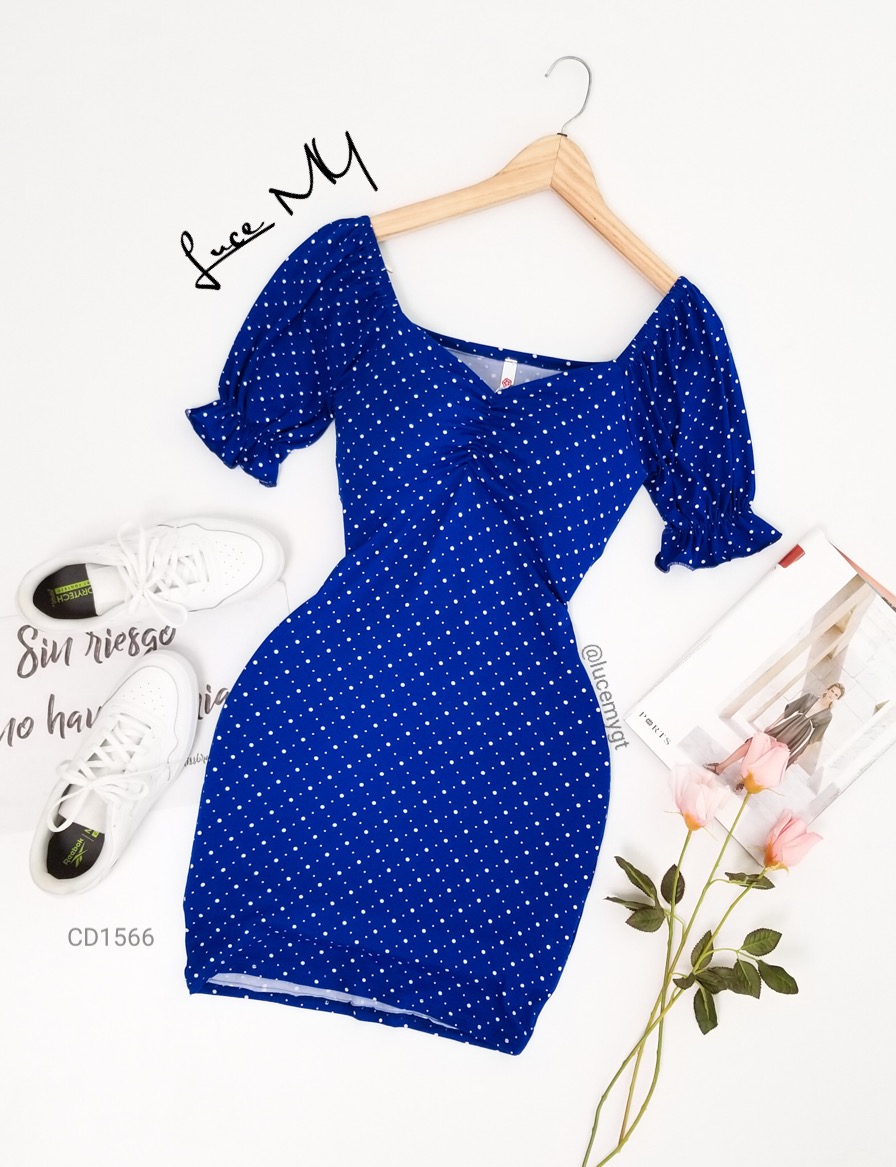 Descripción: Vestido de Puntos, escote corazón, manga corta, tallado muy como de usar