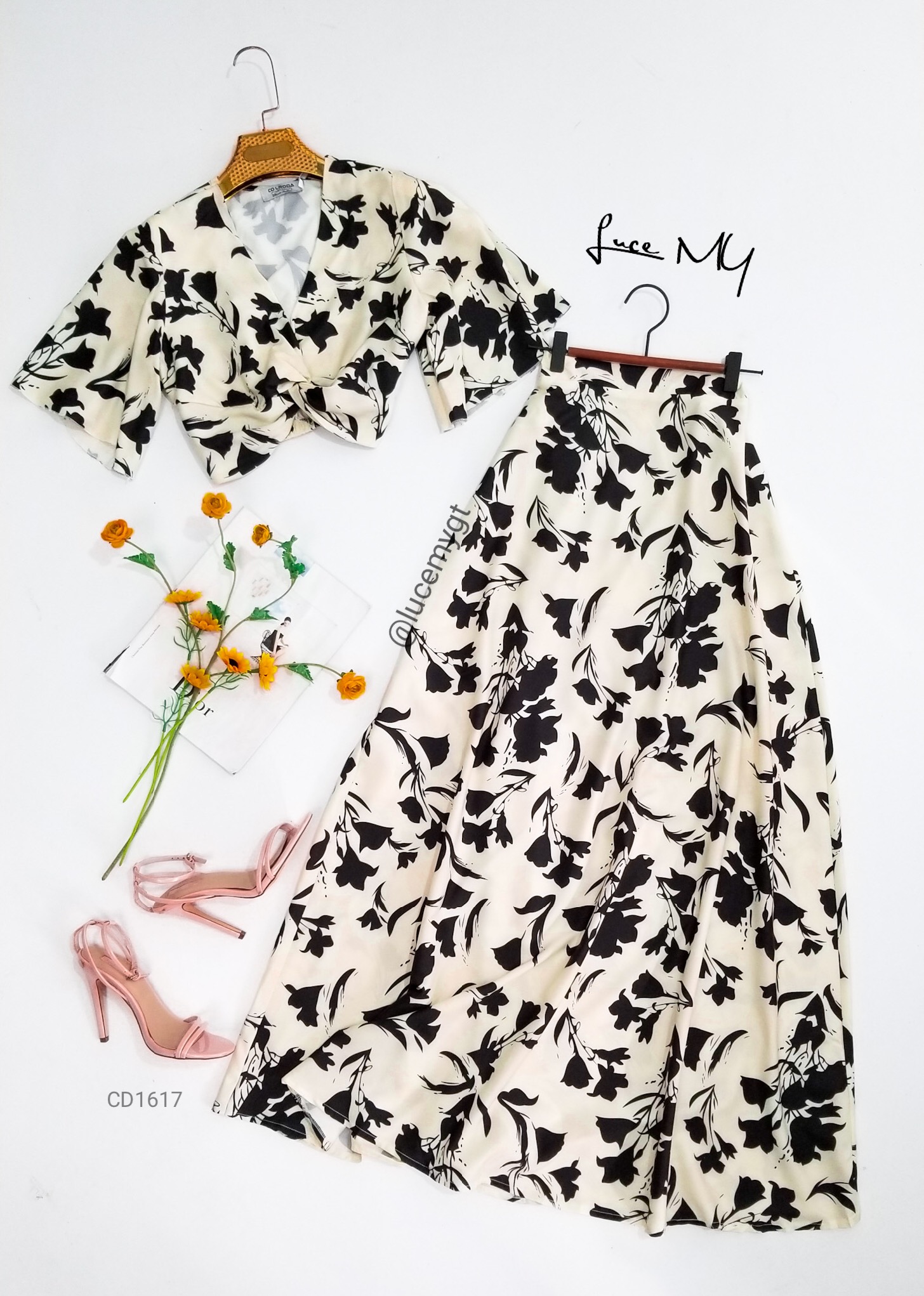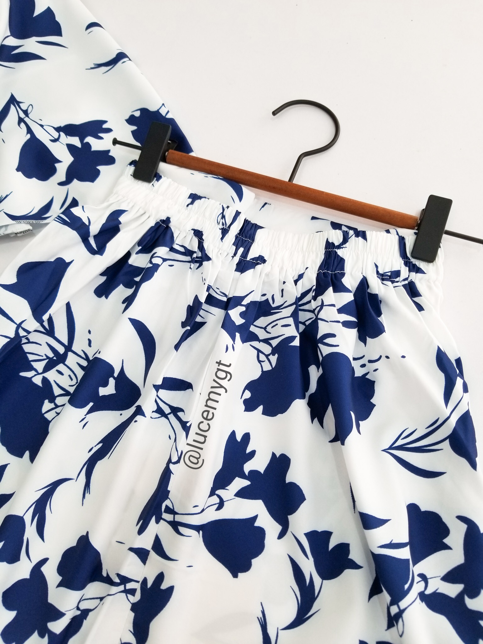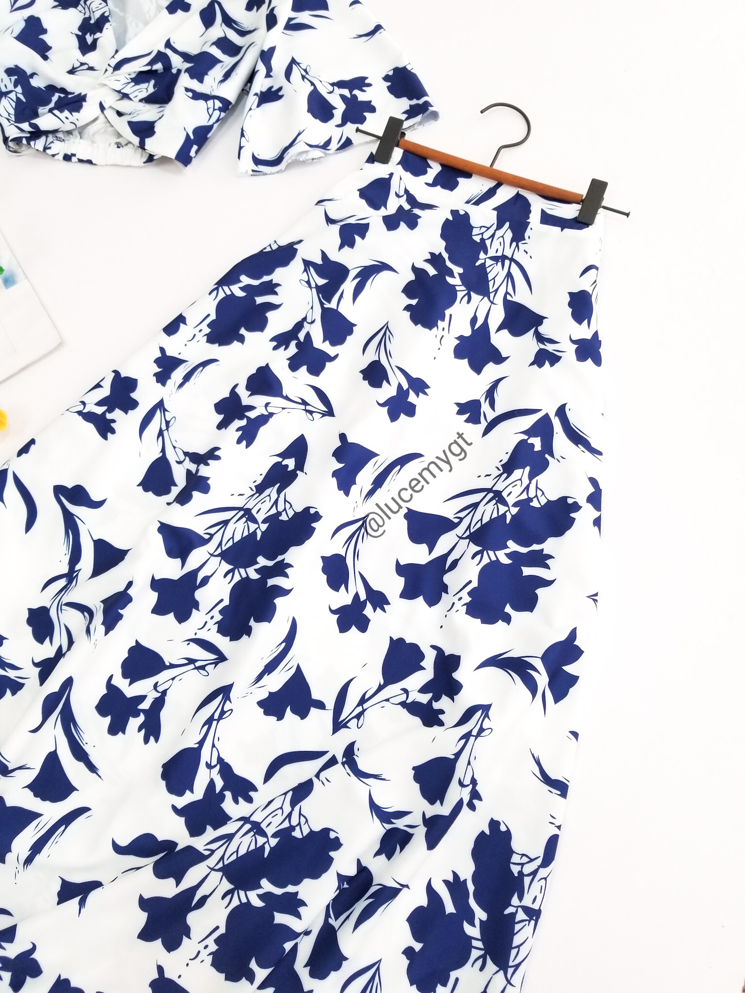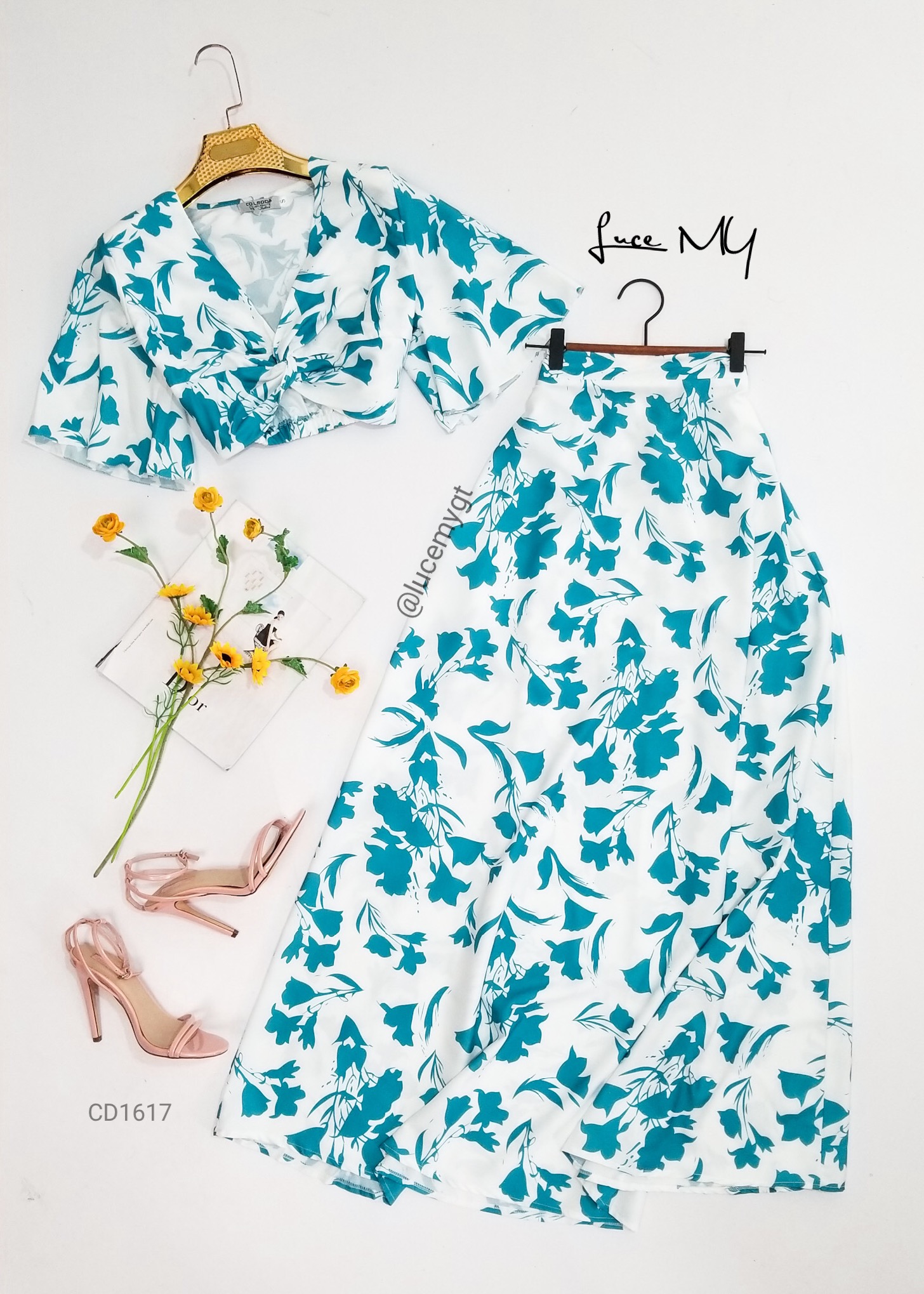 Descripción: Blusa top con nudo delantero, escote V profundo, manga corta, elasticidad en la parte atrás, falda maxi corte A, elástico en la parte de atrás