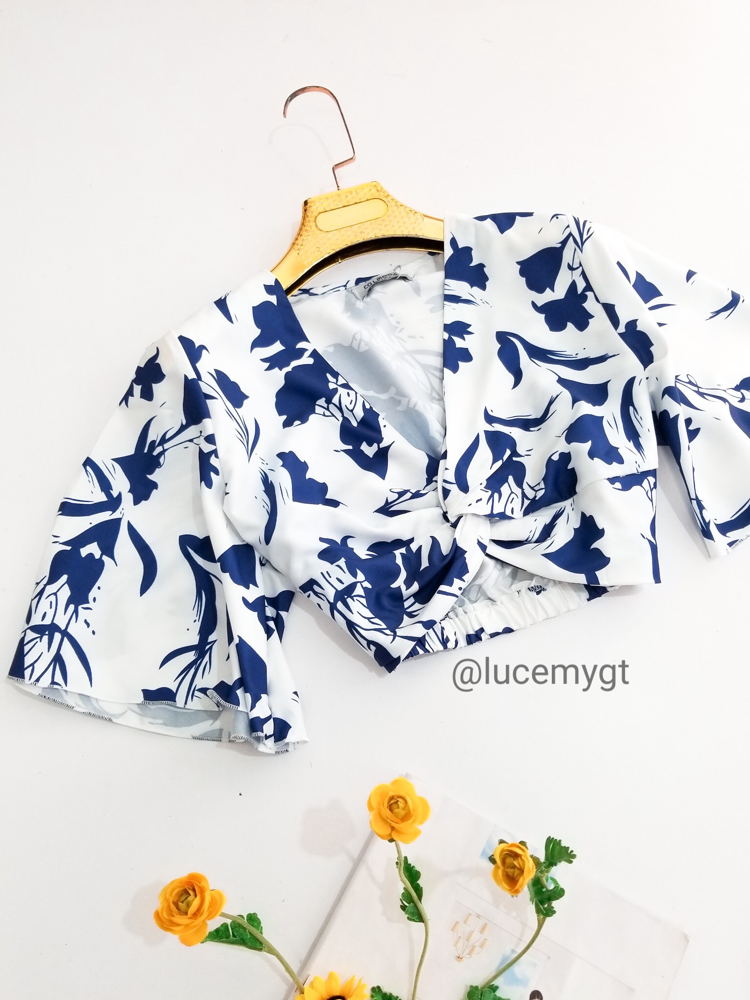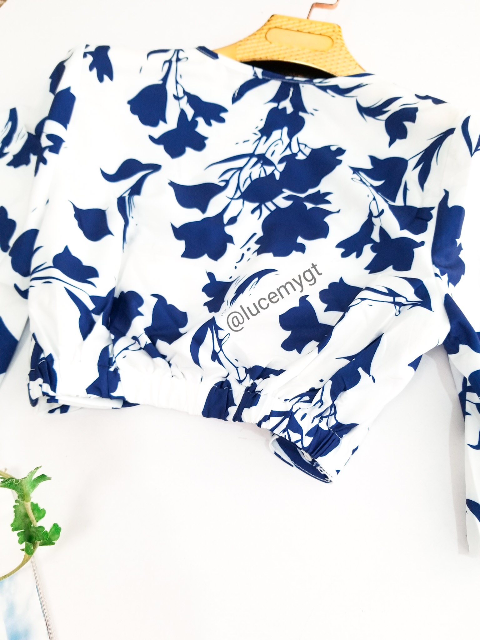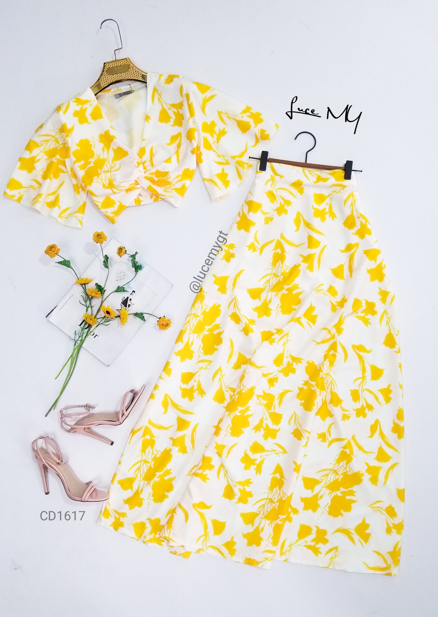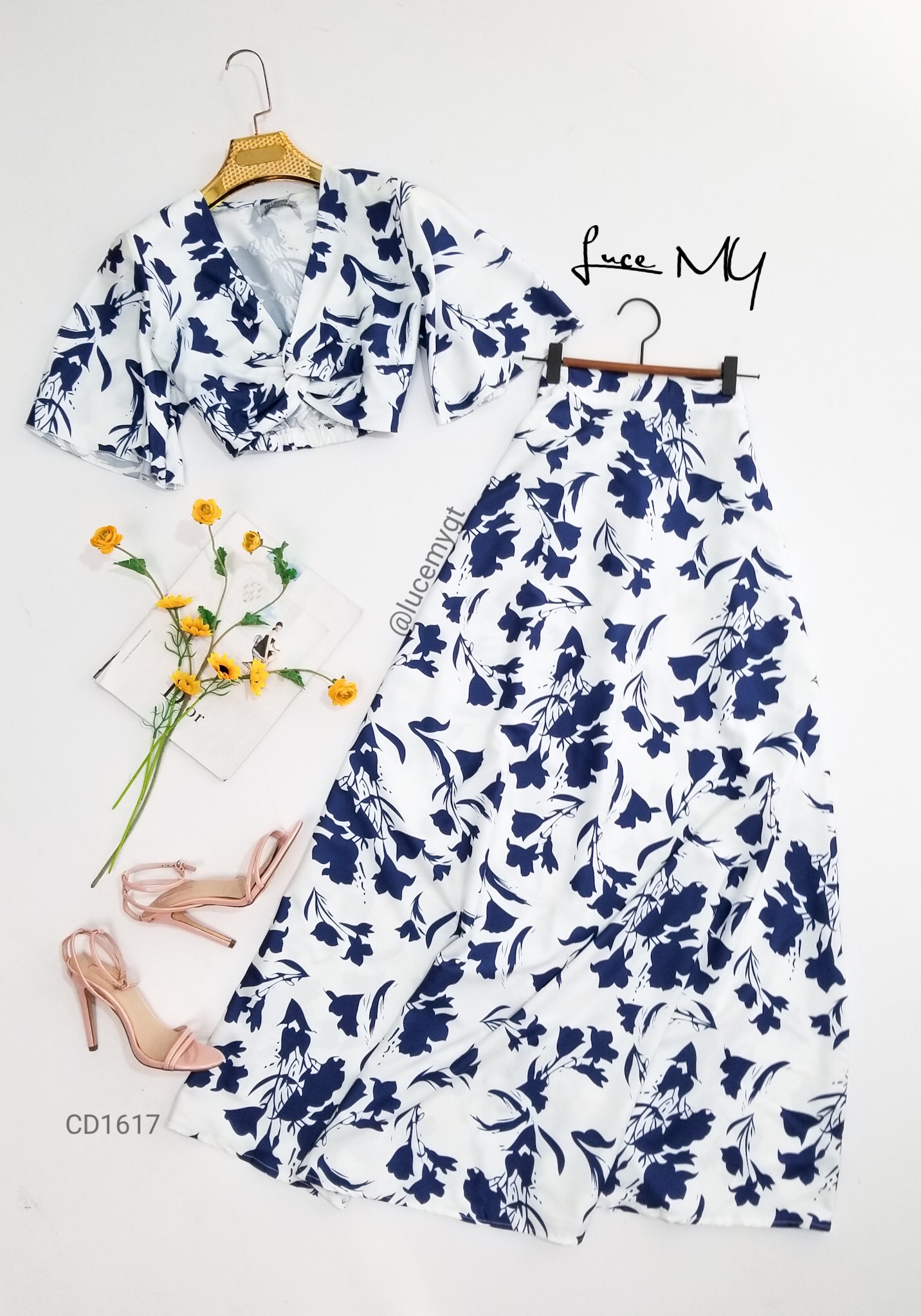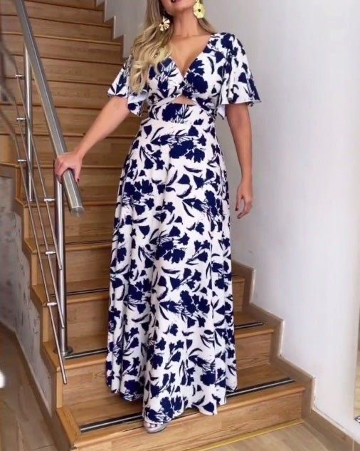 Descripción: Blusa top con nudo delantero, escote V profundo, manga corta, elasticidad en la parte atrás, falda maxi corte A, elástico en la parte de atrás