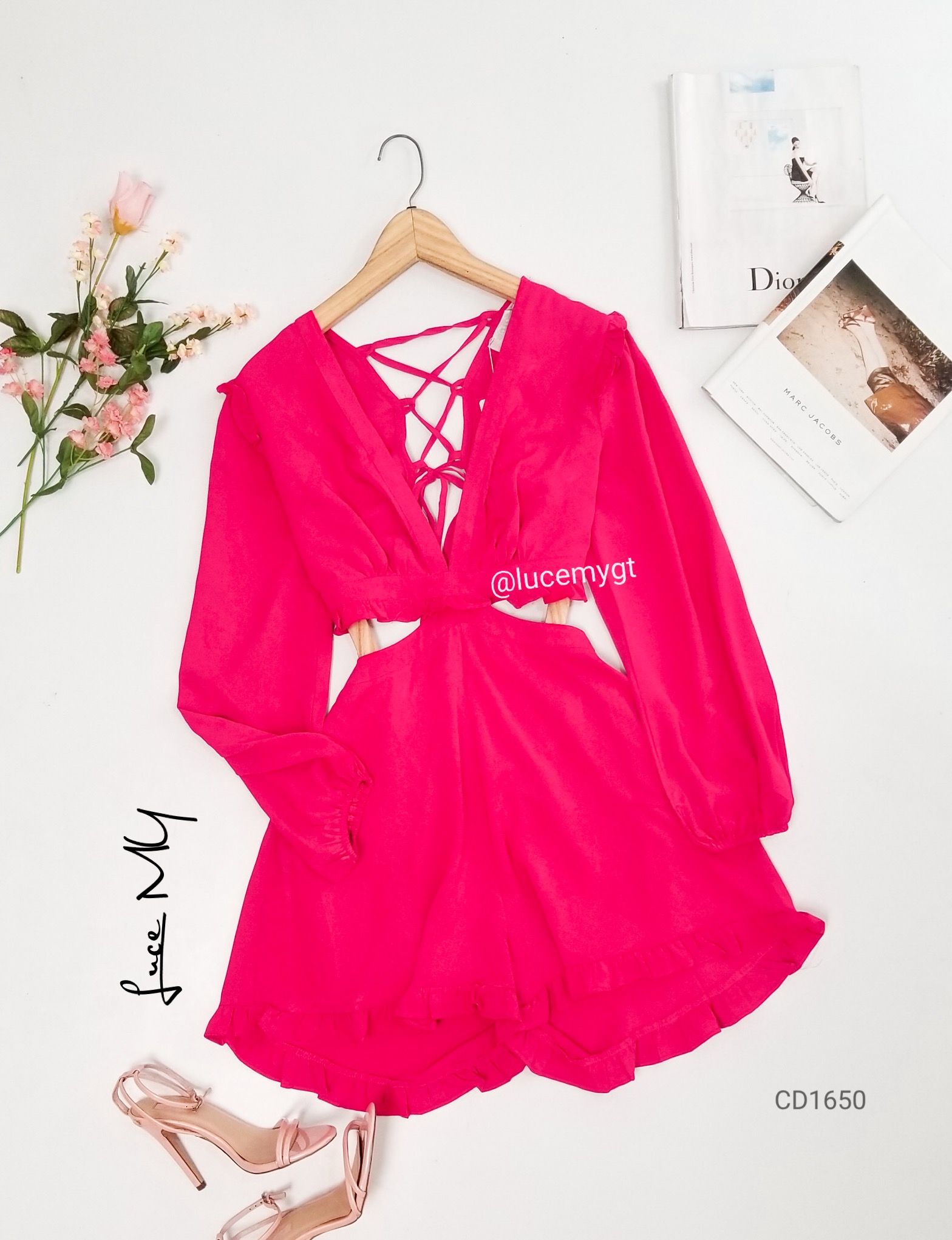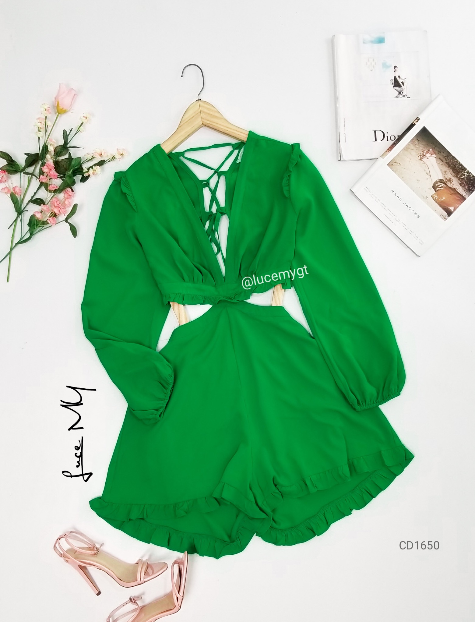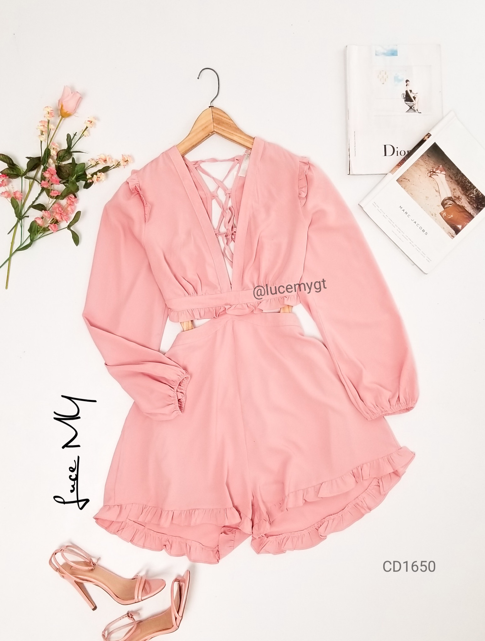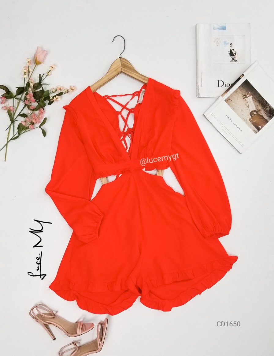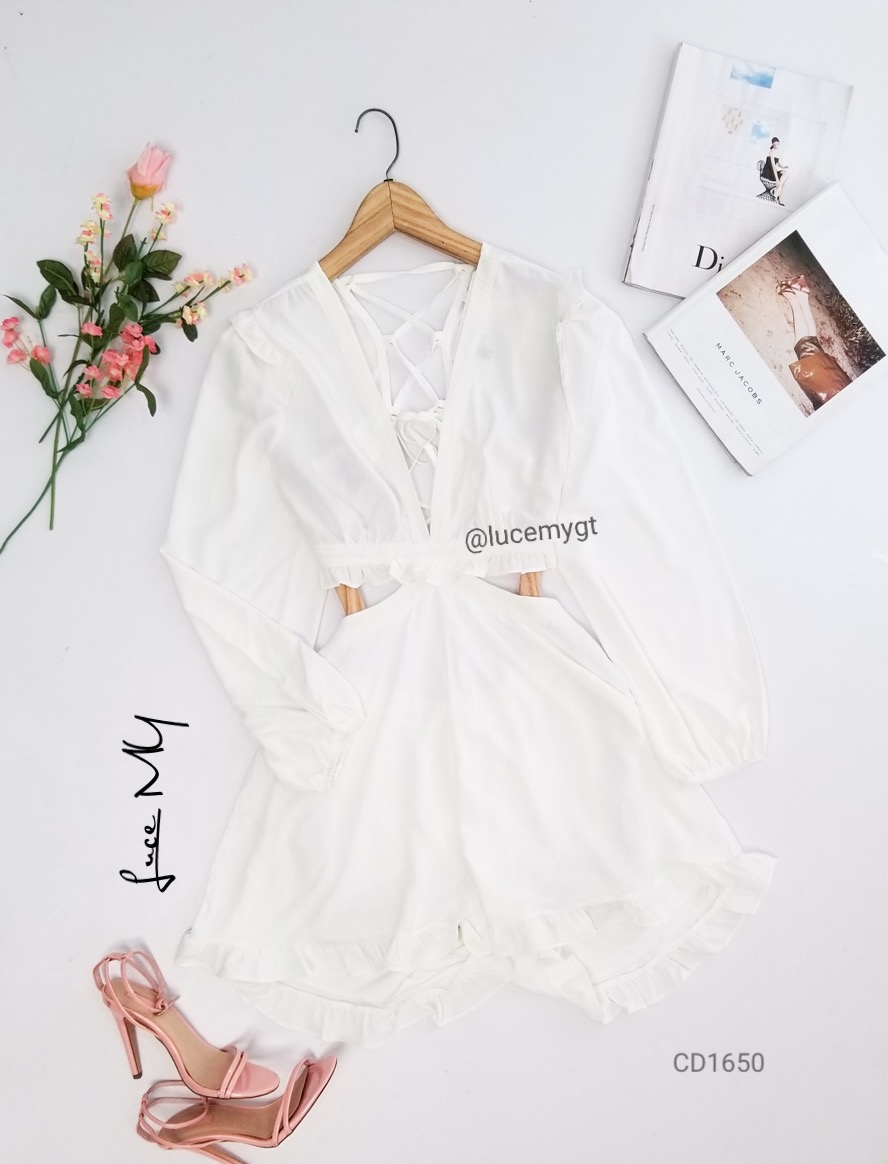 Descripción: Romper Casual, escote V profundo, manga larga en la muñequera con elástico, en la parte de atrás tiene cintas ajustables, y cremallera.