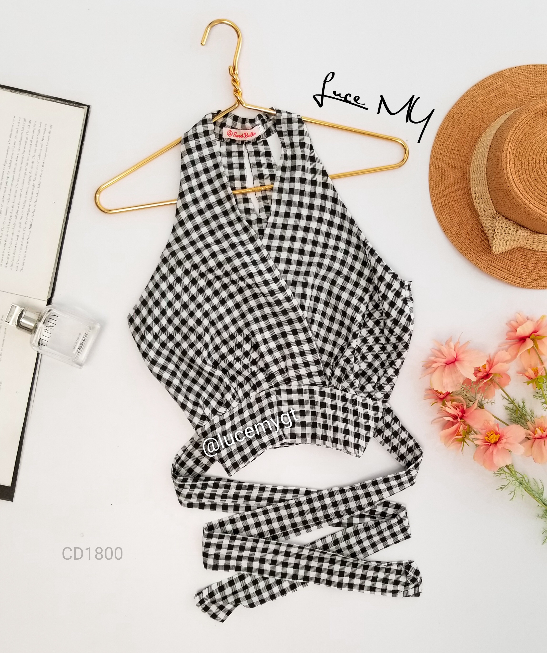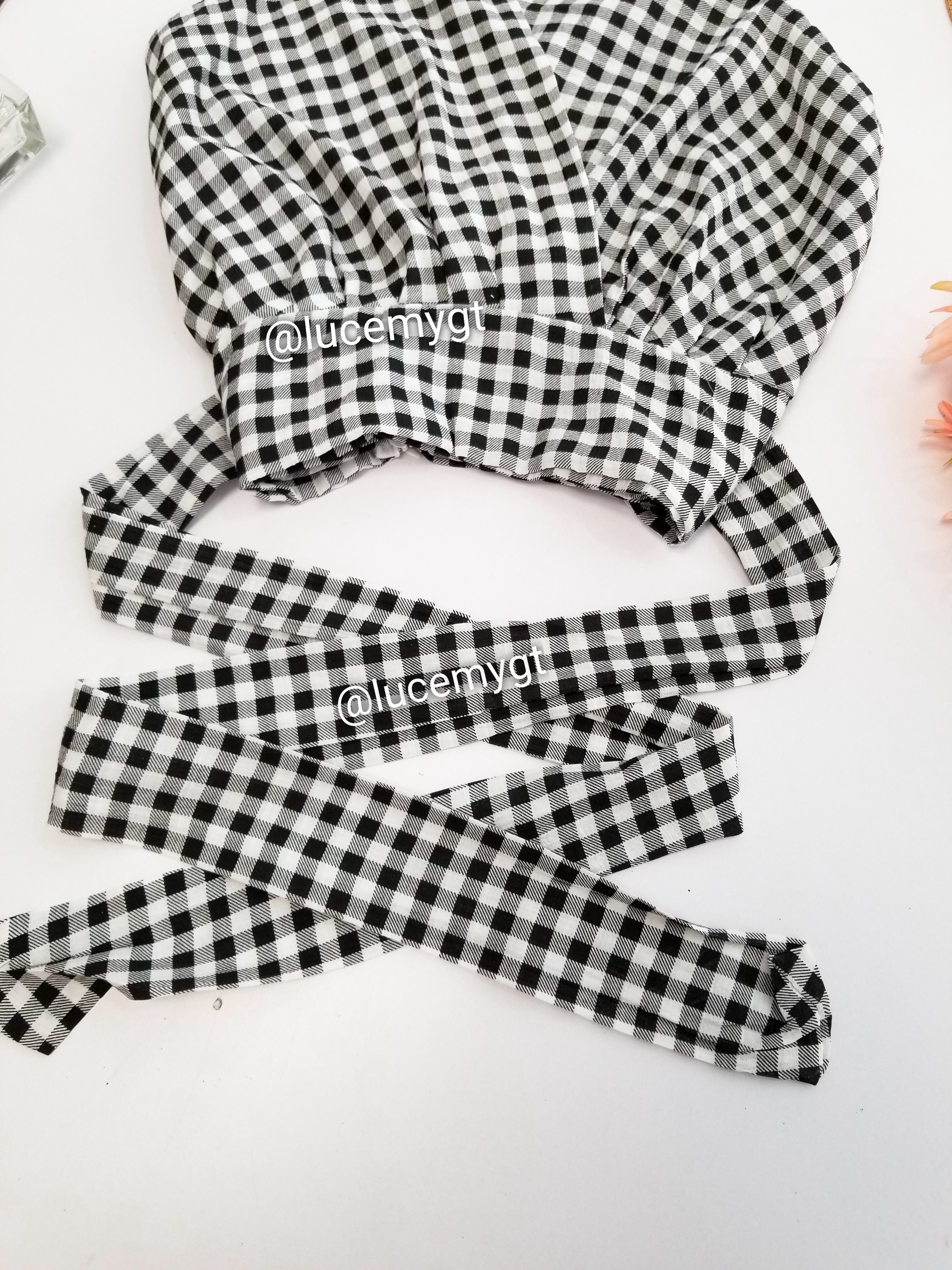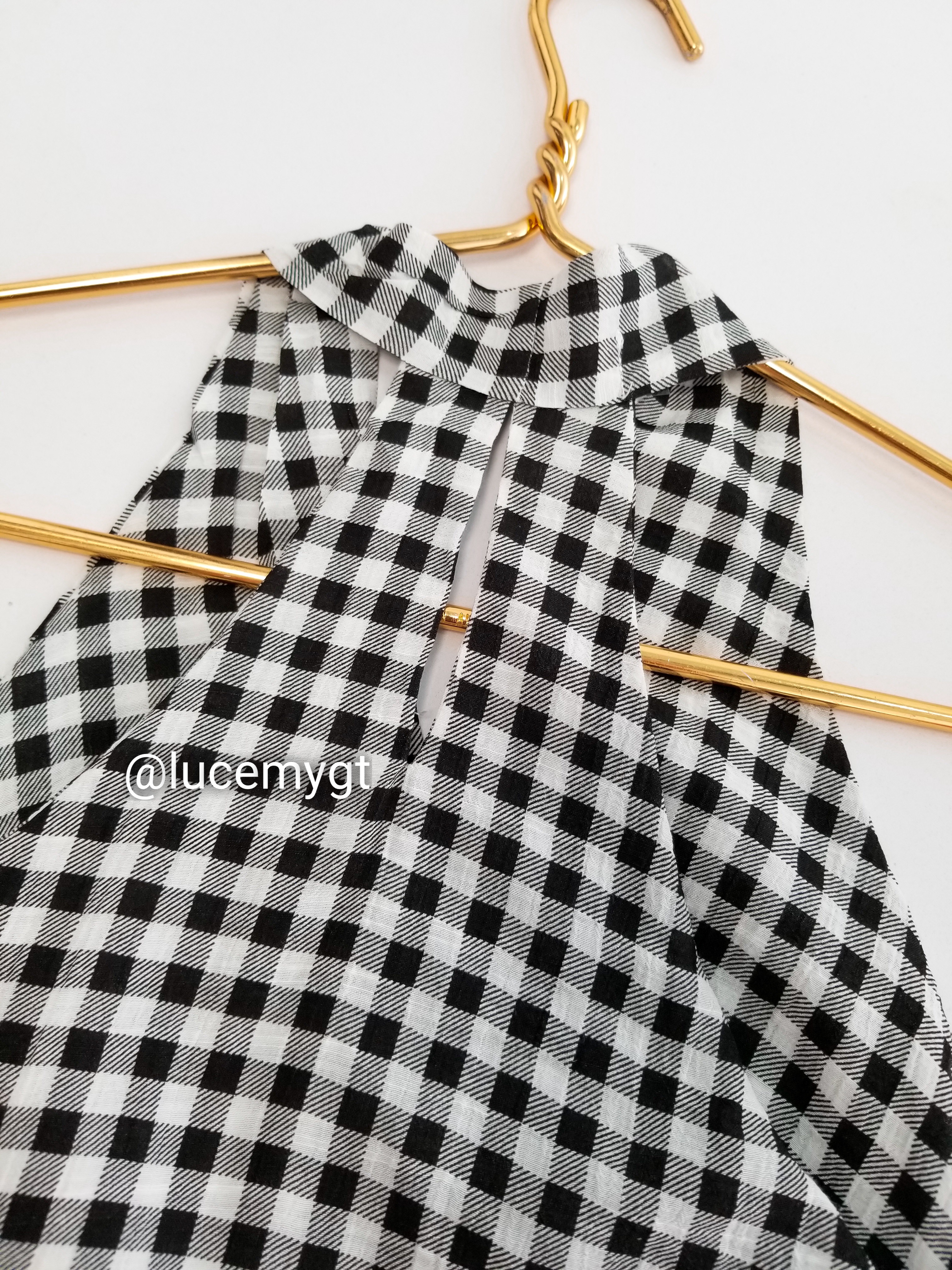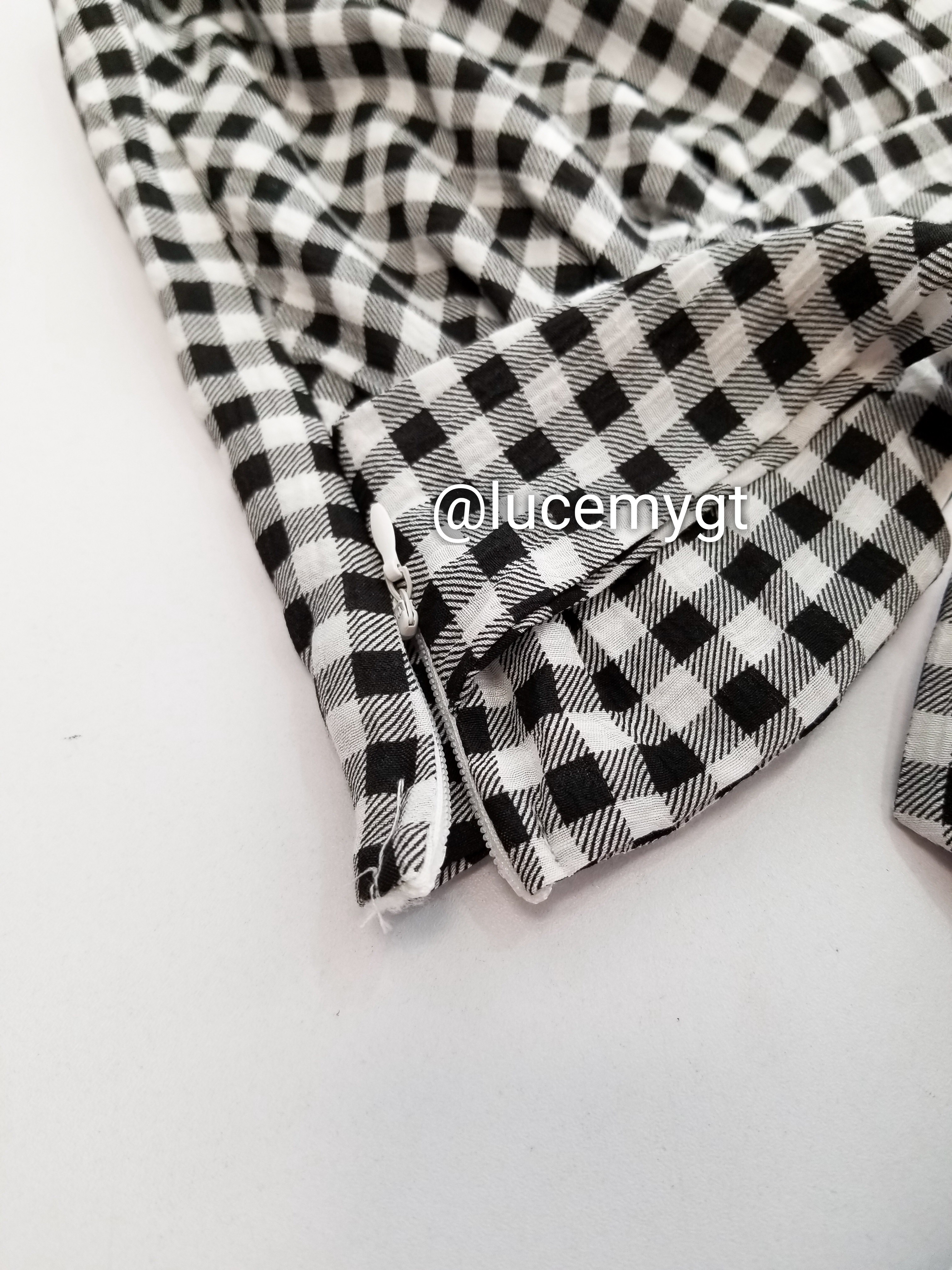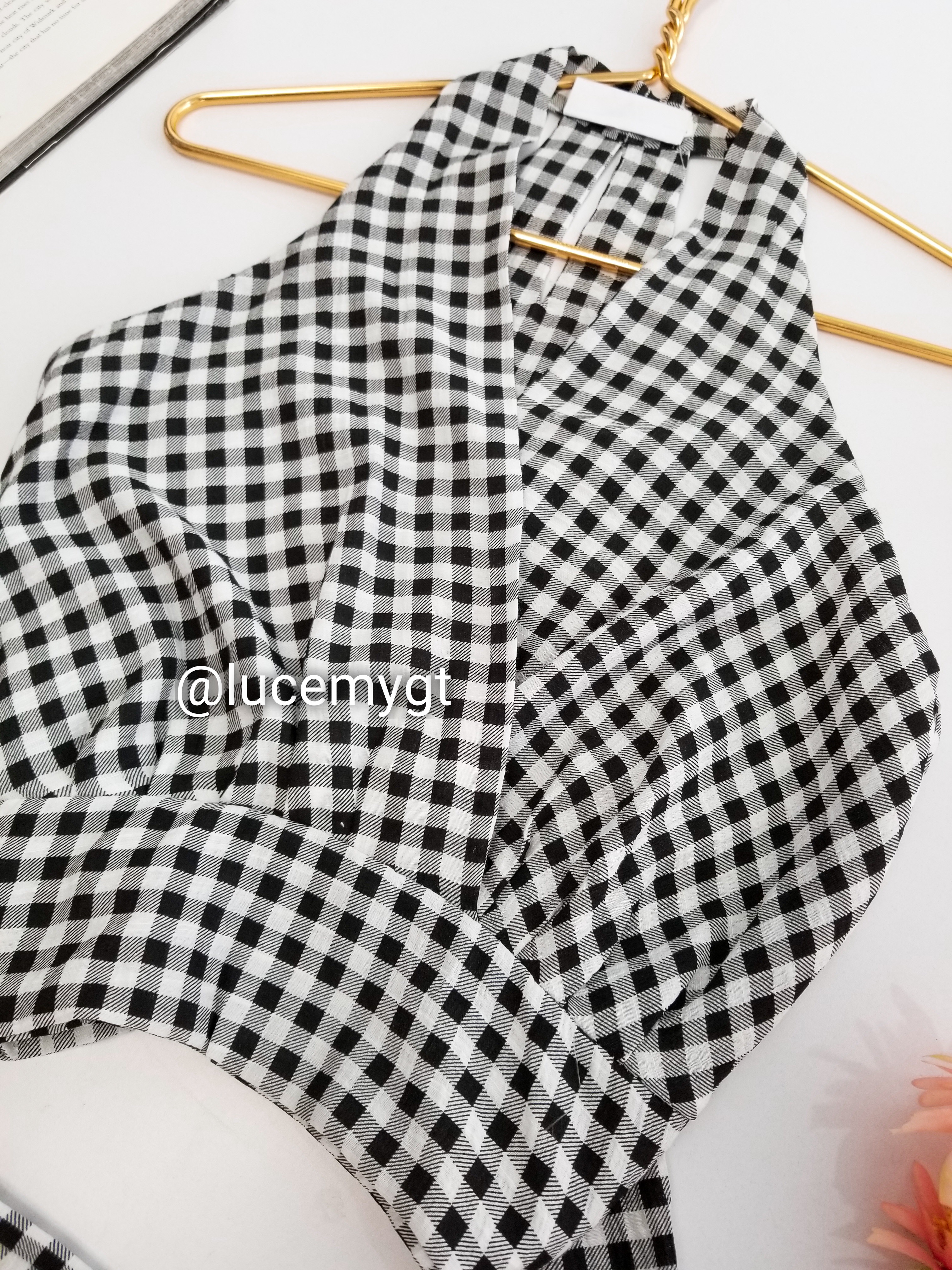 Descripción: Blusa de cuadros, escote v traslapada, sin mangas, cremallera de lado, agujeta ajustable a la cintura
