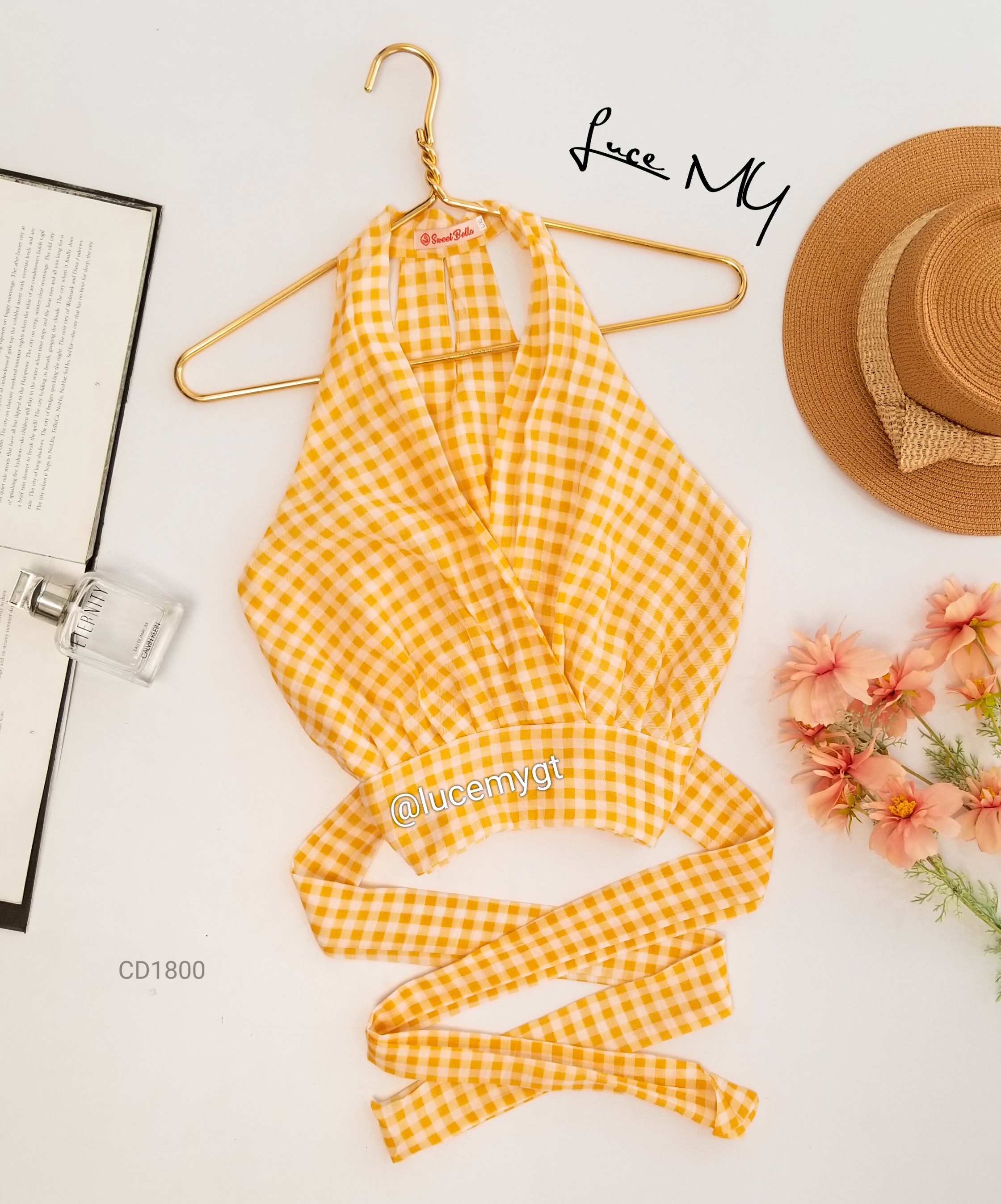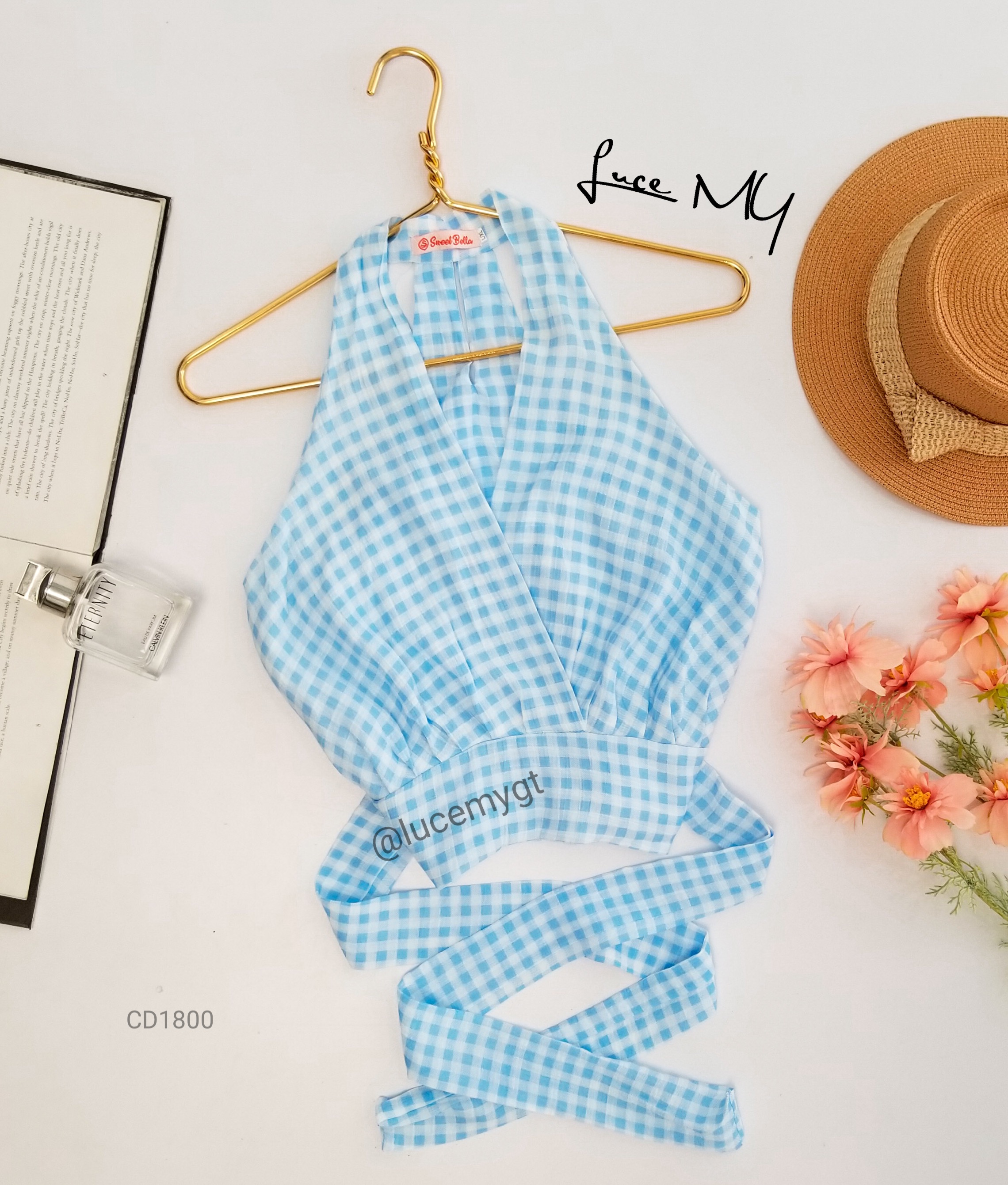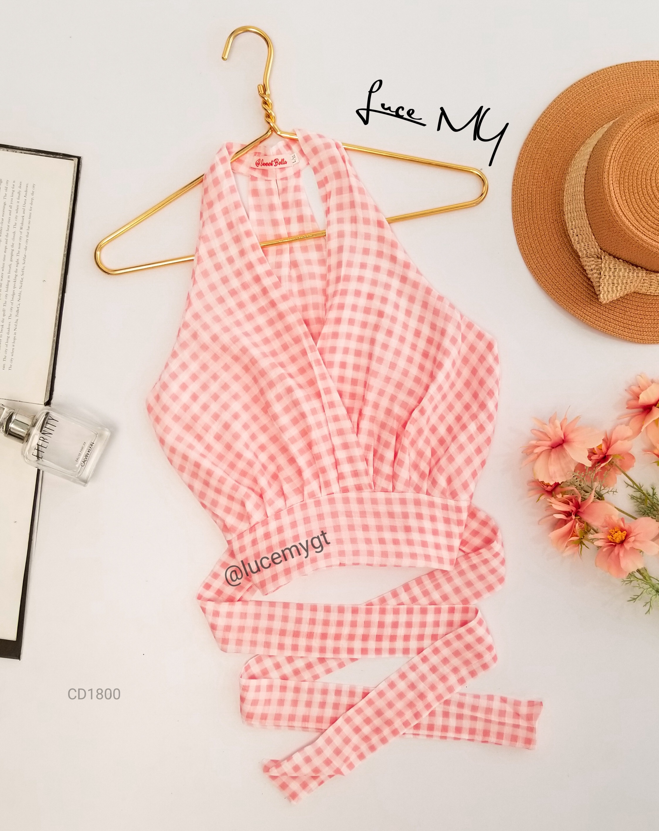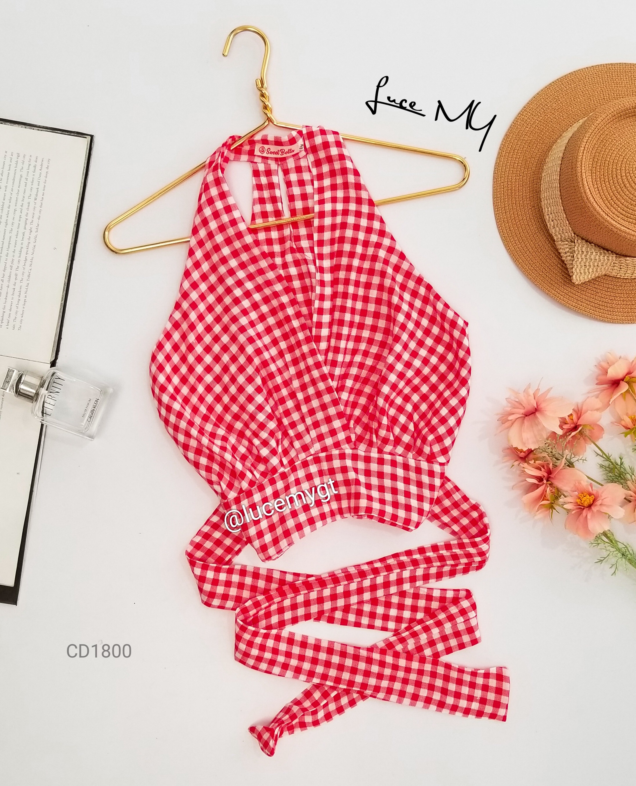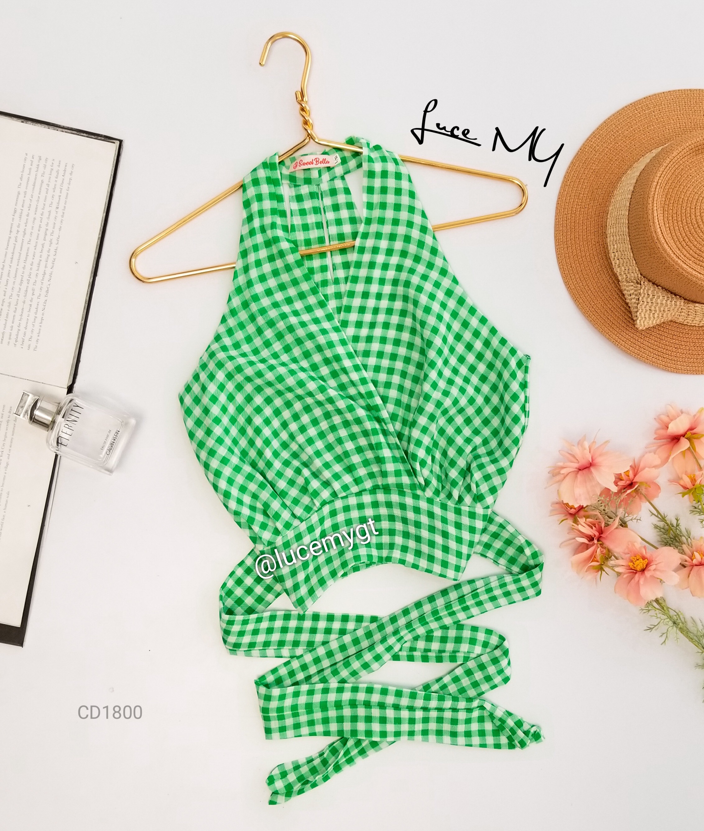 Descripción: Blusa de cuadros, escote v traslapada, sin mangas, cremallera de lado, agujeta ajustable a la cintura