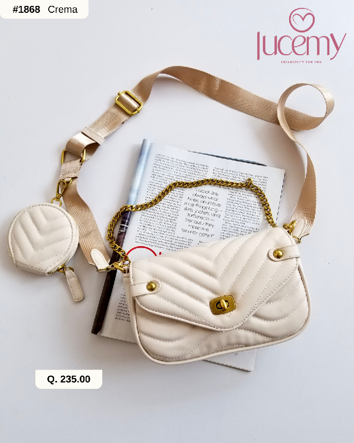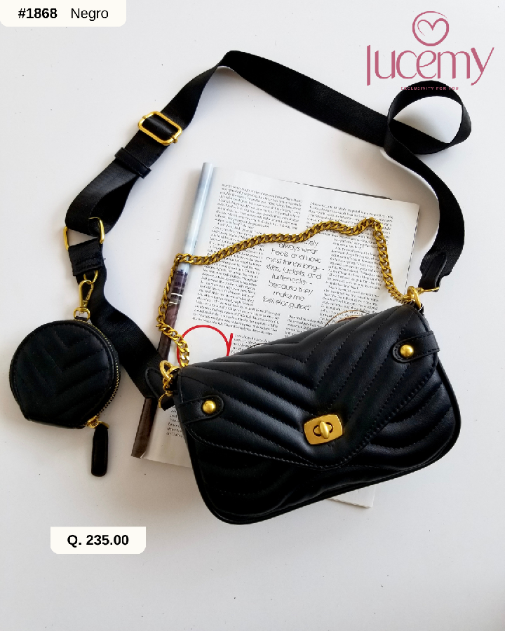 Descripción: Bolso rectangular, cuerpo con acabados en relieve. Asa de hombro ajustable y asas de mano en cadena dorada. Cierre mediante broche. Adicional mini bolsillo redondo con cierre mediante cremallera.