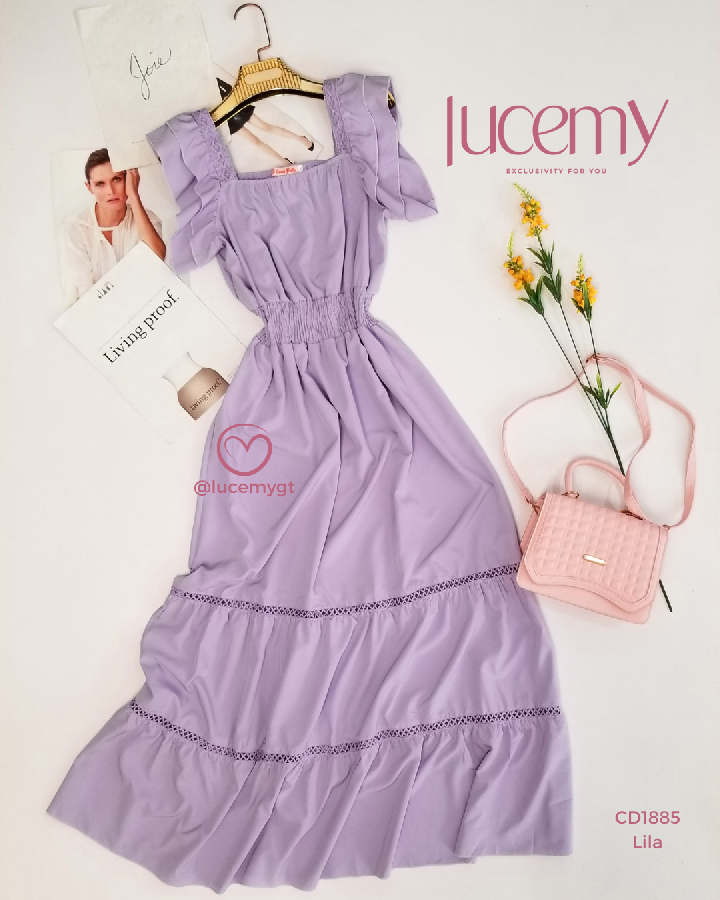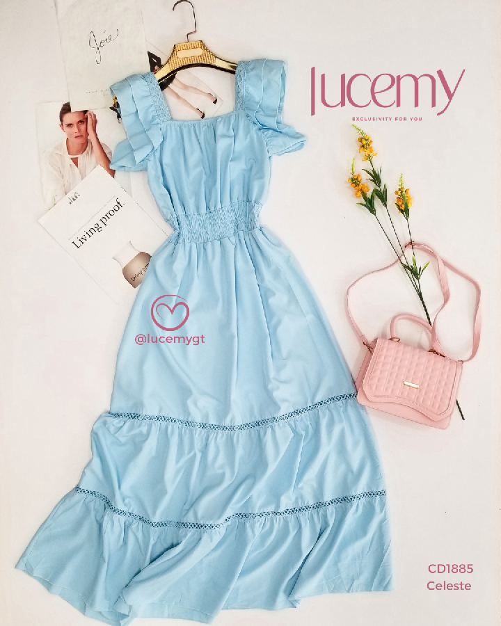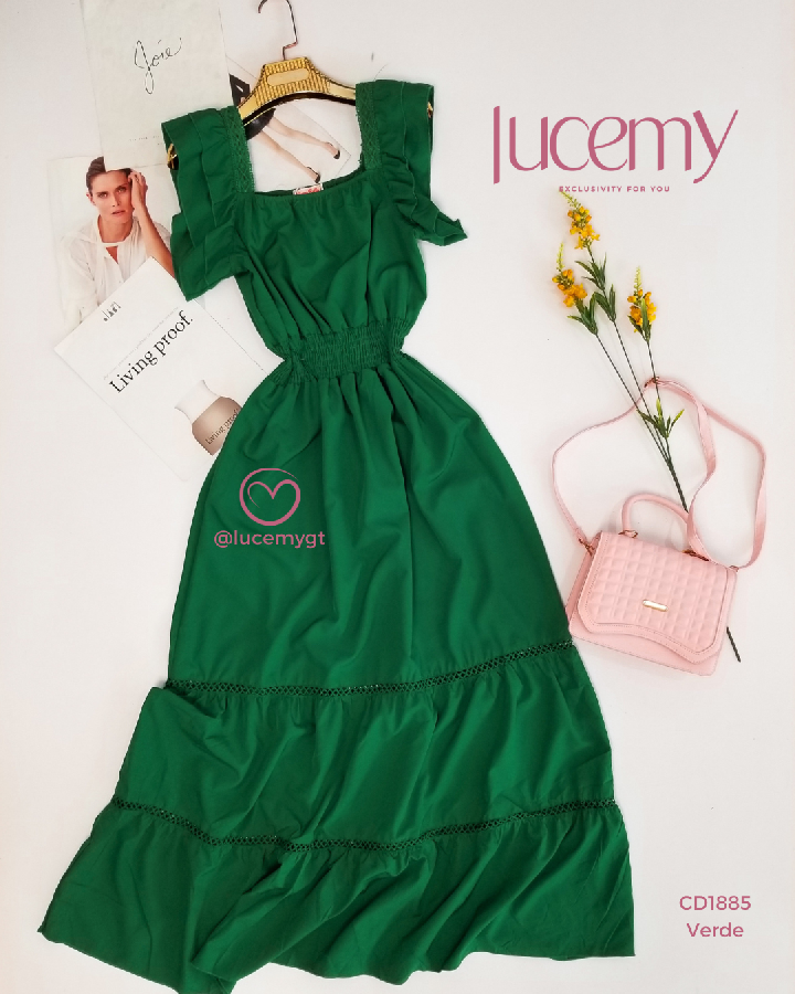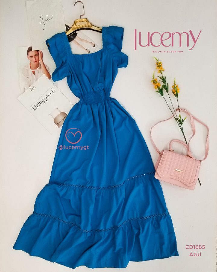 Descripción: Vestido Maxi, unicolor, escote cuadrado, manga corta con vuelitos, fruncido en la cintura.