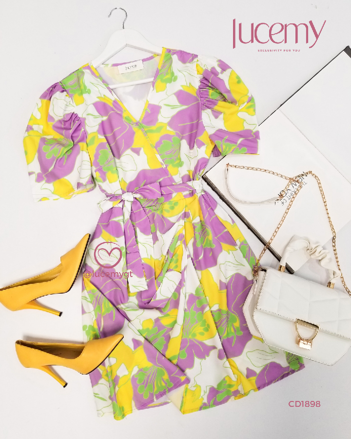 Descripción: Vestido Floral, escote V, manga corta, incluye agujeta de la misma tela