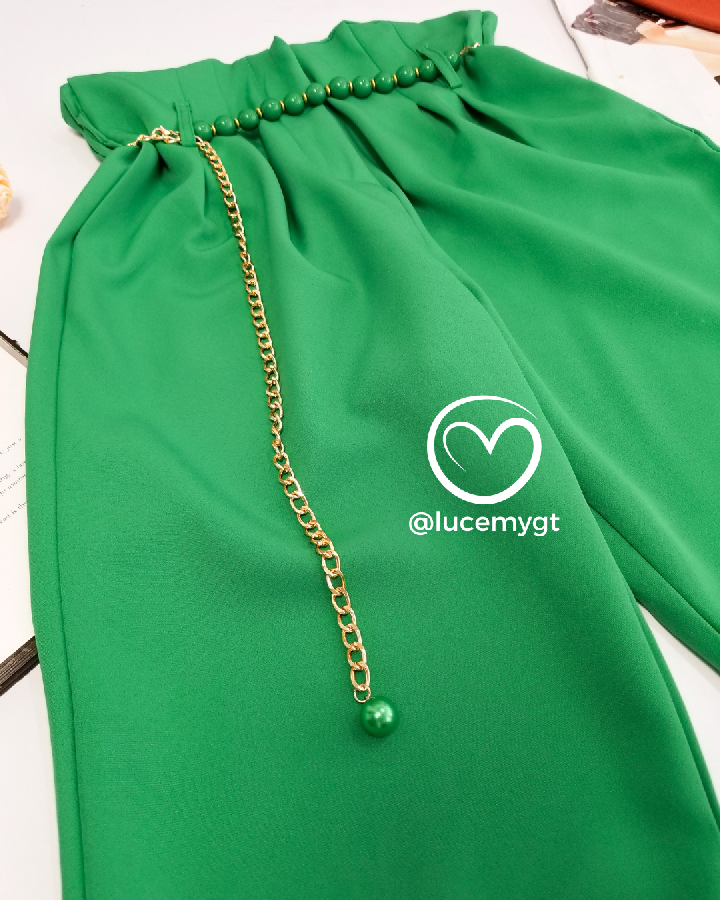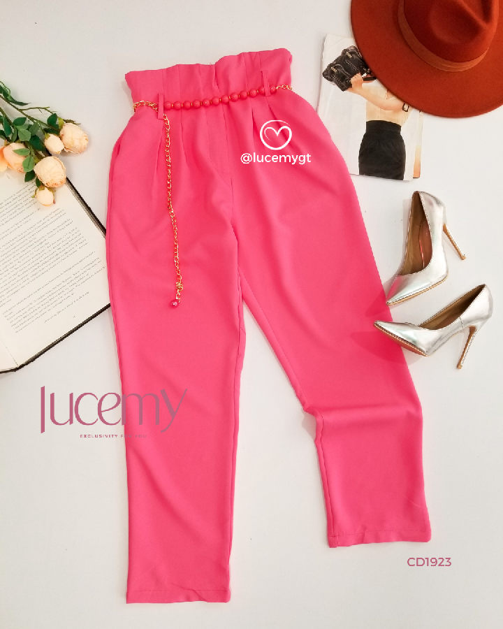 Descripción: Pantalón de pinzas, cintura alta, elástico en la cintura, incluye cincho de cuencas