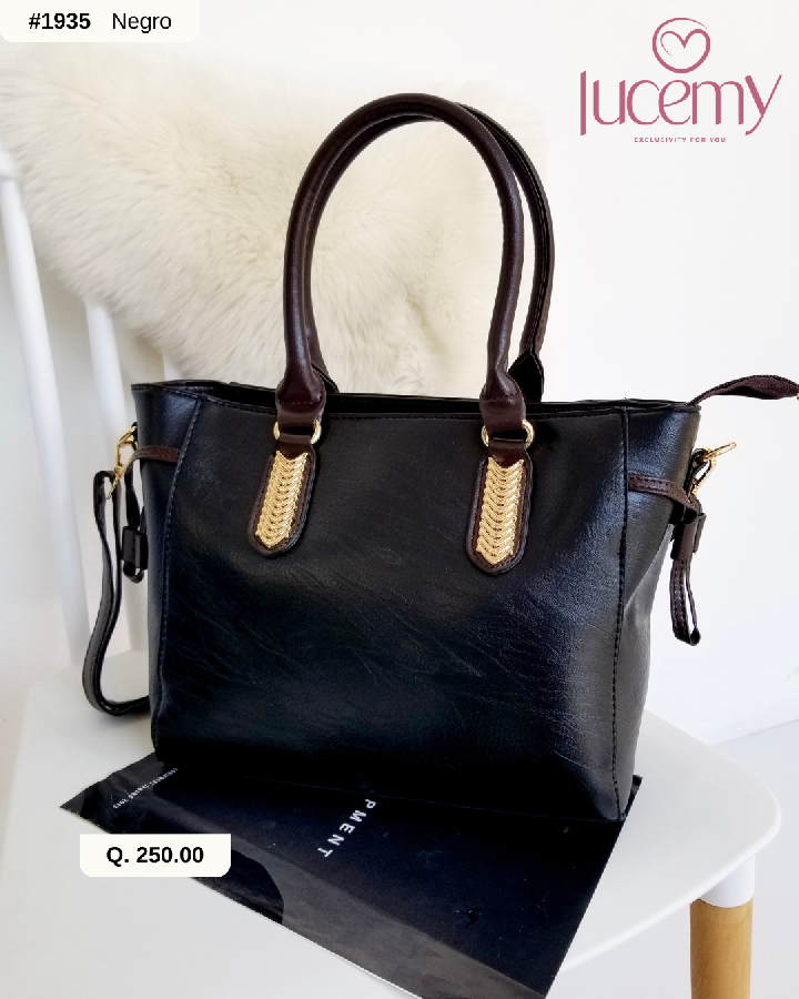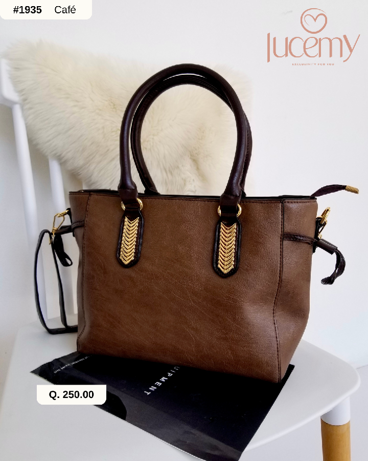 Descripción: Bolso rectangular, cuerpo con acabado dorados. Asa de hombro ajustable y asas de mano. Cierre mediante cremallera.