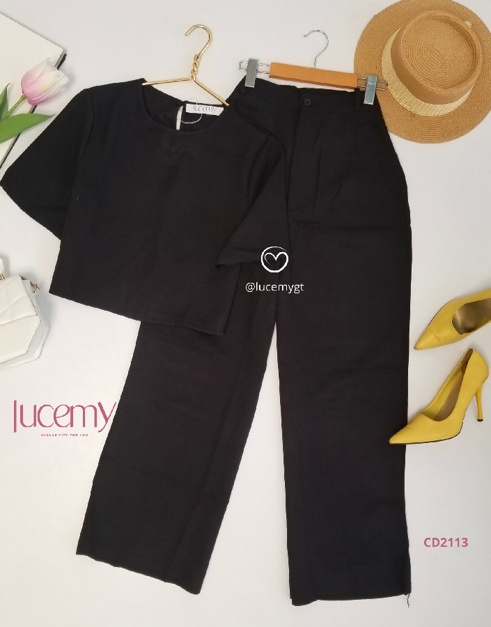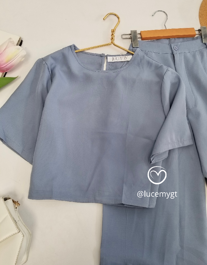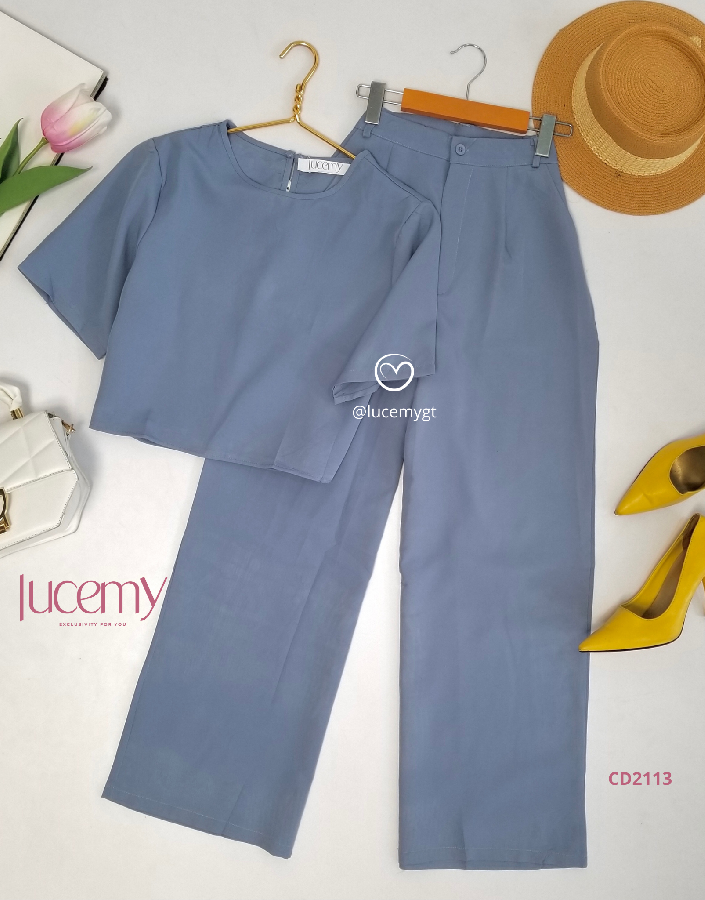 Descripción: Blusa Casual, cuello redondo, cuenta con un botón en la parte de arriba atrás, manga corta, pantalón cintura alta, bolsillos a los lados, botón en la parte de enfrente