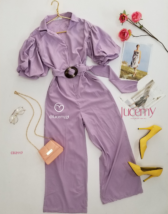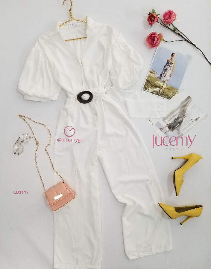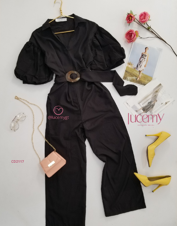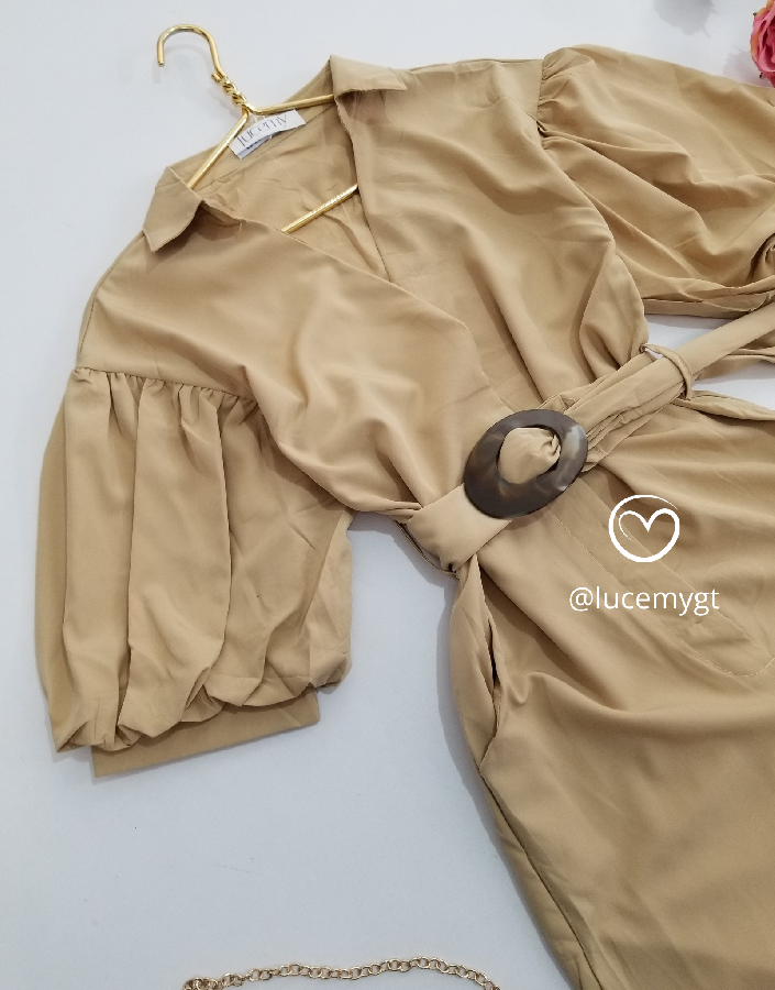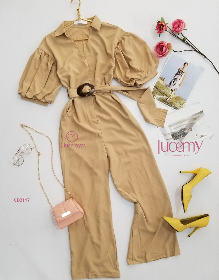 Descripción: Enterizo Casual, cuello Camisero, manga bombacha, incluye cincho de la misma tela.