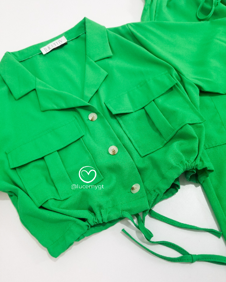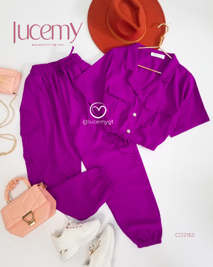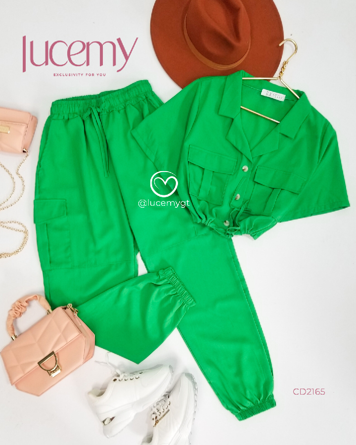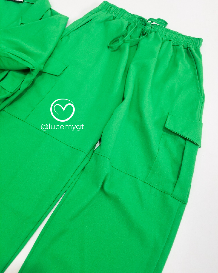 Descripción: Blusa Cargo, cuello camisero, manga corta, cinta ajustable en la cintura, bolsillos en la parte de enfrente; pantalón cargo cintura elástica, ajustable muy cómodo de usar.