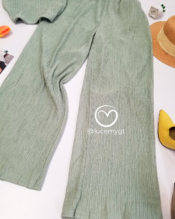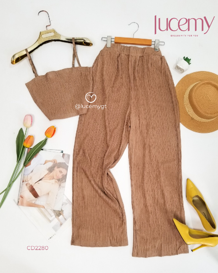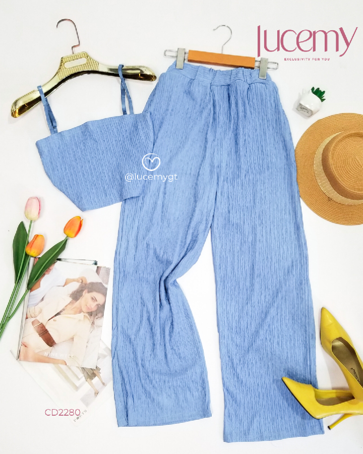 Descripción: Blusa top, tirantes ajustables; pantalón tipo palazo, cintura elástica, bolsas a los lados.