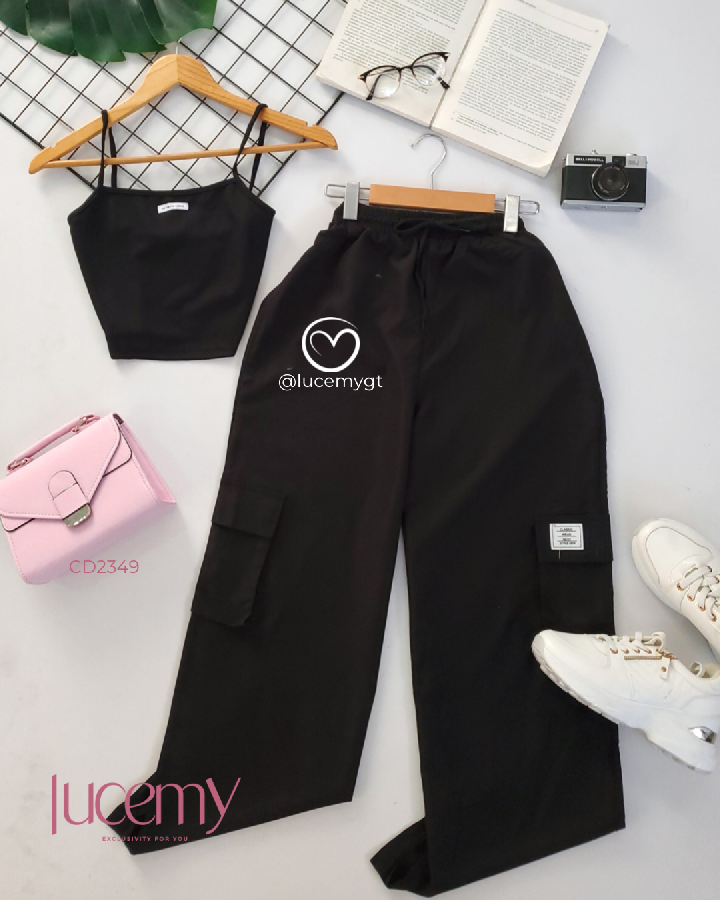 Descripción: Conjunto Cargo, blusa de tirantes, pantalón con cintura elástica, bolsillos a los lados.