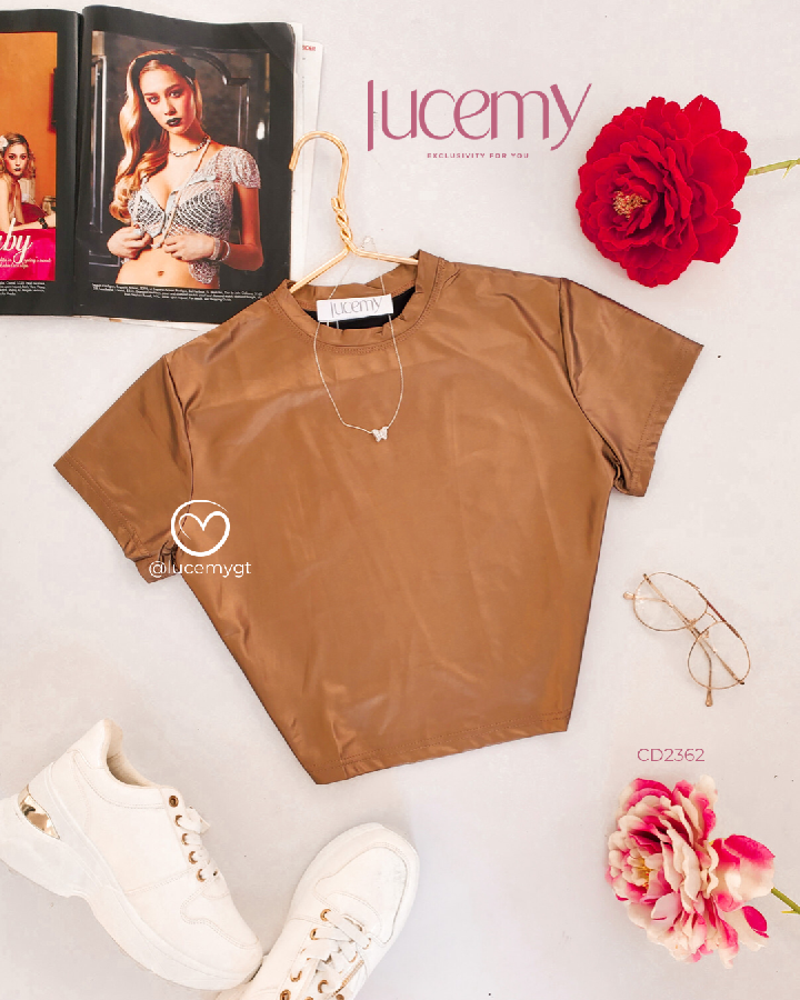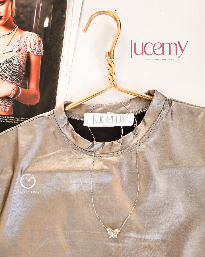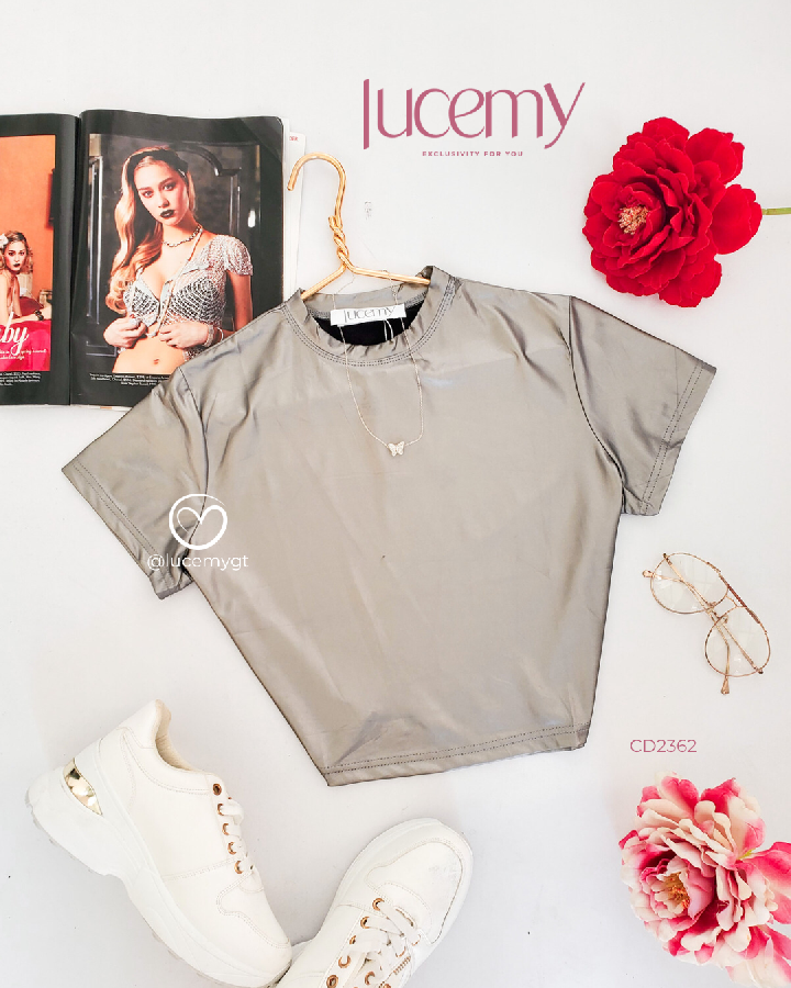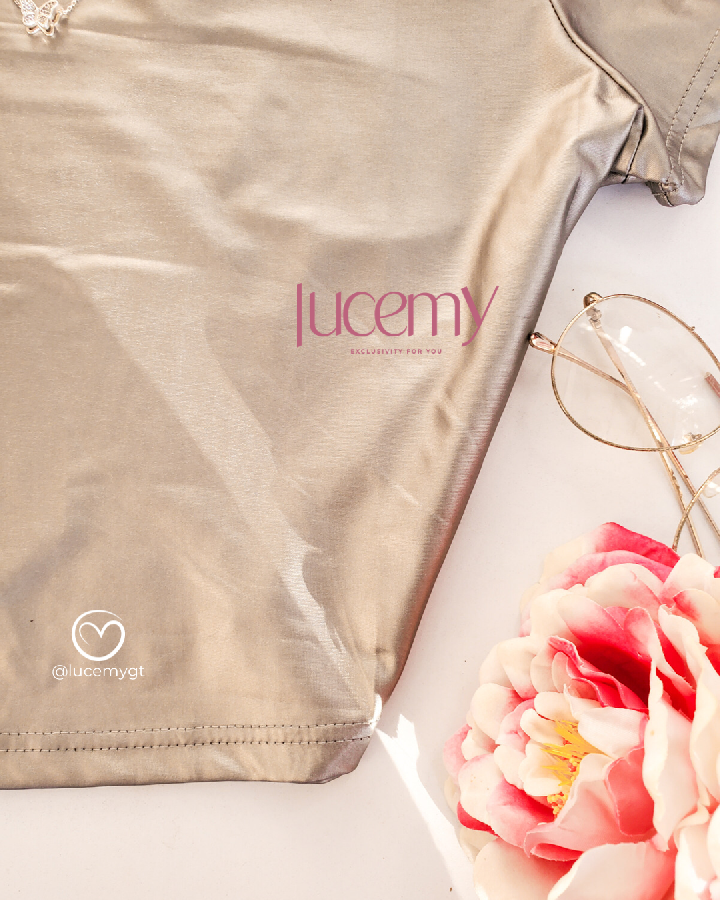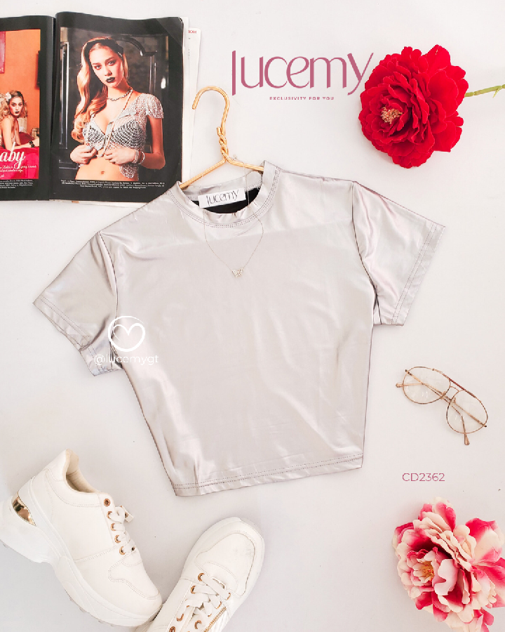 Descripción: Blusa metálica, cuello redondo, manga corta, estilo muy versátil