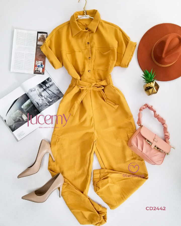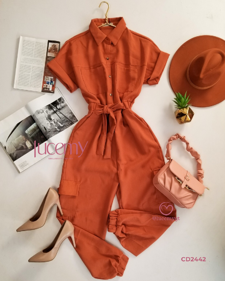 Descripción: Enterizo cargo, cuello camisero, botones en la parte enfrente, tiene elástico en la parte de atrás de la cintura.