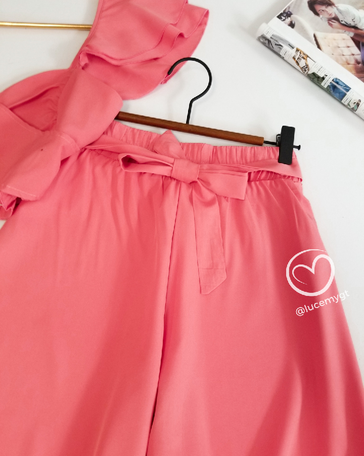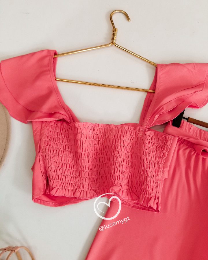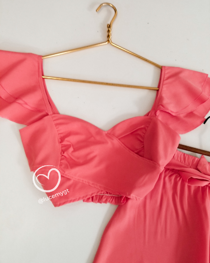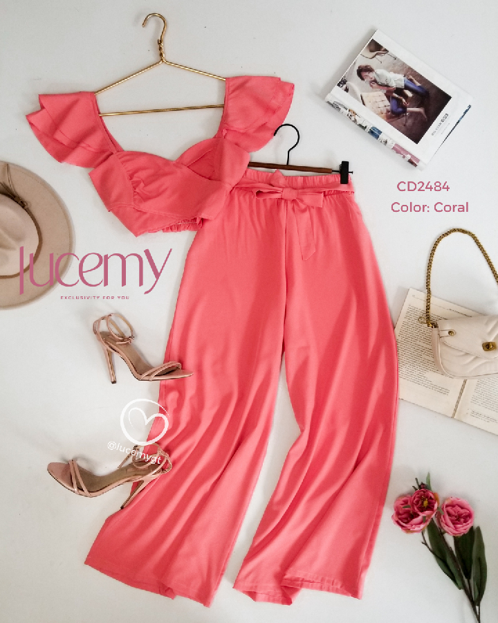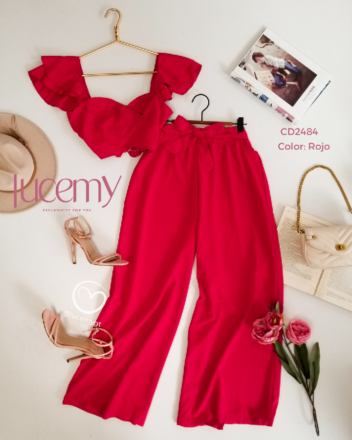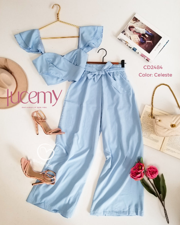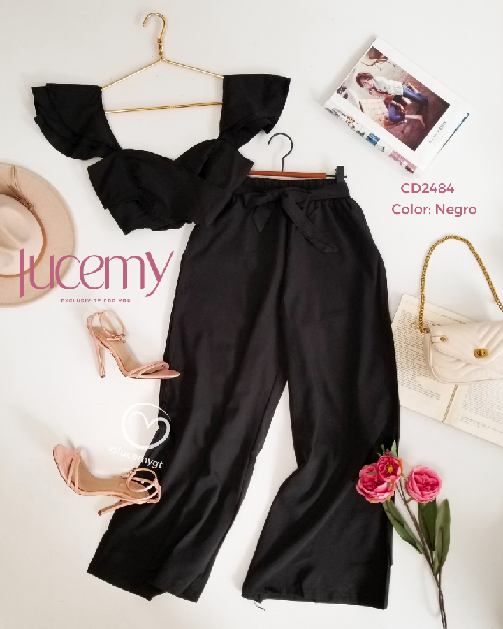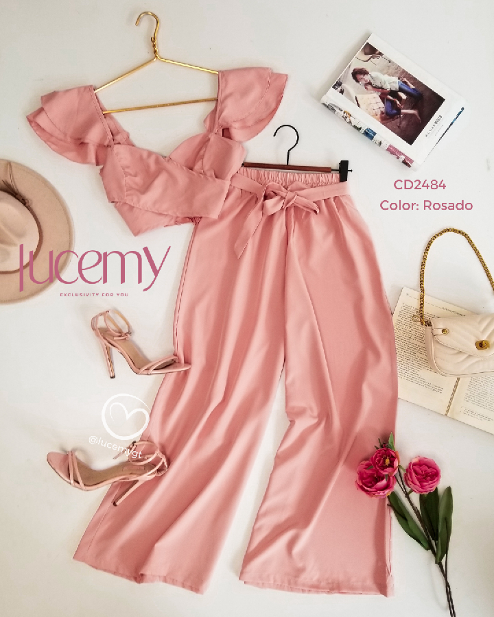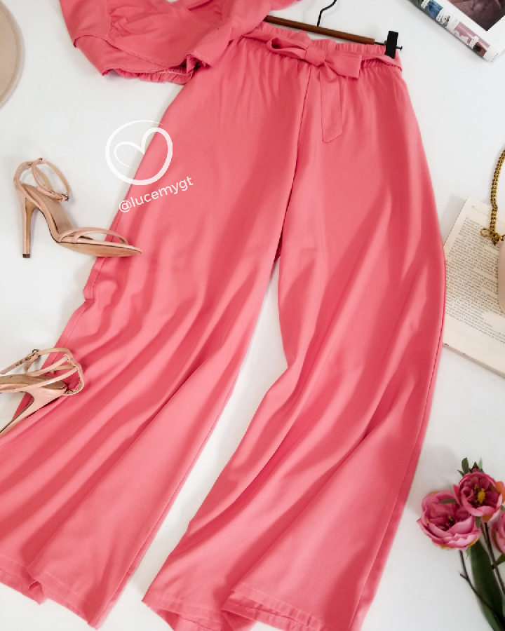 Descripción: Blusa traslapada, escote corazón, fruncida en la parte de atrás, pantalón palazo, con elástico en la acintura.