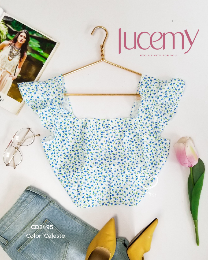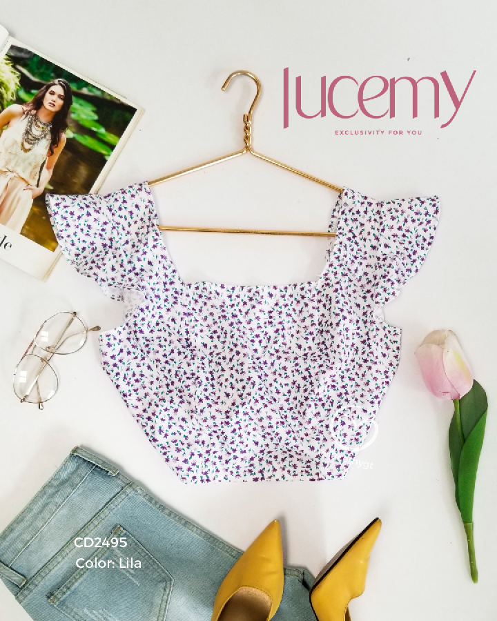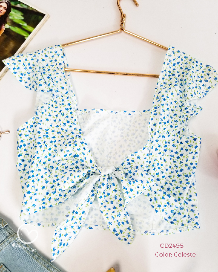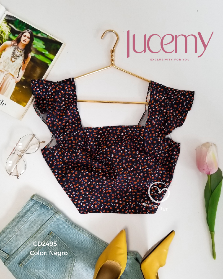 Descripción: Blusa de flores, escote cuadrado, manga corta, agujeta en la parte de atrás