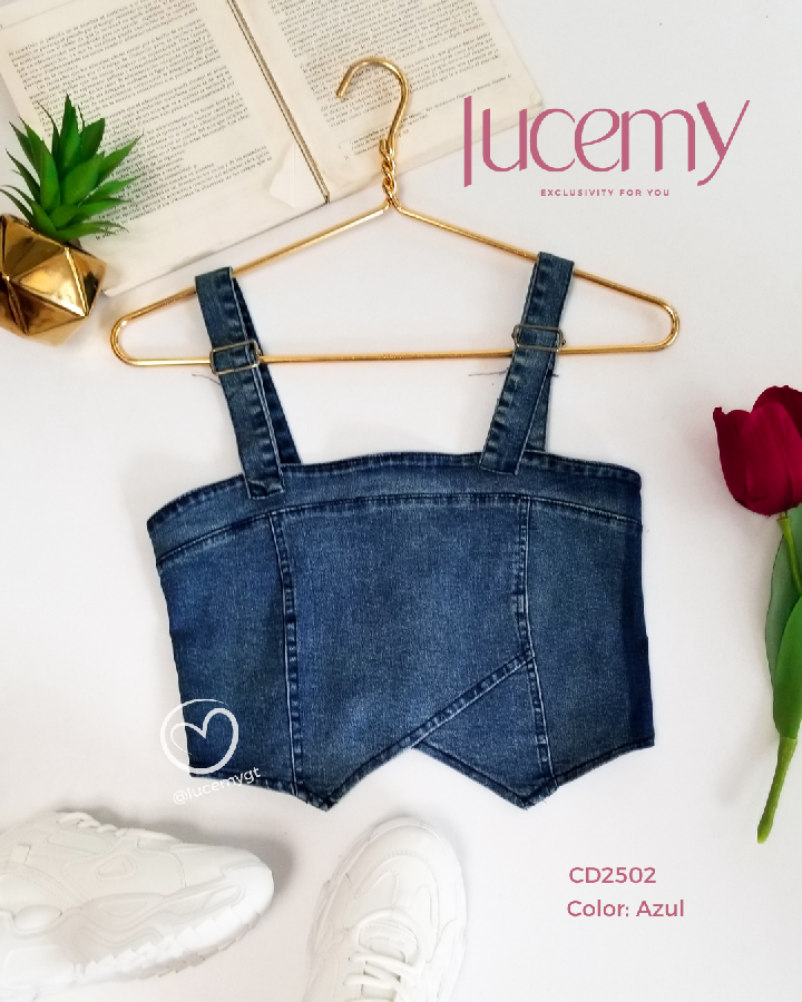 Descripción: Corset Mezclilla, escote cuadrado, tirantes ajustables, fruncida en la parte de atrás.