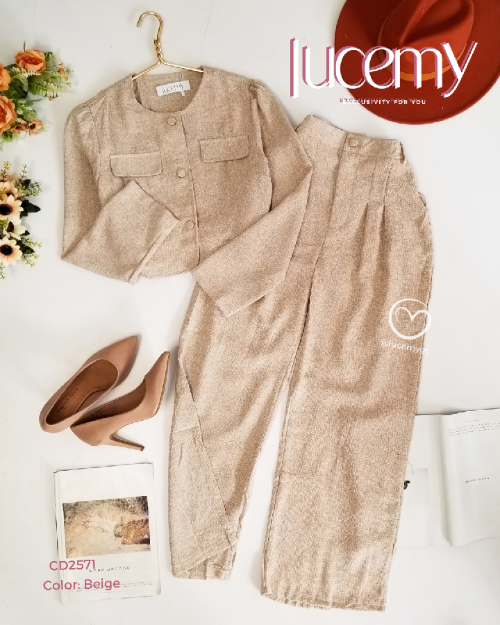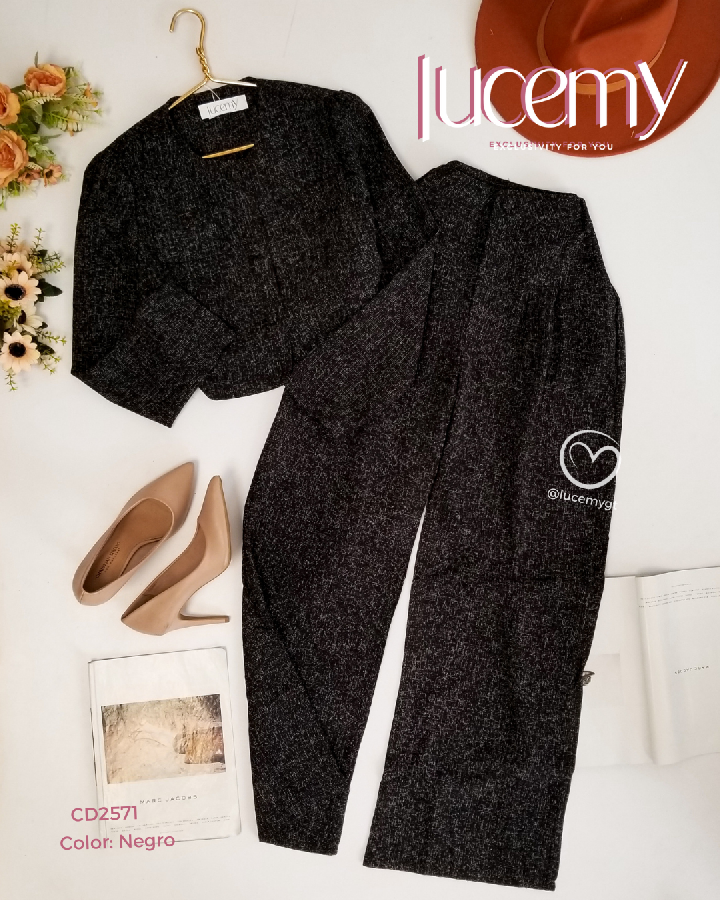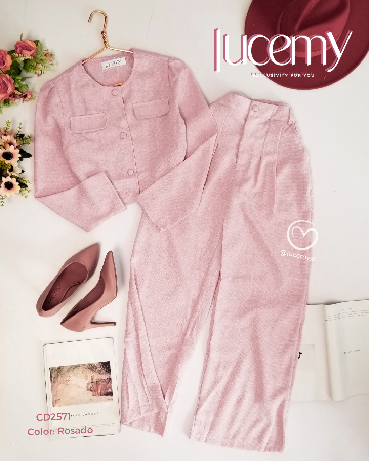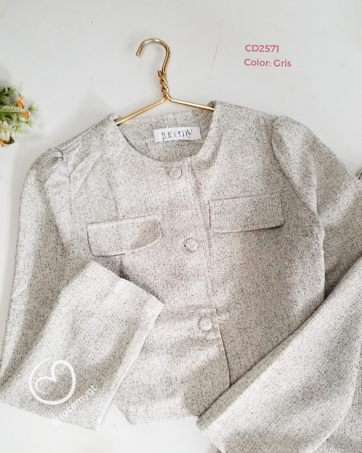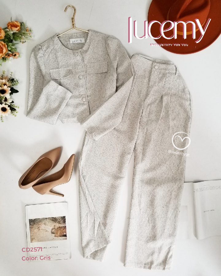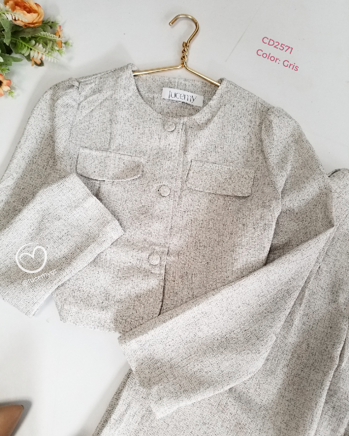 Descripción: Chaqueta cuello redondo, manga larga simulación de bolsas, botones forrados de la misma tela, pantalón cintura alta, botón y cremallera en la parte de enfrente, bolsillos a los lados