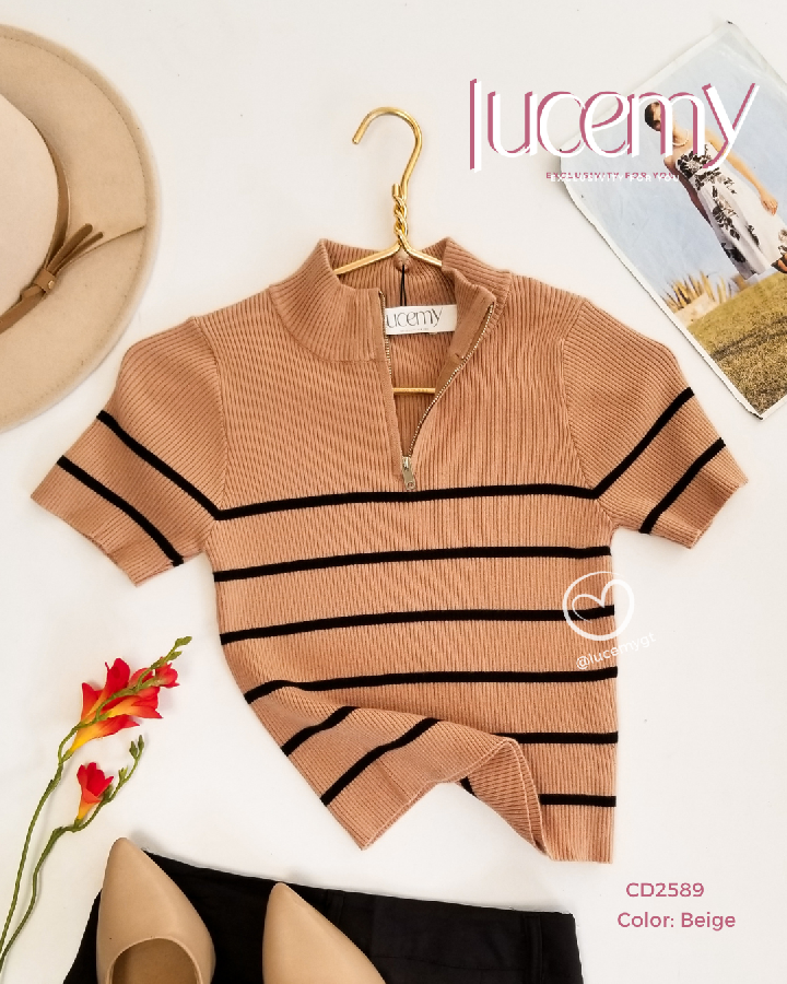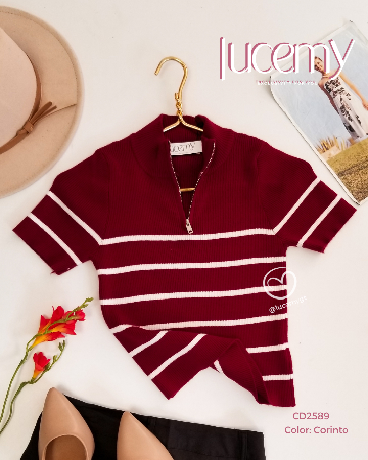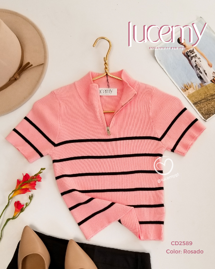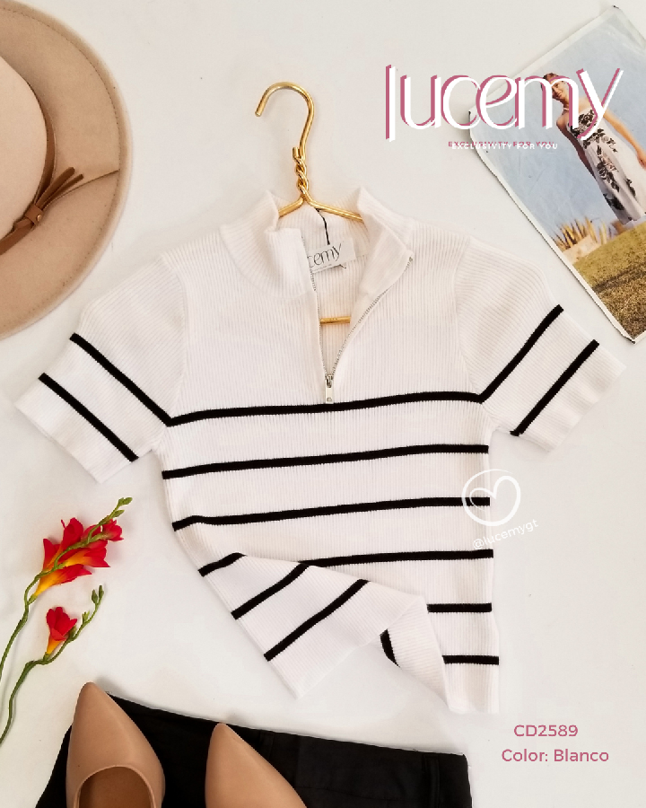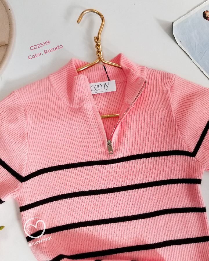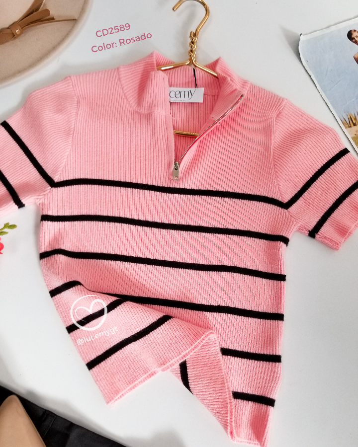 Descripción: Blusa de líneas, cuello medio alto con cremallera, manga corta.