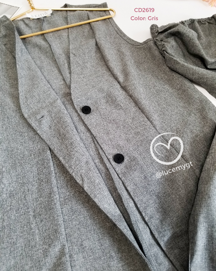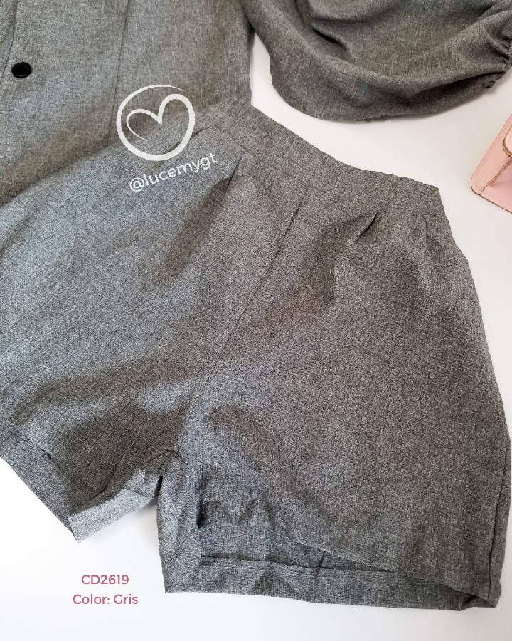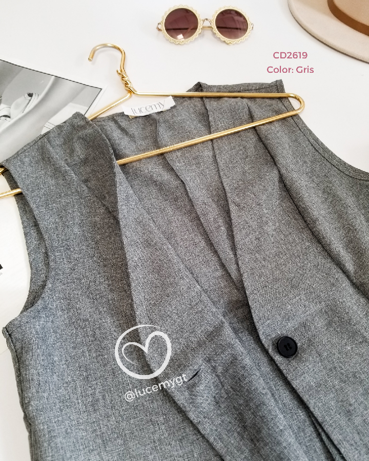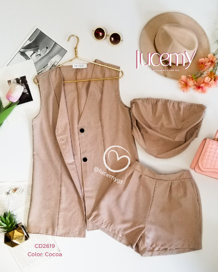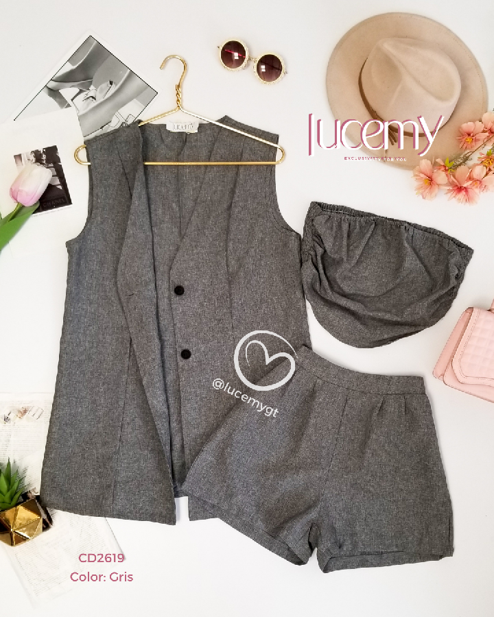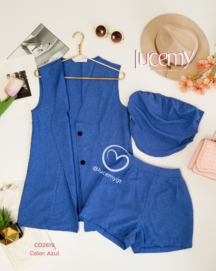 Descripción: Bello conjunto de 3 piezas, chaleco maxi con botones en la parte de enfrente, blusa crop top, fruncida en la parte de atrás, short con elástico en la parte de atrás bolsillos a los lados.