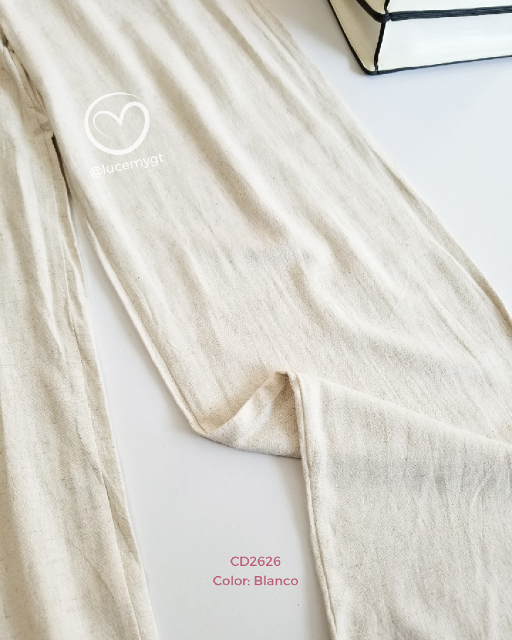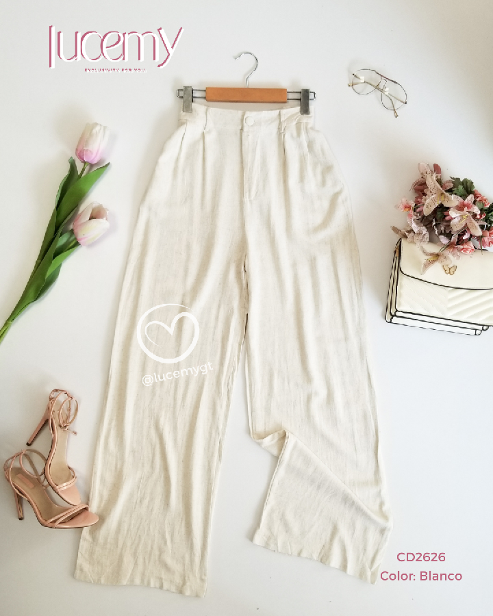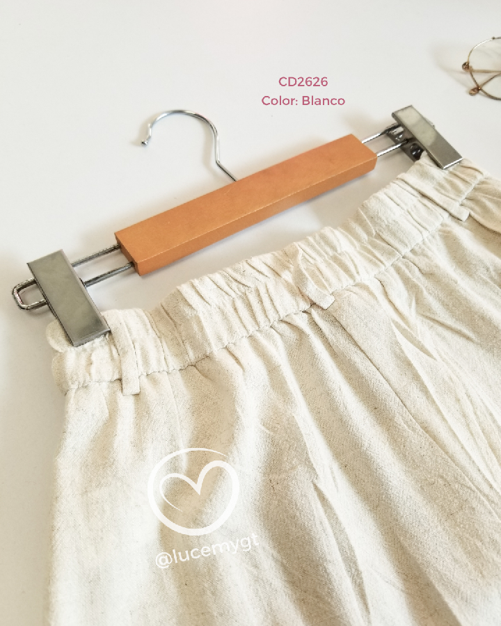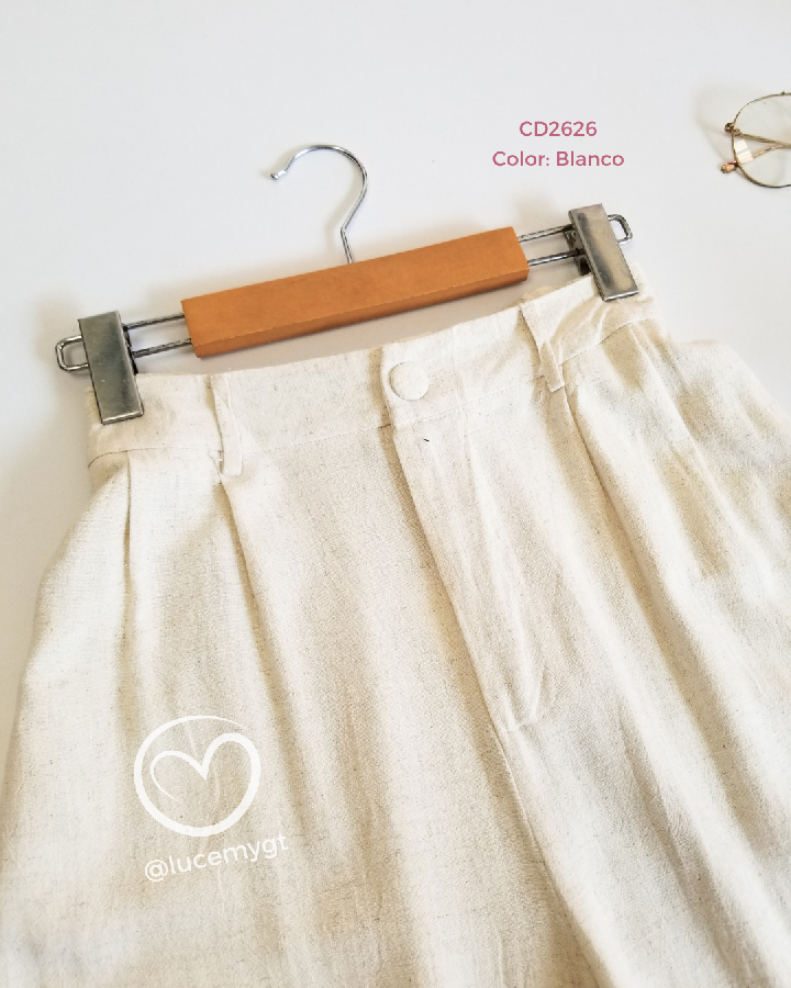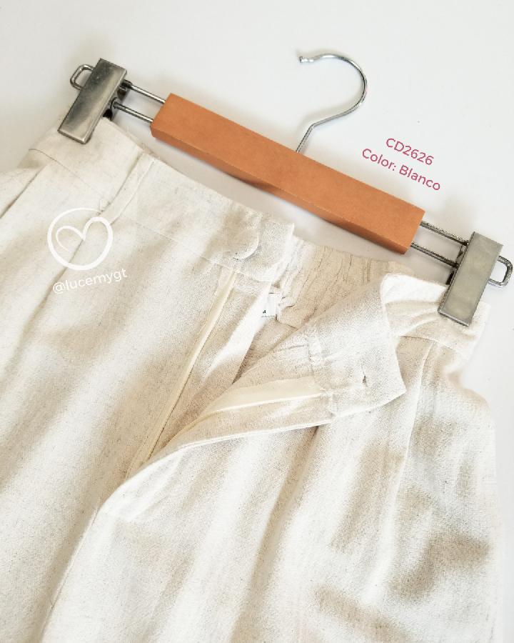 Descripción: Pantalón casual, cintura alta, botón forrado de la misma tela, bolsillos a los lados.