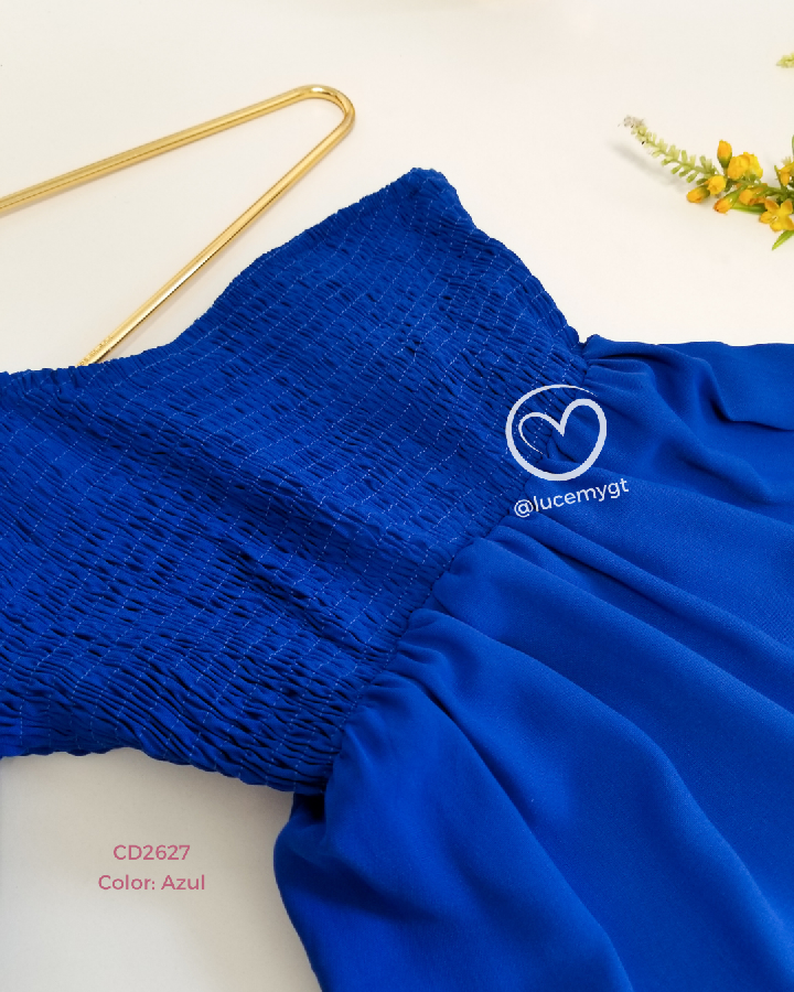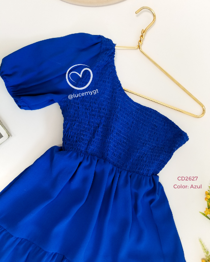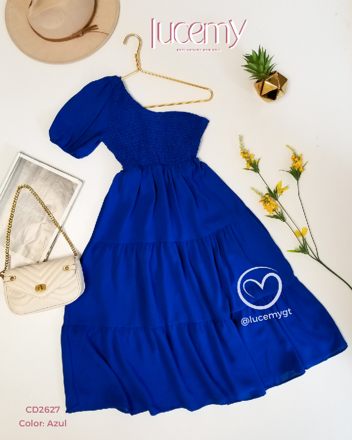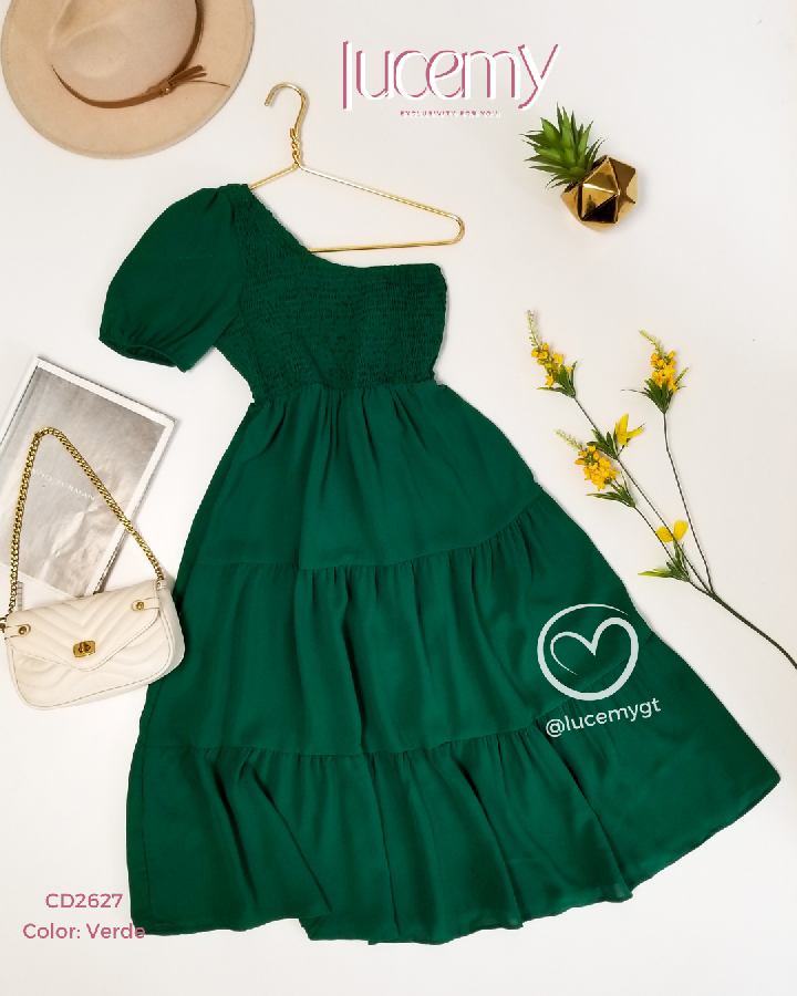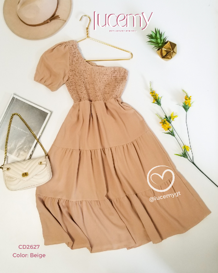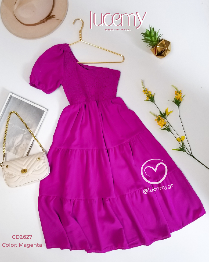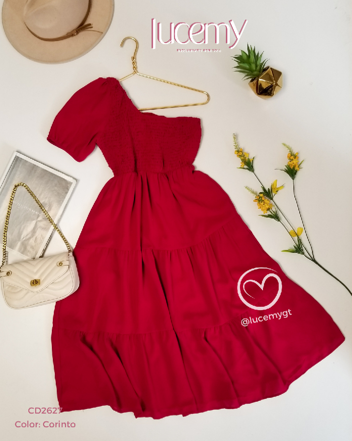 Descripción: Vestido asimétrico, fruncido en la parte de arriba, en la parte de abajo cuenta con tres tiempos.