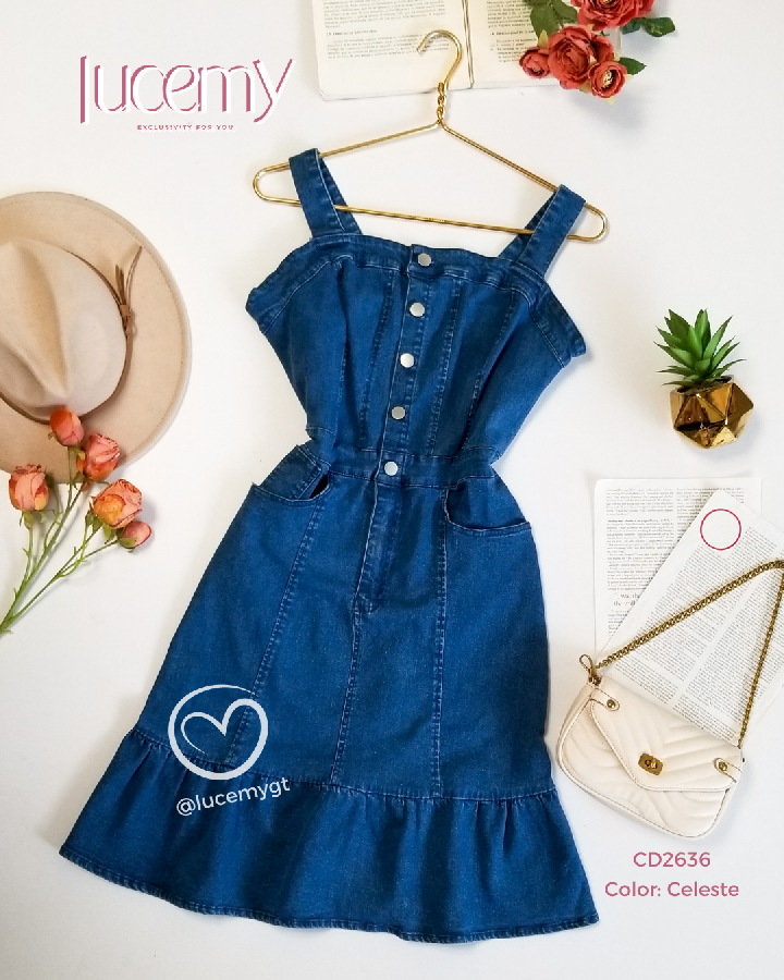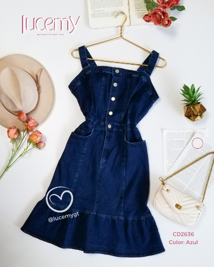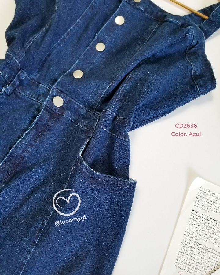 Descripción: Vestido Overol, tirantes ajustables, botones en la parte de enfrente y cremallera, bolsas a los lados.