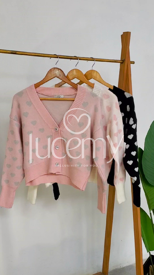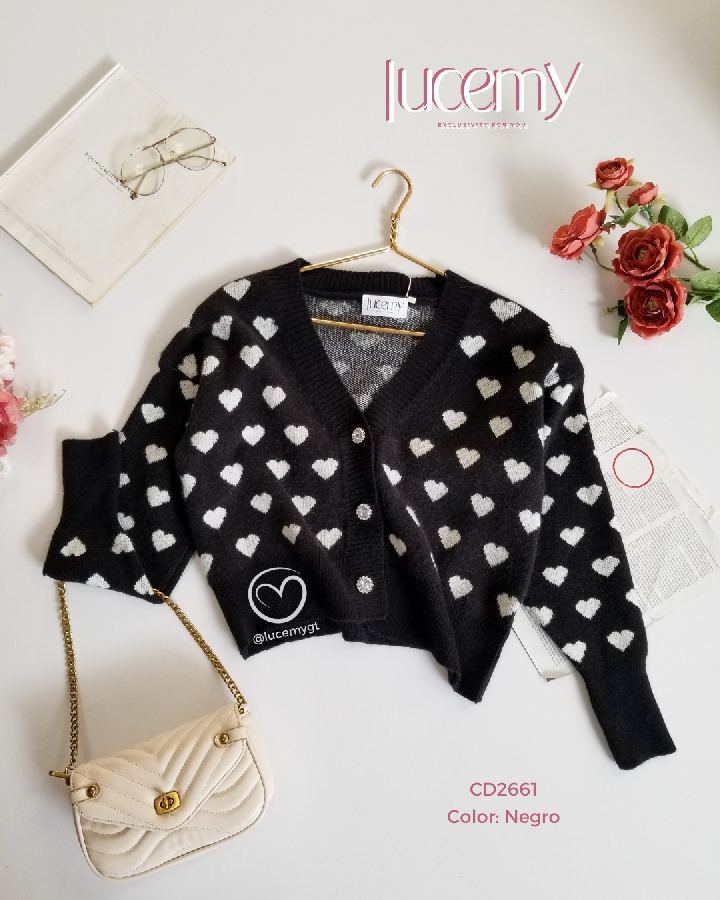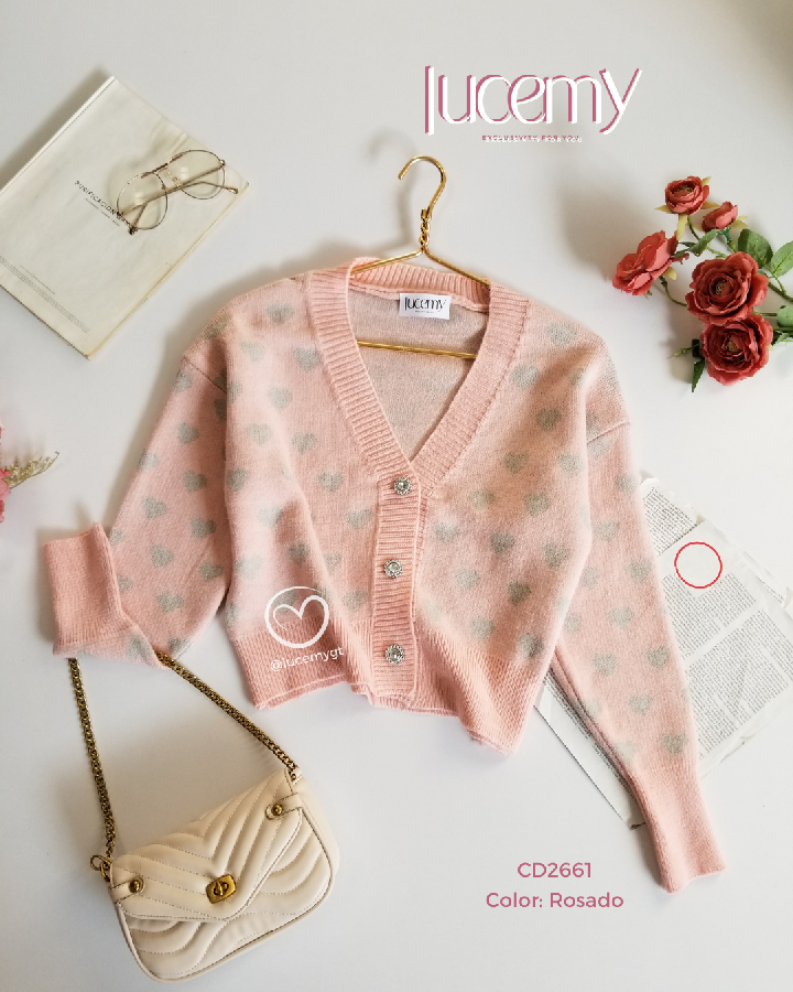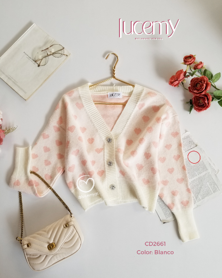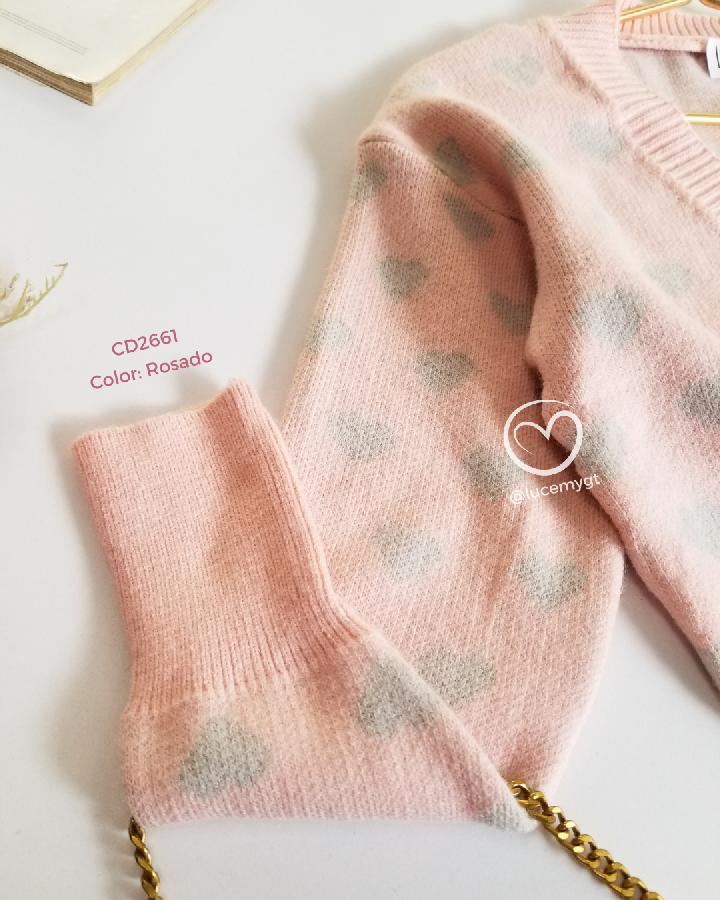 Descripción: Suéter corazón, escote v, botones en la parte de enfrente, manga larga