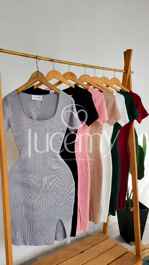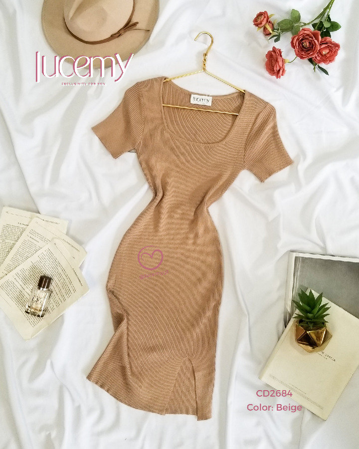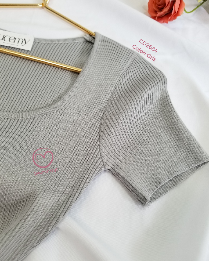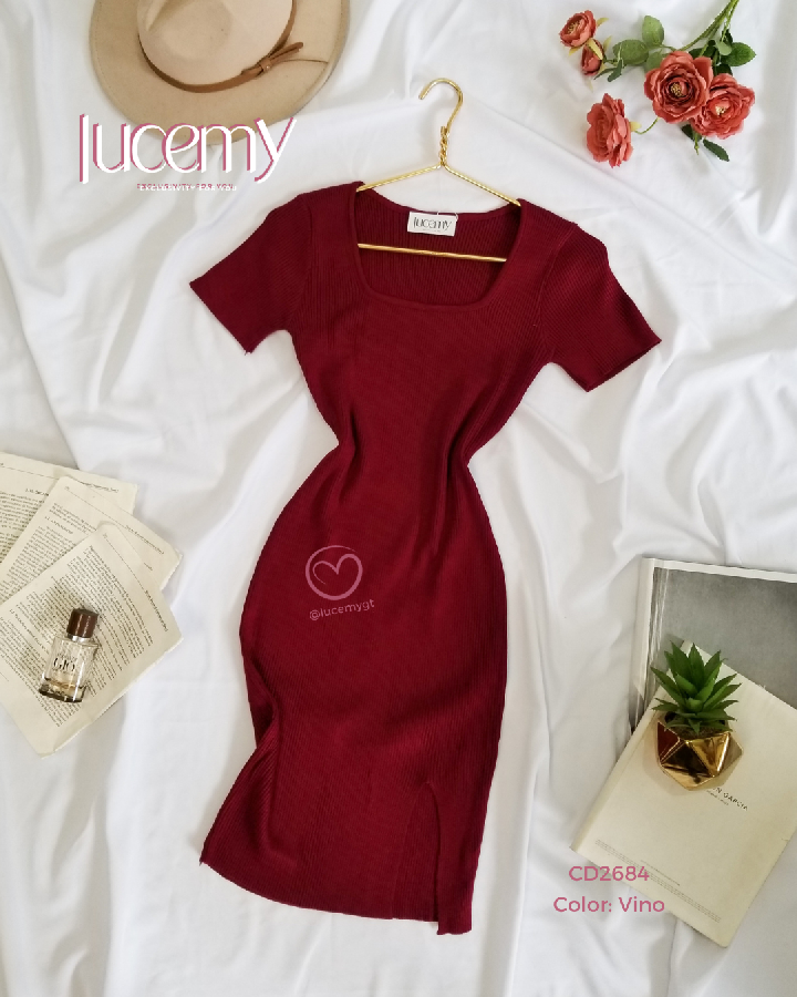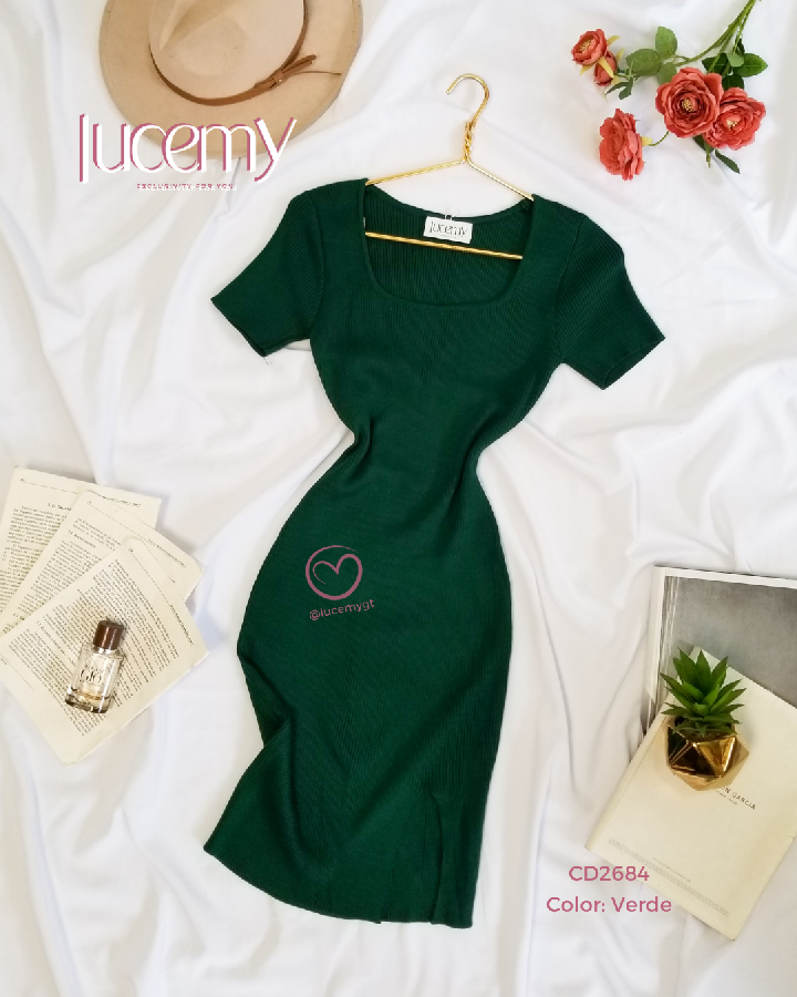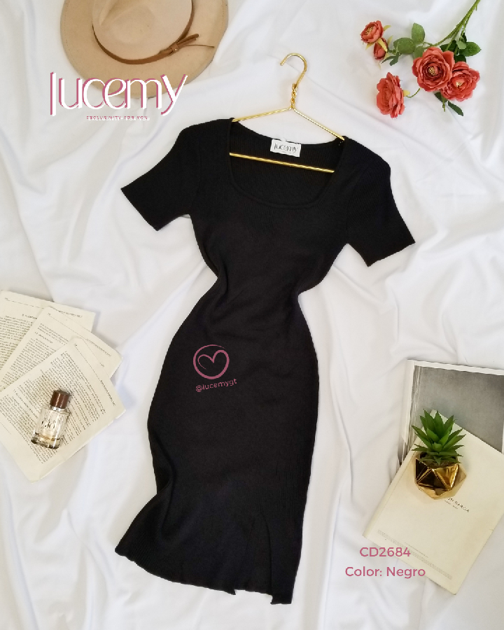 Descripción: Vestido tallado, escote cuadrado, manga corta, textura canalada, muy estreche.