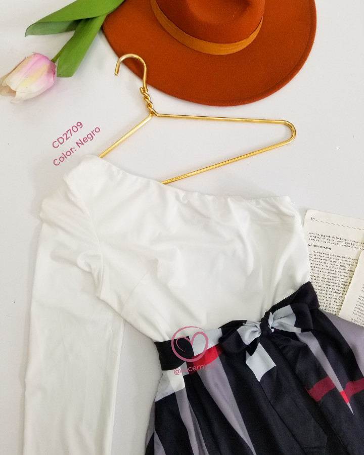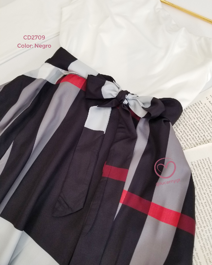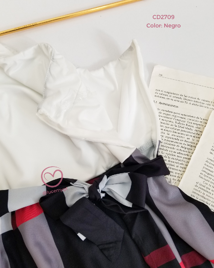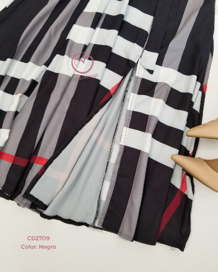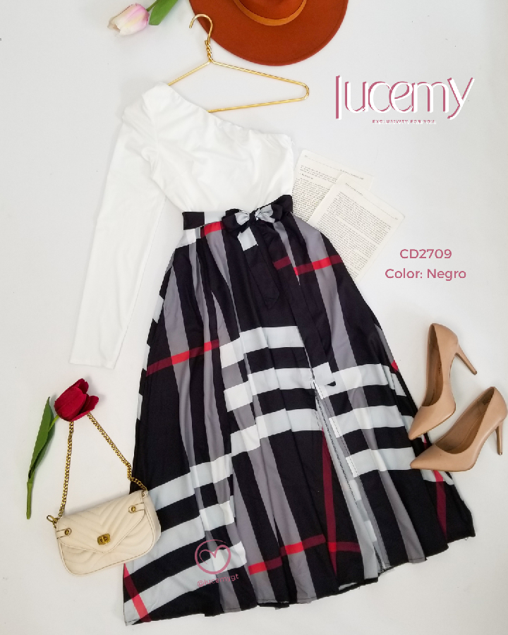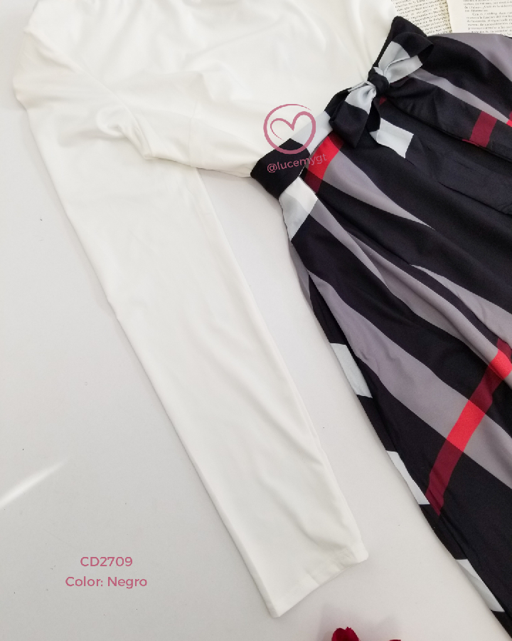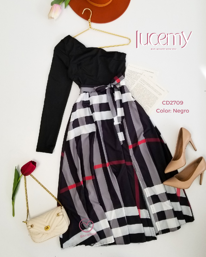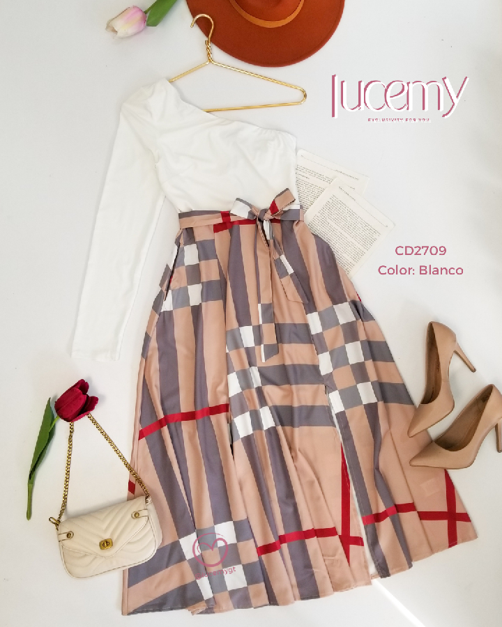 Descripción: Vestido Cuadros, escote asimétrico, sin manda de un lado y el otro lado manga larga, cremallera de lado, y bolsillos a los lados.