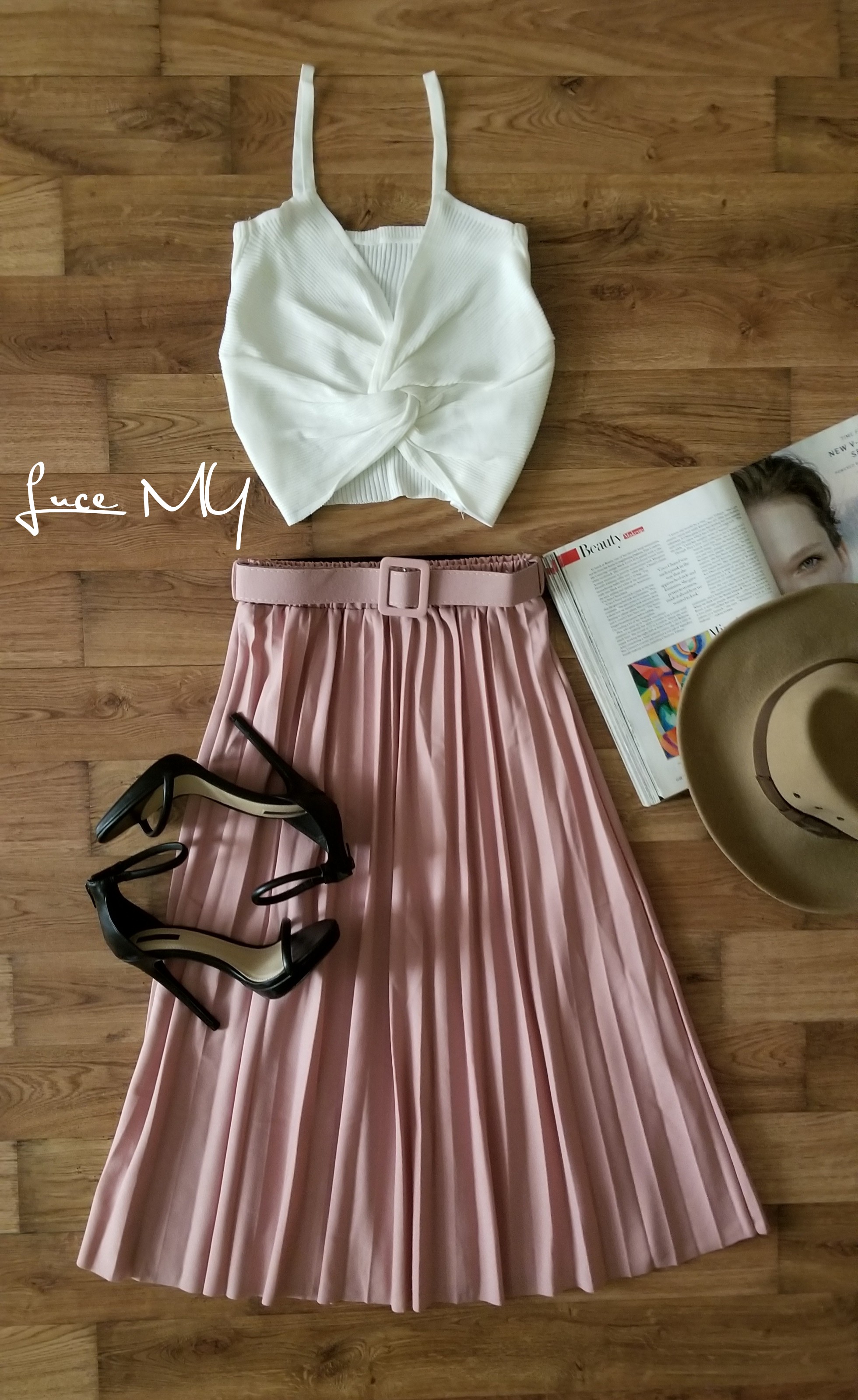 Descripción: Blusa top crop de nudo en frente y falda plisada
