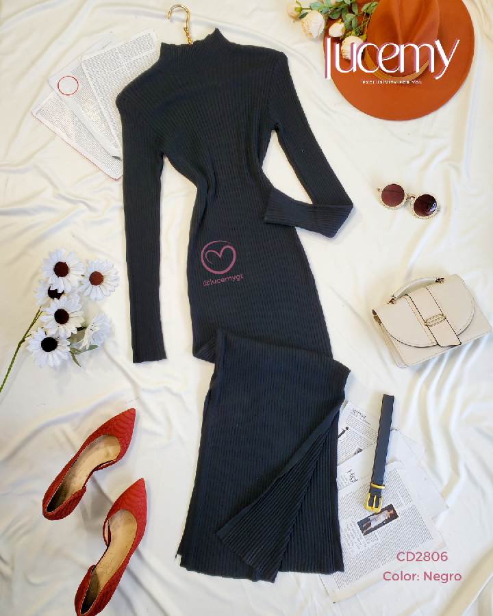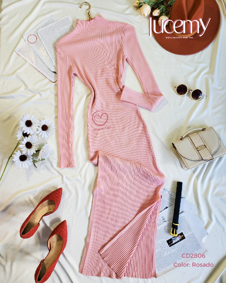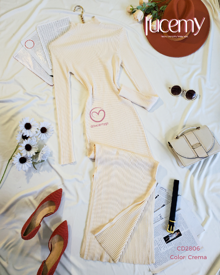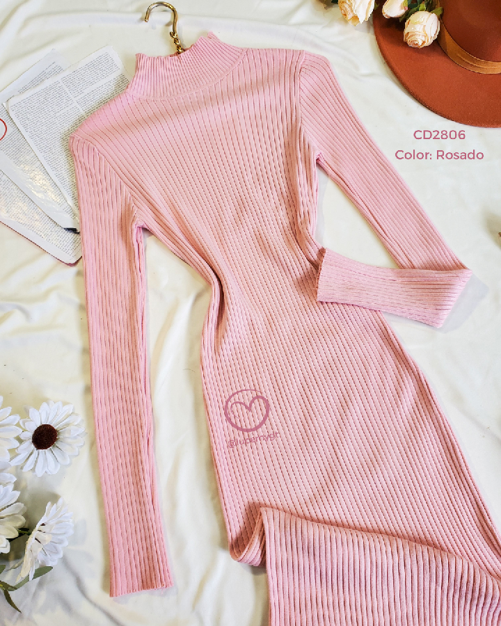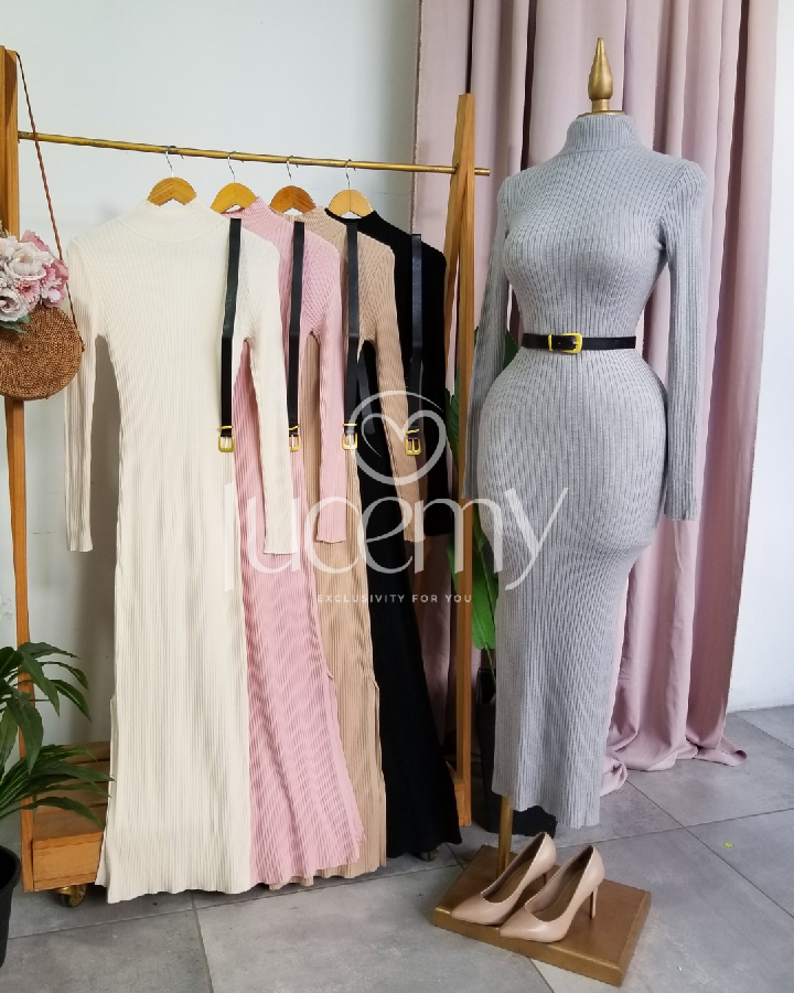 Descripción: Maxi Vestido, cuello alto, manga larga, textura canalada, incluye cincho.