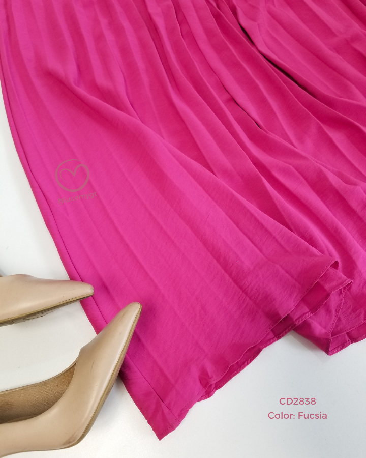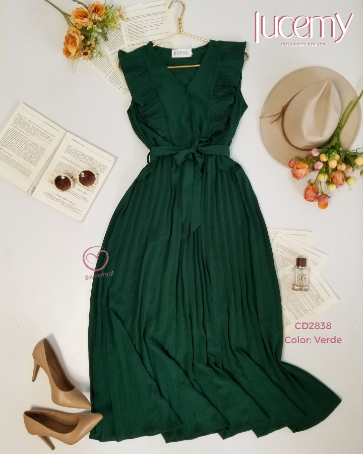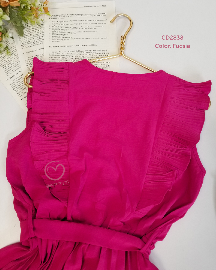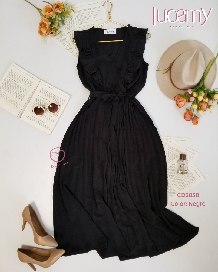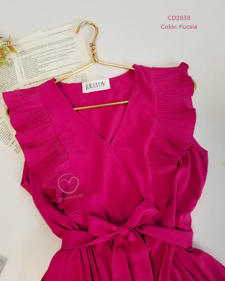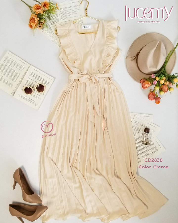 Descripción: Vestido plisado, cuello V, sin mangas con vuelitos, elástico en la cintura.