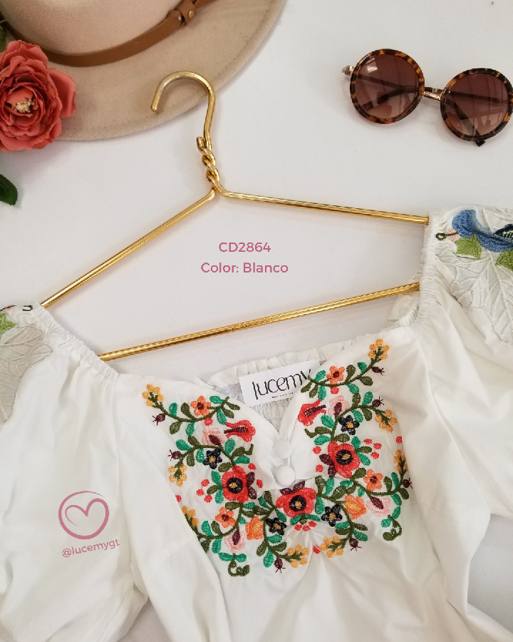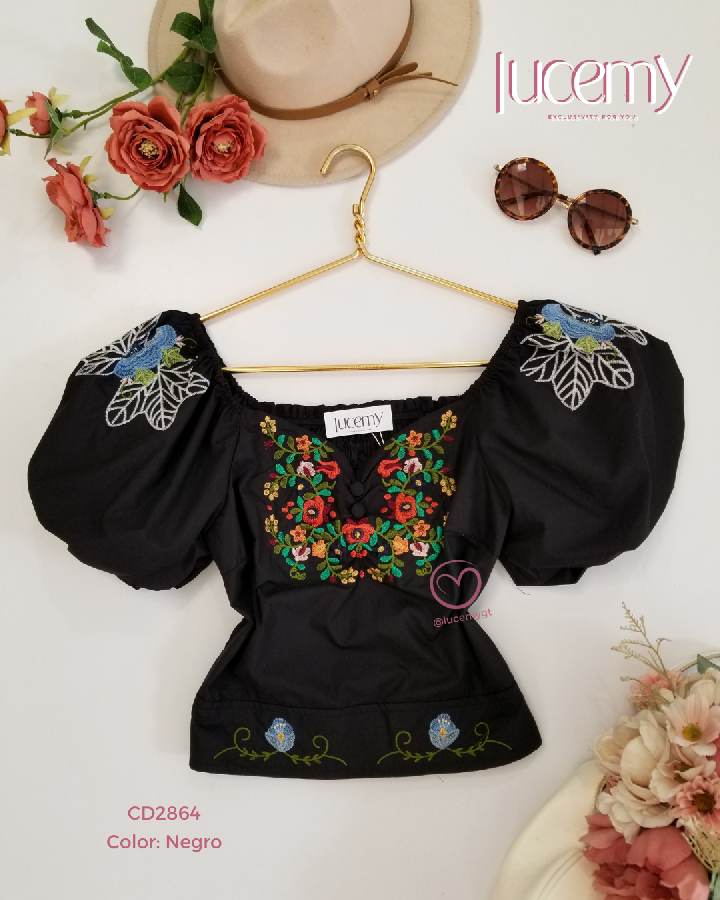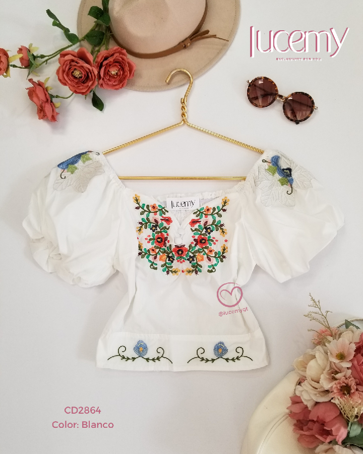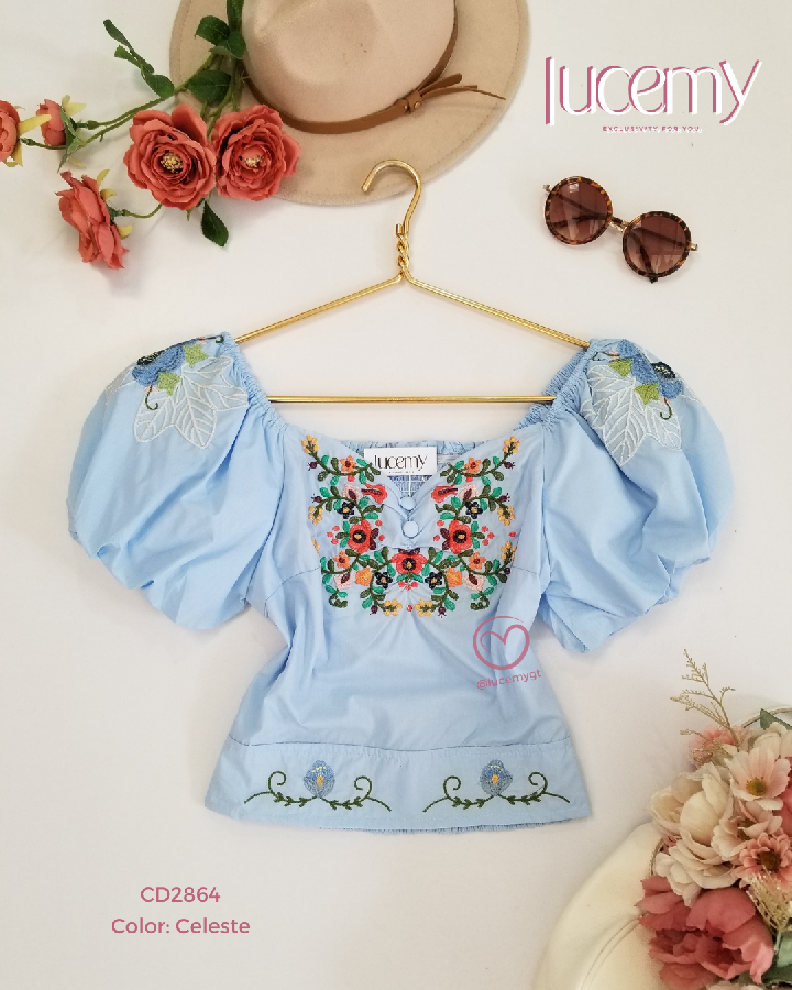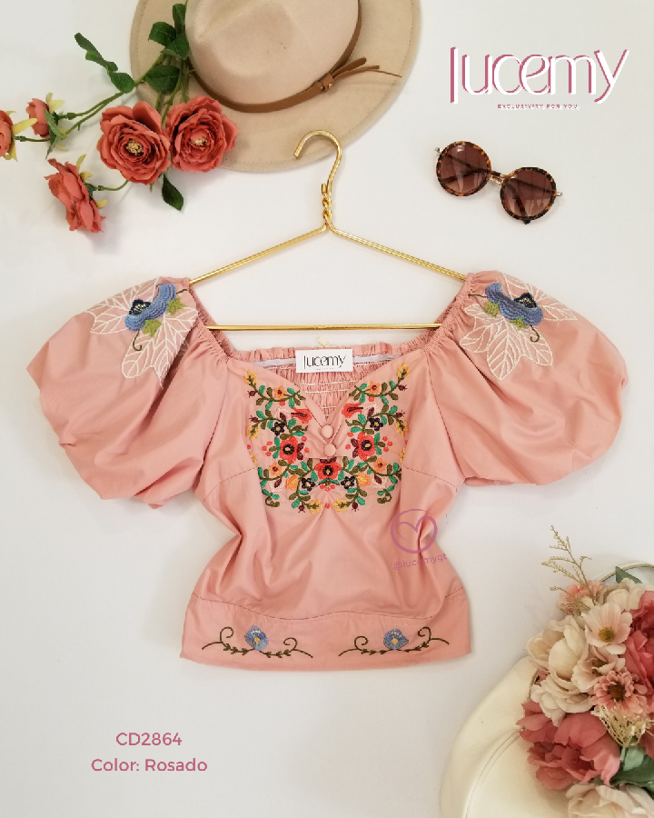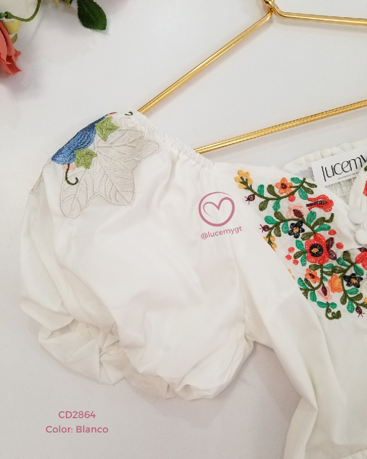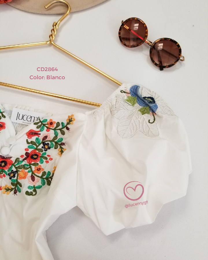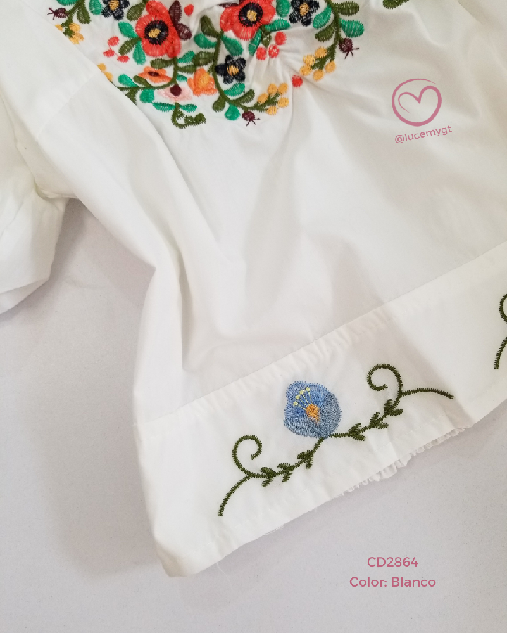 Descripción: Blusa bordada, escote corazón con botones forrados de la misma tela, mangas abochanada, fruncida en la parte de atrás.