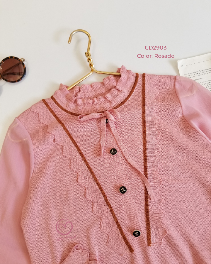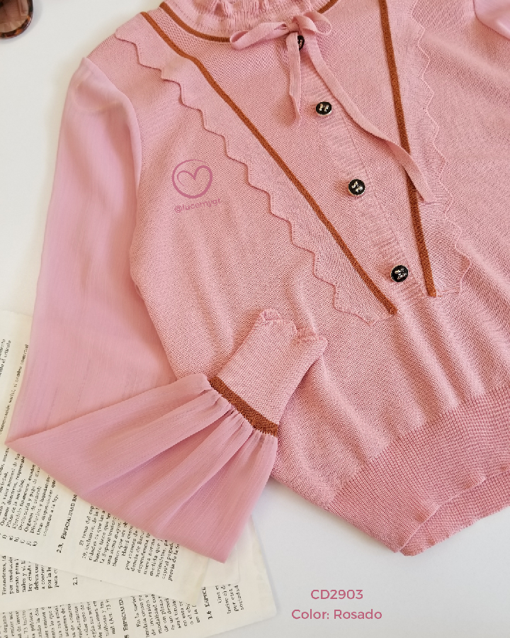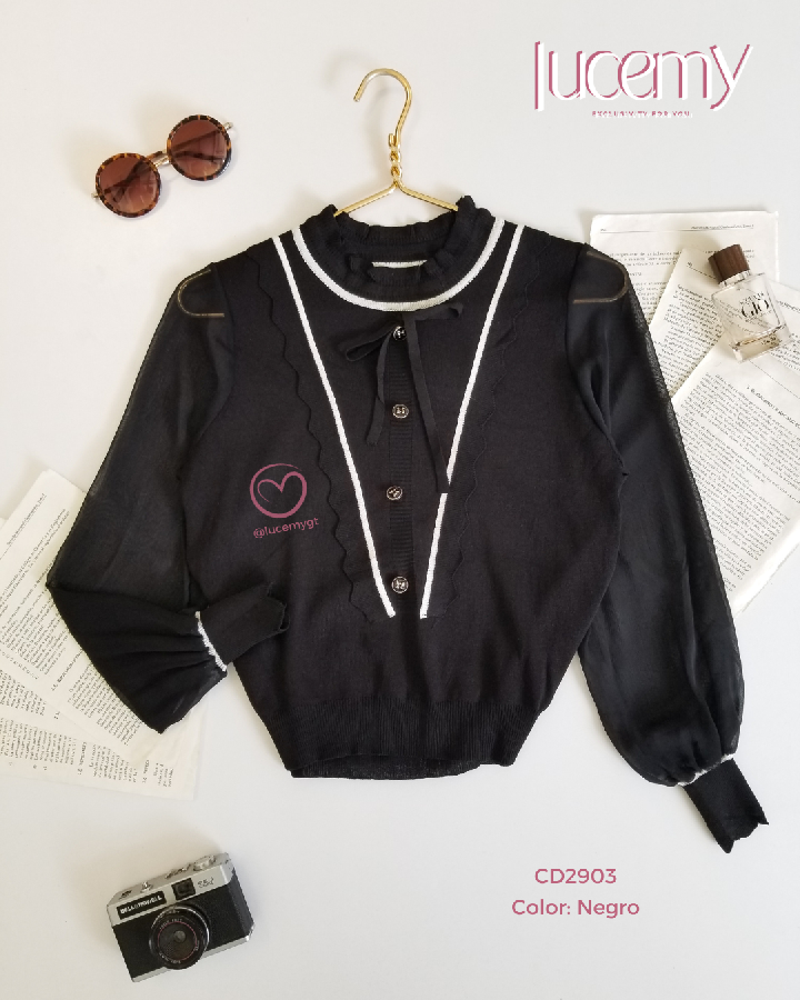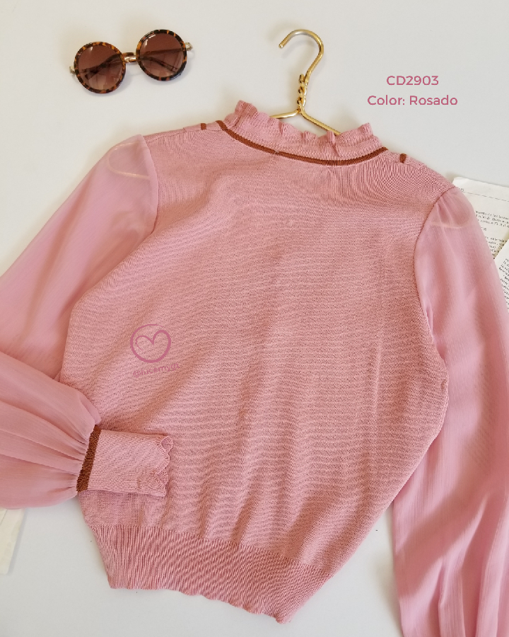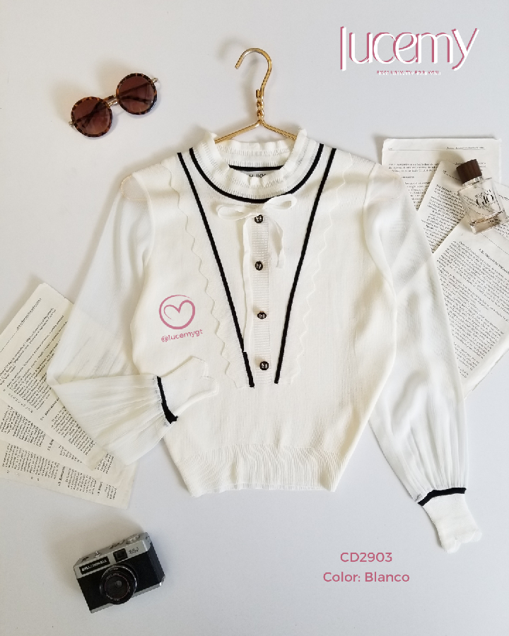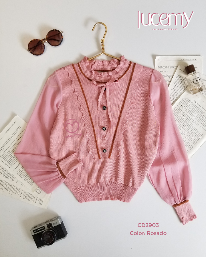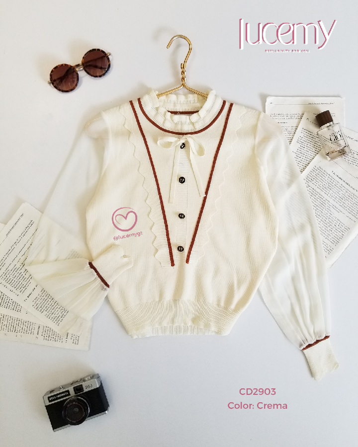 Descripción: Blusa vintage, estilo coqueto, es manga larga de chiffon, cuellito plisado, con botones, agujeta en el cuello.
