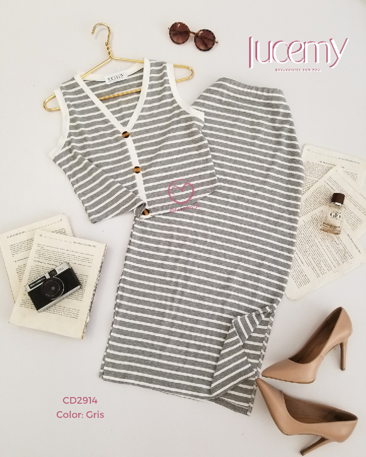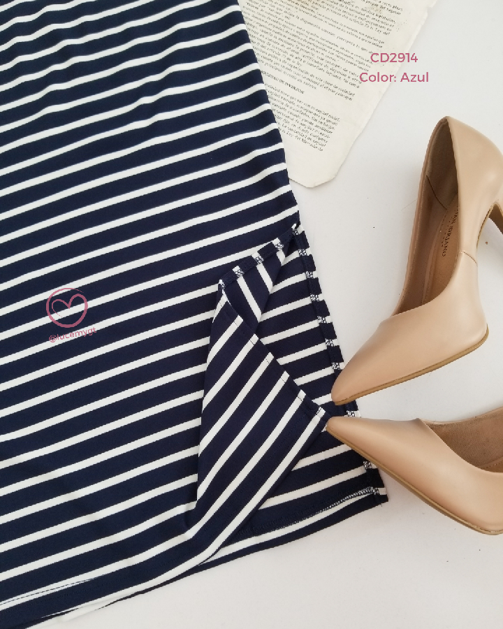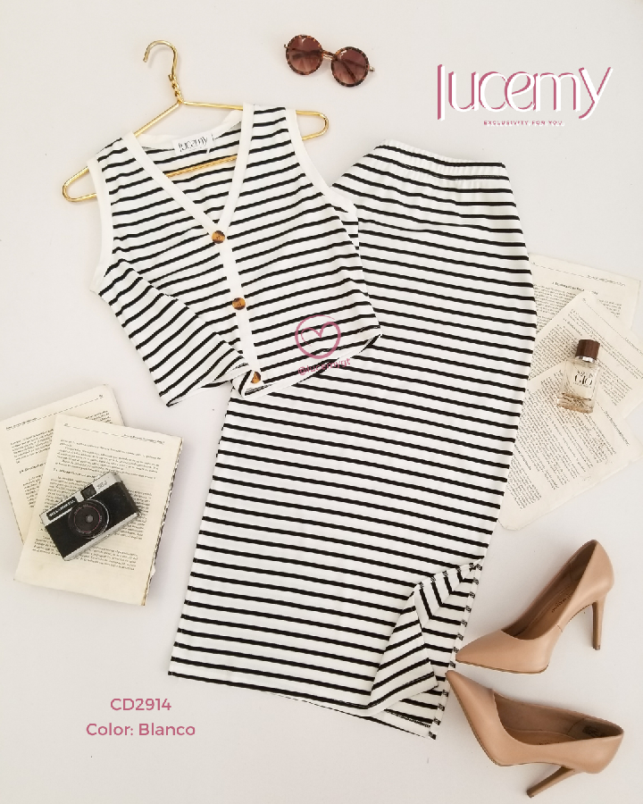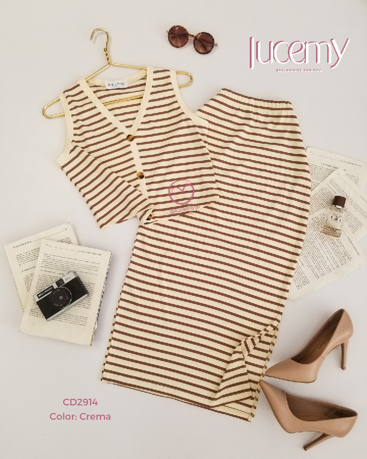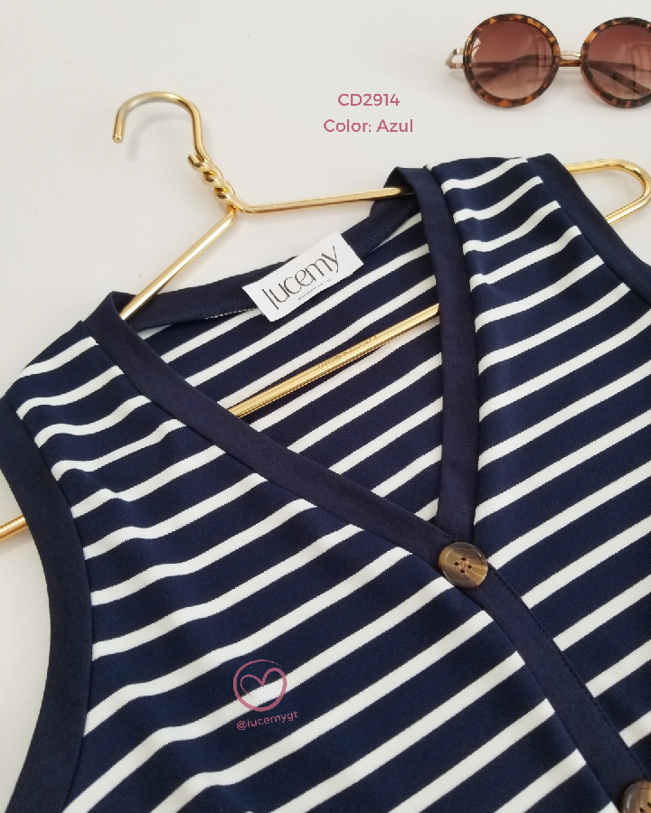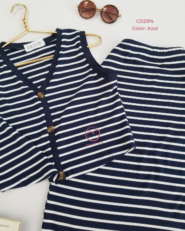 Descripción: Blusa sin mangas, cuello V, botones en la parte de enfrente, la falda de líneas tela estreche muy cómoda y hermosa