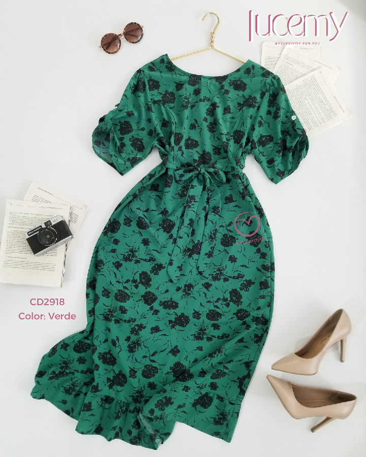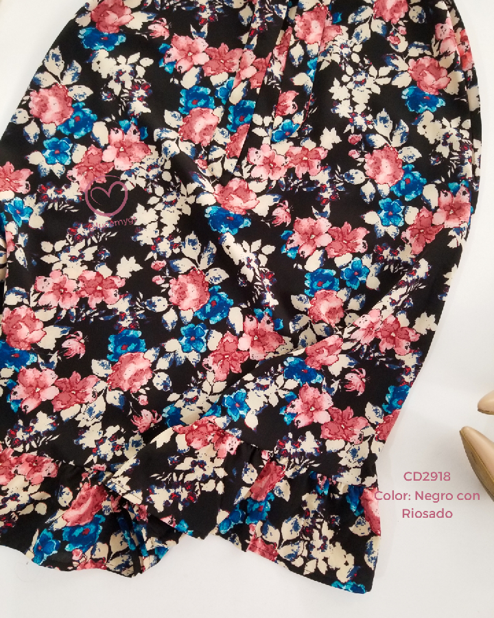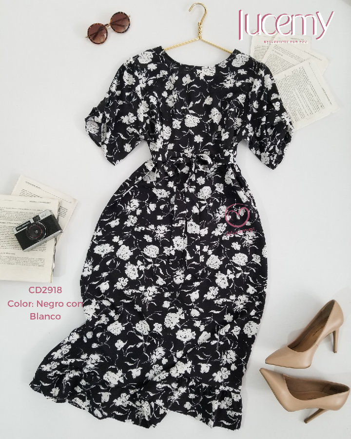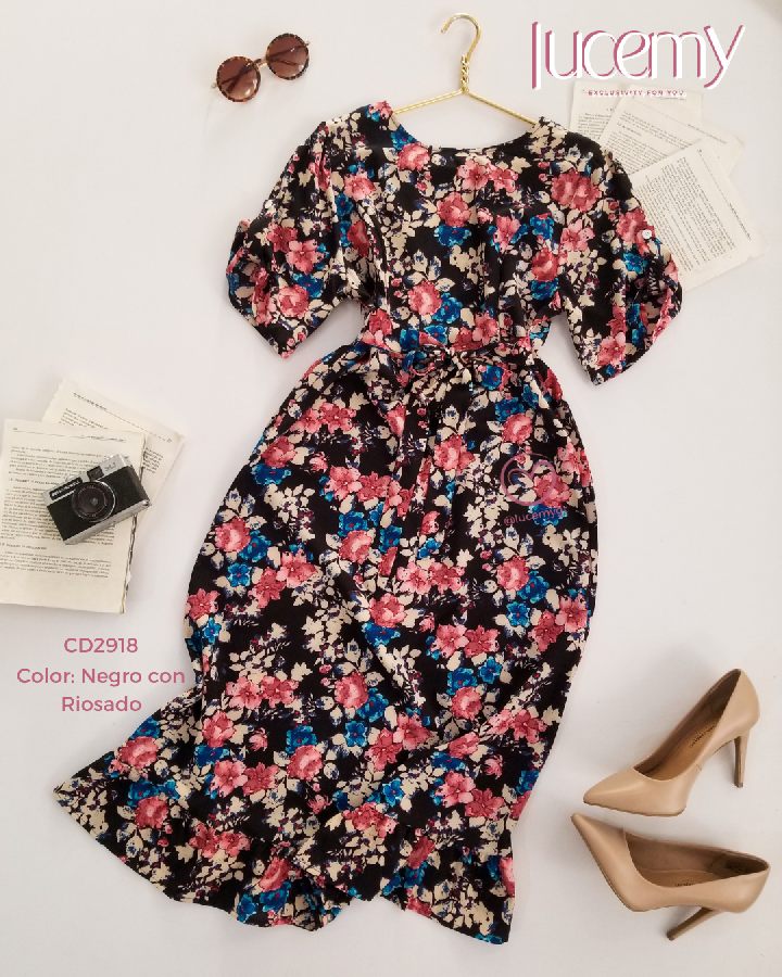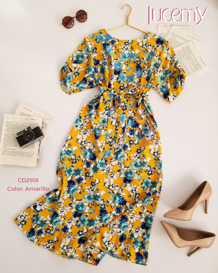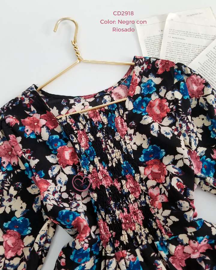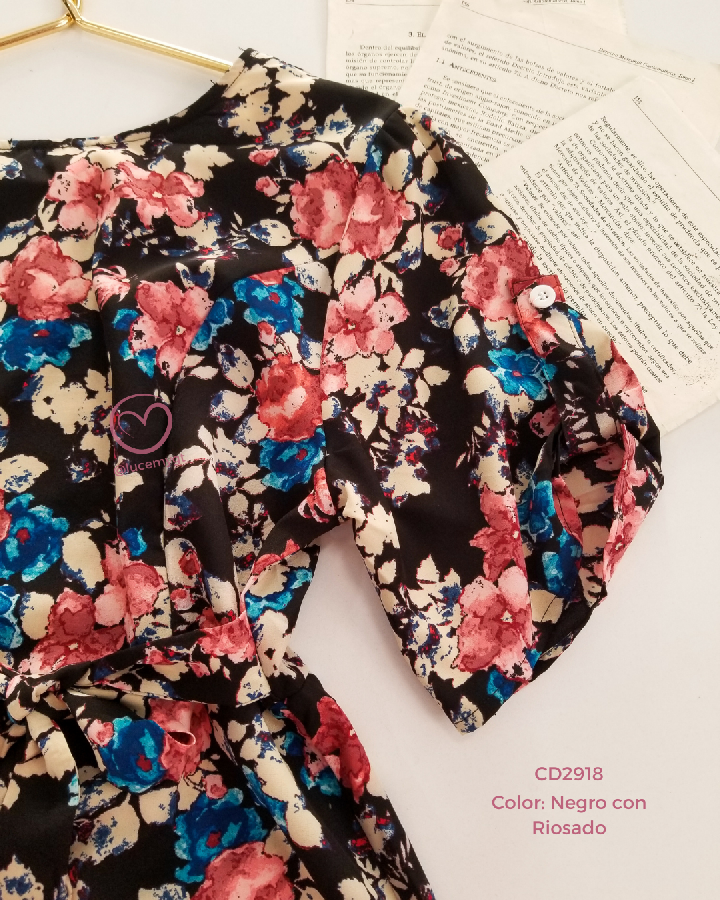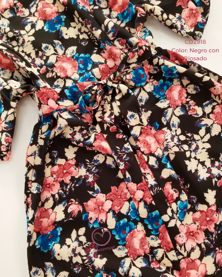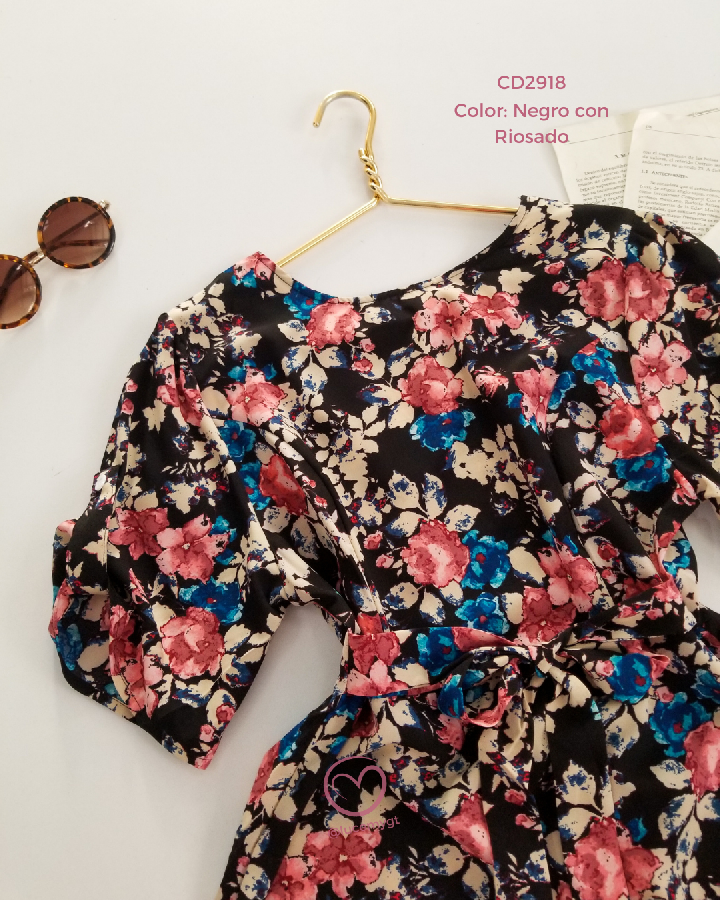 Descripción: Vestido floral, escote redondo, manga corta, fruncida en la parte de atras, incluye su agujeta.
